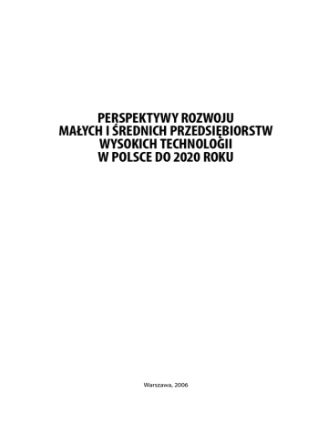 Perspektywy rozwoju małych i średnich przedsiębiorstw wysokich technologii w Polsce do 2020 roku Warszawa, 2006 Pod redakcją: dr Elżbieta Wojnicka Wyższa Szkoła Informatyki i Zarządzania w Rzeszowie Piotr Klimczak Wyższa Szkoła Informatyki i Zarządzania w Rzeszowie Magdalena Wojnicka Politechnika Gdańska Jakub Dąbkowski Project Evolution Sp. z o.o. Współpraca: Weronika Podsiadła © Copyright by Polska Agencja Rozwoju Przedsiębiorczości, Warszawa 2006 Publikacja współfinansowana ze środków Komisji Europejskiej ISBN 83-60009-30-9 Wydanie I Nakład 500 Przygotowanie do druku, druk i oprawa: Marlex Sp. z o.o. SPIS TREŚCI Wstęp.....................................................................................................................................5 1. Definicja sektora high-tech (Elżbieta Wojnicka)...........................................................7 1.1. Metoda dziedzinowa...........................................................................................................................7 1.2. Metoda produktowa......................................................................................................................... 11 1.3. Definicja horyzontalna..................................................................................................................... 13 1.4. Wiedzochłonne usługi biznesowe............................................................................................... 16 2. Kierunki transformacji sektora high-tech (E.Wojnicka, J.Dąbkowski, M.Wojnicka, P.Klimczak)..................................................21 2.1. Kierunki rozwoju podstawowych dziedzin high-tech (Elżbieta Wojnicka, Piotr Klimczak).............................................................................................. 26 2.2. Wysokotechnologiczne produkty przyszłości (Jakub Dąbkowski).................................. 30 2.3. Nowoczesne technologie w branżach tradycyjnych – budownictwo (Magdalena Wojnicka)...................................................................................................................... 33 2.3.1. Nowe technologie w budownictwie światowym . ................................................... 33 2.3.2. Nowe technologie w budownictwie polskim . .......................................................... 36 3. Uwarunkowania rozwoju wysokich technologii (Elżbieta Wojnicka)........................39 3.1. Wysokie technologie a innowacyjność...................................................................................... 39 3.2. Wysokie technologie a nauka....................................................................................................... 42 3.3. Klastering.............................................................................................................................................. 48 3.3.1. Innowacyjne klastry jako lokalne systemy innowacyjne........................................ 50 3.3.2. Dolina Krzemowa.................................................................................................................. 53 3.3.3. Technopolie: Austin i Cambridge.................................................................................... 55 3.3.4. Leuven – high-tech na starówce...................................................................................... 55 3.3.5. Telecom City w Szwecji....................................................................................................... 57 3.3.6. Rozwój klastrów biotechnologicznych w Brandenburgii....................................... 59 3.3.7. Mikroelektronika na Florydzie.......................................................................................... 61 3.4. Polityka technologiczna Japonii ................................................................................................. 63 3.5. Infrastruktura wsparcia wysokich technologii........................................................................ 68 3.6. Czynniki rozwoju nowych firm technologicznych................................................................. 75 4. Zakres i dynamika sektora high-tech (E. Wojnicka, P. Klimczak)...............................77 4.1. Działalność badawcza przedsiębiorstw w Polsce (E. Wojnicka)........................................ 77 4.2. Produkcja, zatrudnienie i handel sektora high-tech w Polsce (E. Wojnicka)................ 94 4.3. Rozmieszczenie przemysłów i usług wysoko technologicznych w Polsce (E. Wojnicka)......................................................................................................................................... 99 4.4. Przedsiębiorstwa wysokiej technologii w Polsce (E. Wojnicka, P. Klimczak)...............104 4.4.1. Przemysł high-tech ............................................................................................................104 4.4.2. Wiedzochłonne usługi biznesowe................................................................................121 5. Problemy rozwoju wybranych branż high-tech w Polsce (E.Wojnicka, P.Klimczak, M.Wojnicka)........................................................................127 5.1. ICT – elektronika, telekomunikacja, IT i automatyka przemysłowa (Elżbieta Wojnicka, Piotr Klimczak)............................................................................................127 5.1.1. Elektronika . ..........................................................................................................................127 5.1.2. IT – technologie informacyjne........................................................................................133 5.1.3. Sektor telekomunikacyjny...............................................................................................139 5.1.4. Automatyka przemysłowa...............................................................................................142 5.2. Farmacja i biotechnologia (P. Klimczak, E. Wojnicka).............