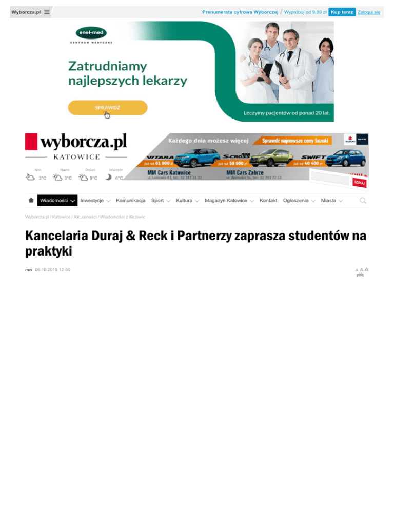 Wyborcza.pl Noc 3°C Prenumerata cyfrowa Wyborczej Rano 3°C Wiadomości Dzień 9°C Inwestycje / Wypróbuj od 9,99 zł Kup teraz Zaloguj się Wieczór 6°C Komunikacja SZUKAJ Sport Kultura Magazyn Katowice Kontakt Ogłoszenia Miasta Wyborcza.pl / Katowice / Aktualności / Wiadomości z Katowic Kancelaria Duraj & Reck i Partnerzy zaprasza studentów na praktyki m n 06.10.2015 12:50 A A A NAJCZĘŚCIEJ CZYTANE 1 Supersam w Katowicach. Prezydent: "To się wpisze w historię naszego miasta" 2 Wybory parlamentarne 2015. Poseł w Sejmie ma pracować. Ta dziesiątka 3 Żadne miasto nie wygląda tak pięknie jak Katowice na wizualizacjach 4 Nie udało się tu Magdzie Gessler, nie udało się następcom. Lokal na przetarg 5 Okulistyka na Ceglanej. W szpitalu zapanował strach REKLAMA Wydział Prawa i Administracji UŚ (ANNA LEWAŃSKA) Renomowana kancelaria adwokacka Duraj & Reck i Partnerzy z Katowic przyjmie studentów prawa na płatne praktyki, absolwenci mogą się ubiegać o odbycie aplikacji u boku doświadczonych adwokatów i radców prawnych. Artykuł otwarty w ramach bezpłatnego limitu prenumeraty cyfrowej To druga edycja akcji pod hasłem "Zostań mecenasem". Katowicka kancelaria Duraj & Reck i Partnerzy, organizator przedsięwzięcia, znów zdecydowała zaprosić w swoje progi młodych ludzi. Swoją kandydaturę można rejestrować na stronie www.zostanmecenasem.pl Cztery kroki do celu Studenci czwartego bądź piątego roku prawa mogą ubiegać się o 3-miesięczne płatne praktyki. Proces podzielono na cztery części. Pierwszy to wspomniana już rejestracja. W drugim kandydat zmierzy się z przygotowanym przez kancelarię casusem. - Na rozwiązanie zadania kandydaci będą mieli określony czas. Zachęcam jednak do tego, by nie zwracać na niego szczególnej uwagi. Ważniejszy w ocenie będzie bowiem tok rozumowania danego kandydata - zapowiada Tomasz Duraj, partner z Kancelarii Duraj & Reck i Partnerzy. Dodaje, że dziesięciu studentów, których prace zostaną najwyżej ocenione, przejdzie test wiedzy (trzeci krok). Czwartym jest już rozmowa kwalifikacyjna. Trójka studentów, który wypadną na niej najlepiej, odbędzie w kancelarii płatną praktykę. REKLAMA POLECAMY 100 absolwenckich punktów Podobną drogę muszą pokonać świeżo upieczeni absolwenci prawa. Różnica jest jedna: nie muszą rozwiązywać casusu przygotowanego przez przedstawicieli Rój pszczół zaatakował w centrum Katowic. Obsiadły samochód [WIDEO] kancelarii. Zamiast tego w ramach drugiego etapu (po wcześniejszej rejestracji) przedstawią wynik z egzaminu adwokackiego lub radcowskiego. - Wymogiem jest rezultat na poziomie co najmniej 100 punktów. Jeśli kandydat spełni to kryterium, będzie mógł w następnym etapie zmierzyć się z casusem, który wylosuje na platformie. Na tej podstawie wyłonimy kandydatów, których zaprosimy na rozmowę - mówi Tomasz Duraj. Jacht, deska, a może kajak? Gdzie w regionie można uprawiać sporty wodne POLUB Projekt "Zostań mecenasem" potrwa do 31 października. Zabytkowa katowicka kamienica zyskała szklany dach i atrium [ZDJĘCIA i WIDEO] Artykuł otwarty w ramach bezpłatnego limitu Wypróbuj specjalny pakiet: tylko 9,99 zł za pierwszy miesiąc Nieograniczony dostęp do serwisów Wyborcza.pl, Wyborcza.biz, wysokieobcasy.pl i BIQdata.pl Wszystkie magazyny Wyborczej (m.in. Duży Format, Wysokie Obcasy, Magazyn Świąteczny, Ale Historia) Wypróbuj za 9,99 zł za miesiąc Zaloguj się / Informacje / Kontakt Skomentuj Podziel się ZOBACZ TAKŻE 150 lat Katowic. Adwokat uwięziony w listowej skrzynce [STARE WIDOKÓWKI] Niemcy porywali polskie dzieci. Po wojnie walczył o nie śląski prawnik Po okładce "Faktu" z 10-latką adwokat apeluje: Ministrze, wytocz proces 0 Podziel się Skomentuj Wyślij e-mailem Skomentuj: Skomentuj Zaloguj się REKLAMA AdTaily WYBORCZA.PL POLECA Kielce w Pracowni Miast. Znajdź z nami dobre rozwiązania dla miasta i mieszkańców Renata Dancewicz: Podoba mi się nasz chaos, ale łatwo nas nabrać. A Ty jak uważasz? NAKRĘĆ SIĘ NA WYBORY! Rosja próbuje odkręcić prawdę o pakcie Ribbentrop-Mołotow. I znajduje sojuszników na Zachodzie [DAVIES] TEMATY WAŻNE DLA KATOWIC Na skróty: Gazeta.pl Polecamy: Miasta Wiadomości Deser Copyright © Agora SA O nas Sport.pl Biznes Gazeta Wyborcza Wybory 2015 Program TV Pogoda Tematy Reklama w Gazecie Wyborczej Prywatność Praca Program TV Wideo Wyniki Lotto Wszystkie artykuły Licencje/Kontent Kontakt Poczta Newsletter Zgłoś błąd Pomoc Facebook RSS