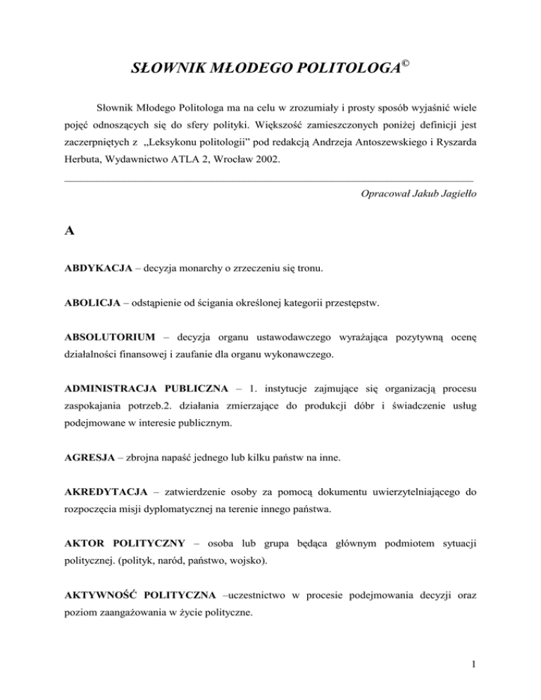 SŁOWNIK MŁODEGO POLITOLOGA© Słownik Młodego Politologa ma na celu w zrozumiały i prosty sposób wyjaśnić wiele pojęć odnoszących się do sfery polityki. Większość zamieszczonych poniŜej definicji jest zaczerpniętych z „Leksykonu politologii” pod redakcją Andrzeja Antoszewskiego i Ryszarda Herbuta, Wydawnictwo ATLA 2, Wrocław 2002. ___________________________________________________________________________ Opracował Jakub Jagiełło A ABDYKACJA – decyzja monarchy o zrzeczeniu się tronu. ABOLICJA – odstąpienie od ścigania określonej kategorii przestępstw. ABSOLUTORIUM – decyzja organu ustawodawczego wyraŜająca pozytywną ocenę działalności finansowej i zaufanie dla organu wykonawczego. ADMINISTRACJA PUBLICZNA – 1. instytucje zajmujące się organizacją procesu zaspokajania potrzeb.2. działania zmierzające do produkcji dóbr i świadczenie usług podejmowane w interesie publicznym. AGRESJA – zbrojna napaść jednego lub kilku państw na inne. AKREDYTACJA – zatwierdzenie osoby za pomocą dokumentu uwierzytelniającego do rozpoczęcia misji dyplomatycznej na terenie innego państwa. AKTOR POLITYCZNY – osoba lub grupa będąca głównym podmiotem sytuacji politycznej. (polityk, naród, państwo, wojsko). AKTYWNOŚĆ POLITYCZNA –uczestnictwo w procesie podejmowania decyzji oraz poziom zaangaŜowania w Ŝycie polityczne. 1 AMBASADOR – najwyŜszy rangą przedstawiciel dyplomatyczny państwa wysyłającego w państwie pobytu. AMNESTIA – całkowite lub częściowe darowanie kary za popełnione przestępstwo. ANARCHIZM – doktryna społeczno-polityczna powstała w XIX w. głosząca likwidację państwa i własności prywatnej, zapewnienia wolności. APARAT PAŃSTWOWY – zbór organów państwowych i obsługujących ich urzędów słuŜących centralnemu ośrodkowi decyzji politycznej do prowadzenia bieŜącej polityki państwa APERTHEID – polityka rasistowska prowadzona w RPA do 1991r. mająca na celu oddzielenie białej mniejszości od kolorowej większości. APOLITYCZNOŚĆ – zachowanie polegające na oddzieleniu się od polityki, walce z nią lub jej odrzucenia. ARYSTOKRACJA – model rządów w której władzę sprawuje niewielka grupa uprzywilejowanych ludzi najbardziej godnych do jej wykonywania. AUTONOMIA REGIONALNA – uznanie przez państwo kompetencji wspólnot społecznych zamieszkujących określony obszar oraz ich organów do podejmowania decyzji w sprawach gospodarczych czy kulturalnych. AUTORYTARYZM – 1. ideologia głosząca utworzenie silnej władzy wykonawczej i bezwzględnego podporządkowania się obywateli decyzjom tej władzy. 2. reŜim polityczny tworzący instytucjonalne zabezpieczenie przed podwaŜaniem autorytetu rządzących oraz odsunięciu ich od władzy. AUTORYTET POLITYCZNY – zdolność wpływania osoby lub grupy sprawującej władzę na zachowania społeczne przez wzbudzanie szacunku dla własnych działań lub decyzji. 2 B BANK ŚWIATOWY (Międzynarodowy Bank Odbudowy i Rozwoju) – utworzony w 1944r. podczas konferencji ONZ w Bretton Woods. Udziela on pomocy w odbudowie i rozwoju państw poprzez udzielanie poŜyczek. BEHAWIORYZM – nurt w psychologii badający zachowania społeczne. BEZPAŃSTWOWIEC – osoba nie posiadająca obywatelstwa. BEZPIECZEŃSTWO PAŃSTWOWE –działanie państwa zmierzające do zapewnienia warunków, które sprzyjają jego rozwojowi oraz ochrony przed zagroŜeniami. BIUROKRACJA – grupa profesjonalnych urzędników zorganizowanych w formie hierarchicznej piramidy. BŁAD POLITYCZNY – decyzja o podjęciu lub niepodjęciu działania politycznego, która przynosi niezaplanowane i nieprzewidywalne skutki o negatywnym charakterze. BUDśET – roczny plan wydatków i dochodów państwa lub wspólnoty samorządowej. BURMISTRZ – jednoosobowy organ administracji samorządowej. C CEFTA (Środkowoeuropejskie Porozumienie o Wolnym Handlu) – organizacja powstała w 1992r. w Krakowie przez Polską, Węgry, Czechy i Słowację, której celem było utworzenie strefy wolnego handlu między jego członkami. CENTRALIZACJA – skupienie uprawnień decyzyjnych w centralnych ośrodkach kosztem niŜszych szczebli struktury organizacyjnej. 3 CENZURA – kontrola wypowiedzi pod kątem ich zgodności z polityką władz państwowych i promowanymi przez nie wartościami. COHABITATION – stan w którym urzędujący prezydent reprezentuje inną opcję polityczną niŜ ta, którą popiera większość parlamentarna i wyłoniony przez nią rząd. D DECENTRALIZACJA – proces przekazywania przez centralne ośrodki kierownicze państwa kompetencji decyzyjnych ośrodkom niŜszego szczebla – regionalnym, lokalnym. DECYZJA POLITYCZNA – świadomy akt, nieprzypadkowy wybór jednego działania ze zbioru działań politycznych lub powstrzymania się od działania. DECYZYJNY PROCES – postępowanie osoby lub grupy mające doprowadzić do dokonania wyboru celu działania i środków jego realizacji. DEKLARACJA MIĘDZYNARODOWA – publiczne wypowiedzenie się w formie pisemnej lub ustnej w waŜnej sprawie o znaczeniu międzynarodowym i wewnątrzpaństwowym. DEKOMUNIZACJA – koncepcja polityczna głosząca potrzebę usunięcia pozostałości ustroju komunistycznego z Ŝycia społeczeństw Europy Środkowo – Wschodniej. DEMAGOGIA – sposób szybkiego zdobywania wpływów lub władzy przez odwoływanie się do mas, do ich emocji. DEMOKRACJA –reŜim polityczny głoszący suwerenności narodu, zasadę reprezentacji, uznanie wyborów za główne źródło legitymizacji władzy, podział władz, cykliczna odpowiedzialność polityczna, instytucjonalna ochrona praw obywatelskich. 4 DOKTRYNA POLITYCZNA – zbiór poglądów o wysokim stopniu ogólności, charakterystycznych dla danej opcji politycznej, określający przebieg i cel działań prowadzących do zdobycia i utrzymania władzy politycznej lub uzyskania wpływu na nią. DYKTATURA – koncentracja władzy w rękach jednostki. DZIAŁANIE POLITYCZNE – 