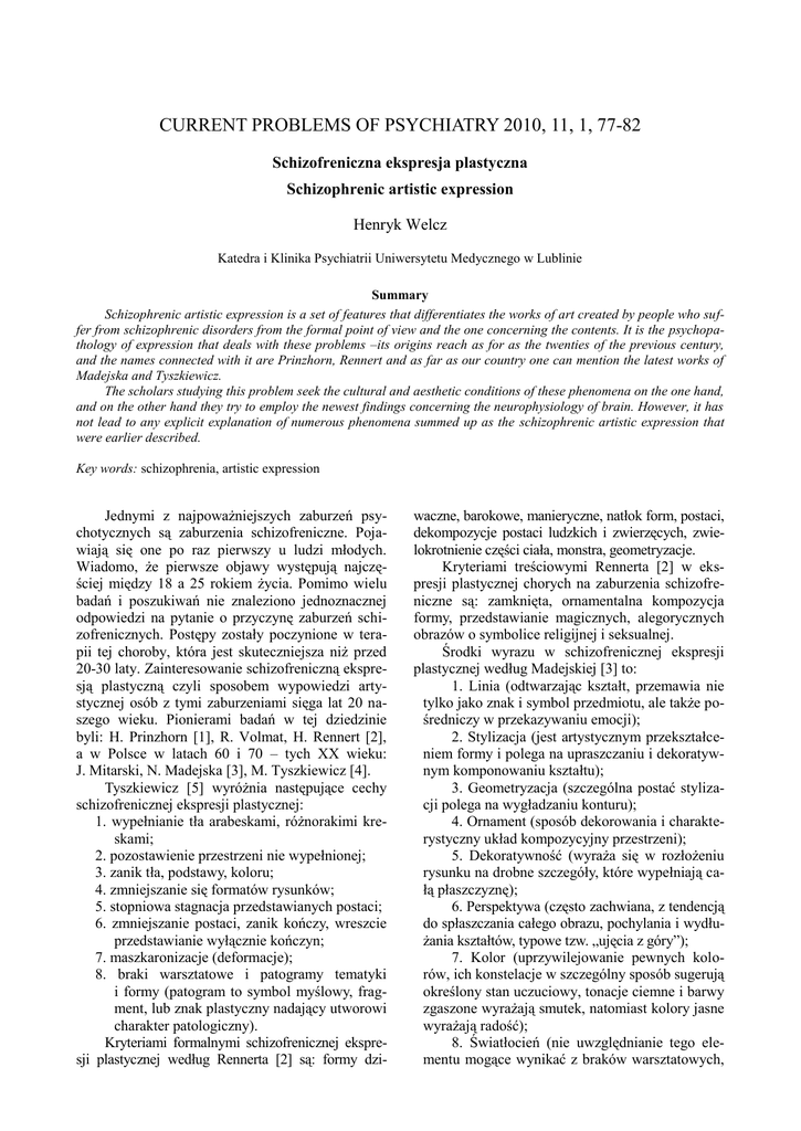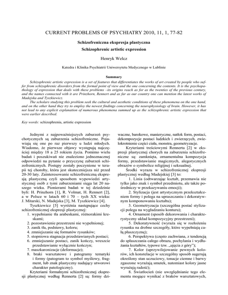 CURRENT PROBLEMS OF PSYCHIATRY 2010, 11, 1, 77-82 Schizofreniczna ekspresja plastyczna Schizophrenic artistic expression Henryk Welcz Katedra i Klinika Psychiatrii Uniwersytetu Medycznego w Lublinie Summary Schizophrenic artistic expression is a set of features that differentiates the works of art created by people who suffer from schizophrenic disorders from the formal point of view and the one concerning the contents. It is the psychopathology of expression that deals with these problems –its origins reach as for as the twenties of the previous century, and the names connected with it are Prinzhorn, Rennert and as far as our country one can mention the latest works of Madejska and Tyszkiewicz. The scholars studying this problem seek the cultural and aesthetic conditions of these phenomena on the one hand, and on the other hand they try to employ the newest findings concerning the neurophysiology of brain. However, it has not lead to any explicit explanation of numerous phenomena summed up as the schizophrenic artistic expression that were earlier described. Key words: schizophrenia, artistic expression Jednymi z najpoważniejszych zaburzeń psychotycznych są zaburzenia schizofreniczne. Pojawiają się one po raz pierwszy u ludzi młodych. Wiadomo, że pierwsze objawy występują najczęściej między 18 a 25 rokiem życia. Pomimo wielu badań i poszukiwań nie znaleziono jednoznacznej odpowiedzi na pytanie o przyczynę zaburzeń schizofrenicznych. Postępy zostały poczynione w terapii tej choroby, która jest skuteczniejsza niż przed 20-30 laty. Zainteresowanie schizofreniczną ekspresją plastyczną czyli sposobem wypowiedzi artystycznej osób z tymi zaburzeniami sięga lat 20 naszego wieku. Pionierami badań w tej dziedzinie byli: H. Prinzhorn [1], R. Volmat, H. Rennert [2], a w Polsce w latach 60 i 70 – tych XX wieku: J. Mitarski, N. Madejska [3], M. Tyszkiewicz [4]. Tyszkiewicz [5] wyróżnia następujące cechy schizofrenicznej ekspresji plastycznej: 1. wypełnianie tła arabeskami, różnorakimi kreskami; 2. pozostawienie przestrzeni nie wypełnionej; 3. zanik tła, podstawy, koloru; 4. zmniejszanie się formatów rysunków; 5. stopniowa stagnacja przedstawianych postaci; 6. zmniejszanie postaci, zanik kończy, wreszcie przedstawianie wyłącznie kończyn; 7. maszkaronizacje (deformacje); 8. braki warsztatowe i patogramy tematyki i formy (patogram to symbol myślowy, fragment, lub znak plastyczny nadający utworowi charakter patologiczny). Kryteriami formalnymi schizofrenicznej ekspresji plastycznej według Rennerta [2] są: formy dzi- waczne, barokowe, manieryczne, natłok form, postaci, dekompozycje postaci ludzkich i zwierzęcych, zwielokrotnienie części ciała, monstra, geometryzacje. Kryteriami treściowymi Rennerta [2] w ekspresji plastycznej chorych na zaburzenia schizofreniczne są: zamknięta, ornamentalna kompozycja formy, przedstawianie magicznych, alegorycznych obrazów o symbolice religijnej i seksualnej. Środki wyrazu w schizofrenicznej ekspresji plastycznej według Madejskiej [3] to: 1. Linia (odtwarzając kształt, przemawia nie tylko jako znak i symbol przedmiotu, ale także pośredniczy w przekazywaniu emocji); 2. Stylizacja (jest artystycznym przekształceniem formy i polega na upraszczaniu i dekoratywnym komponowaniu kształtu); 3. Geometryzacja (szczególna postać stylizacji polega na wygładzaniu konturu); 4. Ornament (sposób dekorowania i charakterystyczny układ kompozycyjny przestrzeni); 5. Dekoratywność (wyraża się w rozłożeniu rysunku na drobne szczegóły, które wypełniają całą płaszczyznę); 6. Perspektywa (często zachwiana, z tendencją do spłaszczania całego obrazu, pochylania i wydłużania kształtów, typowe tzw. „ujęcia z góry”); 7. Kolor (uprzywilejowanie pewnych kolorów, ich konstelacje w szczególny sposób sugerują określony stan uczuciowy, tonacje ciemne i barwy zgaszone wyrażają smutek, natomiast kolory jasne wyrażają radość); 8. Światłocień (nie uwzględnianie tego elementu mogące wynikać z braków warsztatowych, 78 H. Welcz albo występowanie kontrastów, które są wyrazem grozy, obcości); 9. Kompozycja (jest środkiem przekazywania myśli, często spotykaną jest kompozycja otwarta oparta na asymetrii); 10. Temat (różnorodność symboliki, sceny towarzyskie, religijne, miłosne, związane z okaleczeniem, grozą, śmiercią, sądem ostatecznym). Omówienie stosowanych metod badawczych schizofrenicznej ekspresji plastycznej Metodą badawczą jaką zastosowano do celów naukowych była analiza treści i formy wytworów plastycznych głównie malarstwa i rysunku, rzadziej grafiki. Materiał stanowiły prace pacjentów hospitalizowanych z powodu zaburzeń schizofrenicznych Analizowano zarówno prace powstałe spontaniczne, jak i wykonane w ramach zajęć arteterapii, na zadany przez instruktora temat. Podjęto też próby obiektywizacji i statystycznego opracowywania materiału plastycznego uzyskiwanego w szpitalach, poradniach psychiatrycznych i innych miejscach tworzenia przez osoby chorujące na schizofrenię, w badaniach Tyszkiewicz [5]. Dla celów naukowych zastosowano też niektóre psychologiczne testy projekcyjne, a szczególnie interesujące okazały się prace Kucharskiej-Pietury i Grzywy [6] przy pomocy testu obrazu rodziny. Rysunek stanowi często spontanicznie wybraną formę wypowiedzi młodych osób z wczesnym procesem schizofrenicznym. Jego analiza pozwala uchwycić opisywane wielokrotnie zaburzenia formy i treści, ujawniane w takim samym stopniu u osób młodych jak i dłużej chorujących na zaburzenia schizofreniczne. Tematyka przedstawień plastycznych osób chorujących na schizofrenię Motywy erotyczne i sakralne są często obecne w pracach plastycznych chorych na schizofrenię. Wspomina się o nich często w literaturze przedmiotu określanej jako psychopatologia ekspresji [1,4,11,7]. Podkreśla się dwoistość przedstawień miłości w twórczości tych chorych. Od