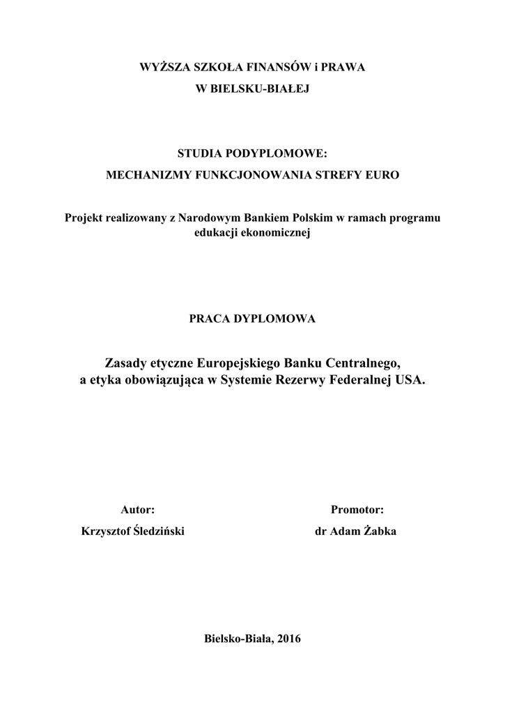 WYŻSZA SZKOŁA FINANSÓW i PRAWA W BIELSKU-BIAŁEJ STUDIA PODYPLOMOWE: MECHANIZMY FUNKCJONOWANIA STREFY EURO Projekt realizowany z Narodowym Bankiem Polskim w ramach programu edukacji ekonomicznej PRACA DYPLOMOWA Zasady etyczne Europejskiego Banku Centralnego, a etyka obowiązująca w Systemie Rezerwy Federalnej USA. Autor: Promotor: Krzysztof Śledziński dr Adam Żabka Bielsko-Biała, 2016 Spis treści Wstęp.......................................................................................................................................... 5 1. Etyka w bankowości............................................................................................................... 7 1.1. Pojęcie etyki..................................................................................................................7 1.2. Pojęcie bankowości.......................................................................................................8 1.3. Etyka gospodarcza, a etyka bankowości.......................................................................8 1.4. Źródła zasad etycznych w bankowości.........................................................................9 2. Wybrane źródła zasad etycznych w Europejskim Banku Centralnym................................. 13 2.1. Europejski Bank Centralny oraz Europejski System Banków Centralnych............... 13 2.2. Traktat o funkcjonowaniu Unii Europejskiej..............................................................14 2.3. Statut Europejskiego Systemu Banków Centralnych i Europejskiego Banku Centralnego oraz Regulamin EBC.....................................................................................14 2.4. Zasady Etyki Zawodowej Europejskiego Banku Centralnego................................... 16 2.5. Kodeks postępowania członków Rady Nadzoru EBC................................................21 2.6. Wytyczne EBC określające podstawy Zasad etyki Eurosystemu...............................22 2.7. Komitet EBC ds. Etyki i jego regulamin.................................................................... 23 2.8. Kryteria etyczne dla członków zarządu EBC............................................................. 24 2.9. Kodeks postępowania dla członków Rady Prezesów oraz Regulamin Rady Ogólnej.25 2.10. Zasady etyki dla jednolitego systemu nadzorczego oraz Mandat Komitetu ds. Audytu............................................................................................................................... 26 3. Wybrane źródła zasad etycznych w Systemie Rezerwy Federalnej..................................... 28 3.1. System Rezerwy Federalnej........................................................................................28 3.2. Przykładowy Kodeks Postępowania...........................................................................29 3.3. Wytyczne dotyczące korzystania z zewnętrznych ekspertów na kontrole, inspekcje i do innych spraw związanych z nadzorem bankowym oraz Specjalne Ograniczenia po okresie zatrudnienia przewidziane w ustawie z 2004 roku o Reformie Wywiadu i Zapobieganiu Terroryzmowi........................................................................................... 30 3.4. Zmieniona Polityka w zakresie konfliktu interesów i wydawania zaświadczeń inspektorom oraz Posiłki i inne prezenty oferowane inspektorom i asystentom inspektorów........................................................................................................................31 3 3.5. Nieobowiązkowy przewodnik postępowania dla urzędników wyższego szczebla.... 32 4. Zasady etyczne EBC i Fed, jako przykład standardów etycznych w bankach centralnych..34 Podsumowanie.......................................................................................................................... 37 Bibliografia............................................................................................................................... 39 4 Wstęp W ostatnich latach coraz więcej przedsiębiorstw i instytucji wprowadziło do swojej działalności zasady związane ze społeczną odpowiedzialnością biznesu, czy też kodeksy postępowań pracowników, kodeksy natury etycznej. Banki komercyjne wśród swoich dokumentów firmowych posiadają kodeksy etyczne, zawierające wymogi etyczne dotyczące postępowania pracowników, jak i pewne cechy etyczne, które w pewien sposób przypisane są całej organizacji. w Polsce znanym dokumentem jest Kodeks Etyki Bankowej (Zasady Dobrej Praktyki Bankowej) Związku Banków Polskich. Sięgając do literatury ekonomicznej, związanej z bankowością można zauważyć, że etyka w bankowości, etyka bankowa, stała się przedmiotem refleksji również ekonomistów. Etyka ta w głównej mierze koncentruje się wokół norm etycznych, które powinny stanowić trzon kodeksów etycznych w sferze bankowości komercyjnej. Spoglądając na programy studiów z zakresu bankowości, tam również odnajdziemy etykę zawodową, która ma za zadanie uczulić przyszłych bankierów na wartości niefinansowe, które powinny towarzyszyć ich przyszłej pracy. Etyka wykładana na studiach związanych z bankowością również koncentruje się wokół zagadnień związanych z etyką ogólną i etyką związaną z działalnością banków komercyjnych. W literaturze z zakresu etyki, czy też z zakresu bankowości bardzo rzadko porusza się tematy związane z etyką, normami etycznymi związanymi z działalnością banków centralnych. Bardzo często bank centralny ukazywany jest, jako główne ogniwo systemu bankowego, a tylko nieliczni próbują podejmować tematykę związaną z etyką banków centralnych. Etyka ta ma swoją specyfikę i w pewnym zakresie różni się od zasad etycznych obowiązujących w bankach komercyjnych. Szczególnie widoczną różnicą pomiędzy kodeksami etycznymi banków centralnych, a banków komercyjnych jest znaczenie relacji bank-klient. Kodeksy banków komer
