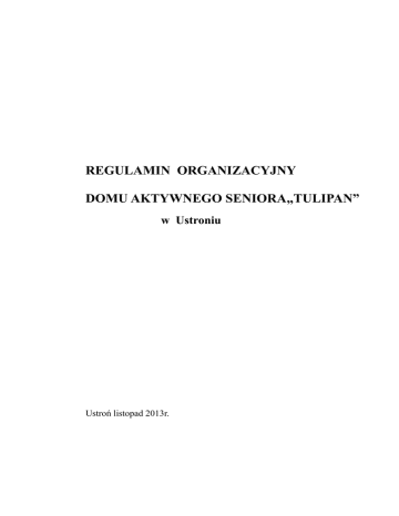 REGULAMIN ORGANIZACYJNY DOMU AKTYWNEGO SENIORA„TULIPAN” w Ustroniu Ustroń listopad 2013r. ROZDZIAŁ I PRZEPISY OGÓLNE § 1 Regulamin organizacyjny Domu Aktywnego Seniora "TULIPAN"w Ustroniu, zwany dalej "Regulaminem" określa organizację, zasady działania oraz zakres i poziom usług świadczonych przez Dom Aktywnego Seniora"TULIPAN" w Ustroniu, zwanym dalej „Domem”. §2 Dom Aktywnego Seniora"TULIPAN" w Ustroniu działa na podstawie: 1).Ustawy o pomocy społecznej z dnia 12 marca 2004 r. (Dz. U. z 2004 r. Nr 64, poz. 593 z późniejszymi zmianami), 2). Rozporządzenia Ministra Polityki Społecznej z dnia 19 października 2005 r. w sprawie domów pomocy społecznej (Dz. U. Nr 217 z 2005 r., poz. 1837), 3) Ustawy o finansach publicznych z dnia 27 sierpnia 2009 r. (Dz.U. z 2009 r. Nr 157, poz. 1240). 4) Niniejszego regulaminu 5) Statutu Domu Aktywnego Seniora "Tulipan" §3 1.Dom Aktywnego Seniora"TULIPAN" jest samodzielną jednostką organizacyjną i budżetową , podległą bezpośrednio Zarządowi Arka Vitae S.A. 2.Siedzibą Domu Aktywnego Seniora"TULIPAN' jest Ustroń. 3.Dom jest zlokalizowany w Ustroniu, przy ul. Szpitalnej 21 4.Dom używa nazwy : Dom Aktywnego Seniora"TULIPAN" §4 1).Dom jest przeznaczony dla 20 osób w podeszłym wieku oraz dorosłych niepełnosprawnych intelektualnie,przewlekle chorych 2).Dom jest placówką stacjonarną, umożliwiającą mieszkańcom pobyt zarówno stały jak i okresowy – zapewniającą całodobową opiekę. 3). Dom świadczy usługi bytowe,opiekuńcze i wspomagające mieszkańcom Domu,w szczególności mające na celu rehabilitację osób niepełnosprawnych przebywających w Domu. 4).Dom prowadzi usługi na rzecz osób starszych, przewlekle chorych, niepełnosprawnych, ze środowiska, potencjalnych kandydatów na mieszkańców Domu. ROZDZIAŁ II ZASADY KIEROWANIA DOMEM §5 1.Pracą Domu kieruje Dyrektor 2.Dyrektor odpowiada za prawidłowe funkcjonowanie Domu Aktywnego Seniora "TULIPAN"i reprezentuje Dom na zewnątrz. 3.W działalności Domu obowiązują zasady praworządności, sprawiedliwości, gospodarności, służebności wobec swoich klientów i współdziałania ze społeczeństwem. 4.Zasady postępowania oraz standardy zachowania pracowników Domu określa Kodeks etyczny pracowników Domu. §6 1.Dyrektor kierując Domem, w szczególności: 1) określa organizację wewnętrzną oraz tryb pracy Domu, 2) dokonuje podziału zadań w kierownictwie Domu i kieruje ich pracą, 3) określa zasady polityki kadrowej, dba o należyty dobór pracowników i podnoszenie ich kwalifikacji, 4) rozstrzyga sprawy sporne miedzy pracownikami, 5) awansuje, nagradza, wyróżnia, ewentualnie udziela kar pracownikom Domu, 6) zapewnia skuteczny nadzór nad praca podległych pracowników, 7) nadzoruje przestrzeganie przez pracowników Domu dyscypliny pracy i właściwego stosunku do mieszkańców Domu. 8) nadzór nad prawidłowością oceny sytuacji mieszkańca, 9) organizacja spotkań zespołów terapeutycznych, 10) nadzór nad jakością i prawidłowością świadczonych usług 11) sprawowanie bieżącej kontroli i nadzoru nad opracowywaniem i realizacją indywidualnych planów wspierania mieszkańców, 12) nadzór nad warunkami życia mieszkańców. 2.Dyrektor/kierownik zapewnia system kontroli zarządczej, który obejmuje: 1) zgodność działalności z przepisami prawa, 2) skuteczne i efektywne działania, 3) przestrzeganie i promowanie zasad etycznego zachowania, 4) efektywność i skuteczność przepływu informacji, 5) zarządzanie ryzykiem. §7 Do podstawowych obowiązków referenta administracyjnego należy: 1)opracowywanie budżetu Domu – planów finansowych, dochodów i wydatków oraz wniosków w sprawie tych planów i ich realizacji, 2)realizacja budżetu, kontrole i analizy wykorzystania środków finansowych, 3)ścisłe przestrzeganie dyscypliny budżetowej w realizacji zadań Domu oraz nadzór nad ich realizacją, zgodnie z planowanym przeznaczeniem – w sposób celowy i oszczędny, 4) organizowanie zabezpieczenia składników majątkowych oraz opracowanie wytycznych w sprawach inwentaryzacji, 5) kontrola bieżąca zasadności wydatków Domu, 6) prowadzenie terminowej i rzetelnej sprawozdawczości statystycznej. ROZDZIAŁ III STRUKTURA ORAGANIZACYJNA DOMU §8 I. W skład struktury organizacyjnej Domu wchodzą działy: Dział Opiekuńczo – Terapeutyczny, w skład którego wchodzą stanowiska pracy: - lekarze, - pielęgniarki, - fizjoterapeuci, - pracownicy socjalni, - opiekunowie, - pokojowe, - kapelani, - instruktorzy terapii zajęciowej, - instruktorzy ds. kulturalno – oświatowych, - terapeuci. 1. 2. 3. 4. 5. 6. Do zadań działu należy: zapewnienie właściwej opieki medycznej i rehabilitacyjnej nad mieszkańcami Domu, zaopatrzenie mieszkańców w leki, utrzymanie właściwego stanu higieniczno – sanitarnego, prowadzenie dokumentacji stanu zdrowia mieszkańców, wydawanie posiłków i karmienie mieszkańców niezdolnych do samodzielnego ich spożywania, ubieranie, mycie i kąpanie osób, które nie mogą samodzielnie wykonywać tych czynności, 7. pomoc przy zmianie bielizny osobistej i pościelowej mieszkańców, 8. prowadzenie ewidencji badań okresowych pracowników, 9. opracowywanie programów rehabilitacji w różnych formach, które poprawią zakres samoobsługi mieszkańców Domu, 10.kreowanie modelu zachowań pro zdrowotnych ze szczególnym propagowaniem różnych form zajęć ruchowych, które pozwolą na utrzymanie możliwie dobrej sprawności fizycznej mieszkańców, 11.współpraca z placówkami opieki zdrowotnej, 12.rozwój samorządności wśród mieszkańców Domu, 13.zapewnienie mieszkańcom pomocy w adaptacji i w zabezpieczeniu mienia osobistego, 14.pomoc mieszkańcom w rozwiązywaniu ich codziennych problemów, 15.prowadzenie terapii zajęciowej wśród mieszkańców oraz ich aktywizacja, 16.prowadzenie działalności kulturalno – oświatowej, rekreacyjnej i turystycznej wśród mieszkańców Domu, organizow
