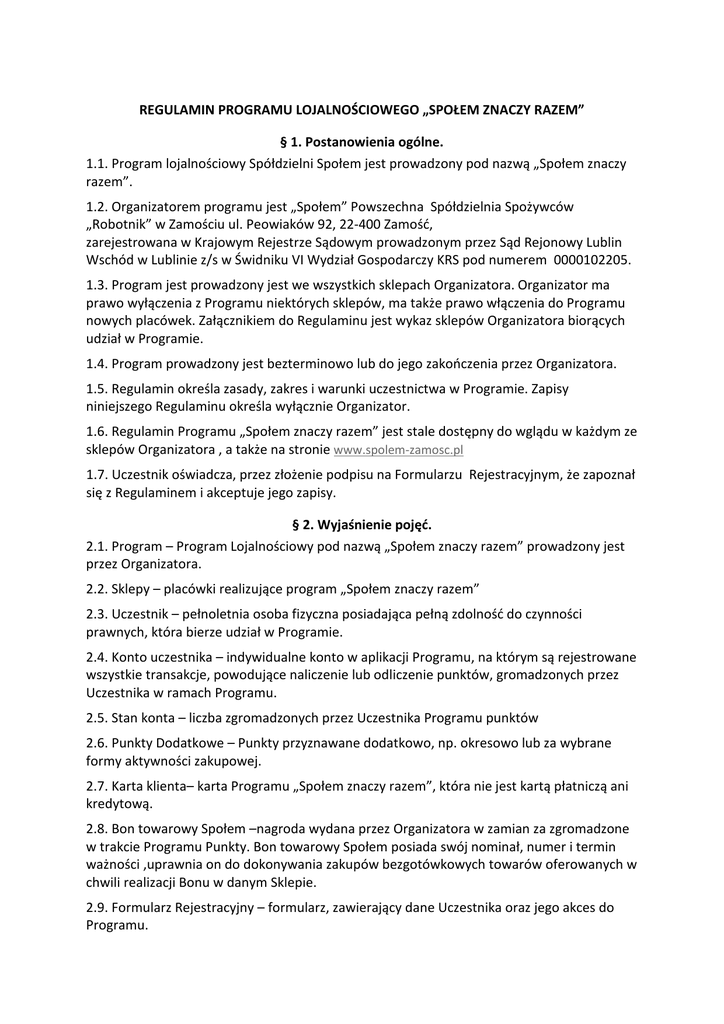 REGULAMIN PROGRAMU LOJALNOŚCIOWEGO „SPOŁEM ZNACZY RAZEM” § 1. Postanowienia ogólne. 1.1. Program lojalnościowy Spółdzielni Społem jest prowadzony pod nazwą „Społem znaczy razem”. 1.2. Organizatorem programu jest „Społem” Powszechna Spółdzielnia Spożywców „Robotnik” w Zamościu ul. Peowiaków 92, 22-400 Zamość, zarejestrowana w Krajowym Rejestrze Sądowym prowadzonym przez Sąd Rejonowy Lublin Wschód w Lublinie z/s w Świdniku VI Wydział Gospodarczy KRS pod numerem 0000102205. 1.3. Program jest prowadzony jest we wszystkich sklepach Organizatora. Organizator ma prawo wyłączenia z Programu niektórych sklepów, ma także prawo włączenia do Programu nowych placówek. Załącznikiem do Regulaminu jest wykaz sklepów Organizatora biorących udział w Programie. 1.4. Program prowadzony jest bezterminowo lub do jego zakończenia przez Organizatora. 1.5. Regulamin określa zasady, zakres i warunki uczestnictwa w Programie. Zapisy niniejszego Regulaminu określa wyłącznie Organizator. 1.6. Regulamin Programu „Społem znaczy razem” jest stale dostępny do wglądu w każdym ze sklepów Organizatora , a także na stronie www.spolem-zamosc.pl 1.7. Uczestnik oświadcza, przez złożenie podpisu na Formularzu Rejestracyjnym, że zapoznał się z Regulaminem i akceptuje jego zapisy. § 2. Wyjaśnienie pojęć. 2.1. Program – Program Lojalnościowy pod nazwą „Społem znaczy razem” prowadzony jest przez Organizatora. 2.2. Sklepy – placówki realizujące program „Społem znaczy razem” 2.3. Uczestnik – pełnoletnia osoba fizyczna posiadająca pełną zdolność do czynności prawnych, która bierze udział w Programie. 2.4. Konto uczestnika – indywidualne konto w aplikacji Programu, na którym są rejestrowane wszystkie transakcje, powodujące naliczenie lub odliczenie punktów, gromadzonych przez Uczestnika w ramach Programu. 2.5. Stan konta – liczba zgromadzonych przez Uczestnika Programu punktów 2.6. Punkty Dodatkowe – Punkty przyznawane dodatkowo, np. okresowo lub za wybrane formy aktywności zakupowej. 2.7. Karta klienta– karta Programu „Społem znaczy razem”, która nie jest kartą płatniczą ani kredytową. 2.8. Bon towarowy Społem –nagroda wydana przez Organizatora w zamian za zgromadzone w trakcie Programu Punkty. Bon towarowy Społem posiada swój nominał, numer i termin ważności ,uprawnia on do dokonywania zakupów bezgotówkowych towarów oferowanych w chwili realizacji Bonu w danym Sklepie. 2.9. Formularz Rejestracyjny – formularz, zawierający dane Uczestnika oraz jego akces do Programu. 2.10. Nagroda dodatkowa – nagroda, która może zostać przyznana Uczestnikowi przez Organizatora w ramach dodatkowych promocji. 2.11.Kod karty- kod EAN na Karcie klienta, którego odczytanie przez system kasowy powoduje przypisanie numeru Karty klienta do jego transakcji i naliczenie punktów na koncie Uczestnika. 2.12.Partner- inny podmiot oferujący uczestnikom w ramach programu towary lub usługi na preferencyjnych warunkach, określonych w porozumieniu zawartym z Organizatorem. § 3. Warunki udziału w Programie. 3.1. Uczestnikiem Programu może być wyłącznie pełnoletnia osoba fizyczna posiadająca pełną zdolność do czynności prawnych, która zgłosiła akces uczestnictwa w Programie i której wydano Kartę klienta. 3.2. Karta klienta wydawana jest bezpłatnie Uczestnikom Programu we wszystkich sklepach Organizatora, po złożeniu podpisu pod prawidłowo wypełnionym i własnoręcznie podpisanym formularzem rejestracyjnym. 3.3. Uczestnik przez złożenie podpisu na Formularzu Rejestracyjnym oświadcza, iż: - ma ukończone 18 lat, - zapoznał się z Regulaminem Programu „Społem znaczy razem” i przyjmuje jego warunki, - wyraża zgodę na administrowanie i przetwarzanie danych osobowych, które udostępnił w Formularzu rejestracyjnym, na warunkach określonych w ustawie z dnia 29 sierpnia 1997r o ochronie danych osobowych(tj. Dz. U z 2002r Nr 101, poz.926 z póżn. zm.) dla celów realizacji Programu „Społem znaczy razem” przez Administratora tj. „Społem” PSS „Robotnik” w Zamościu wpisaną do Rejestru przedsiębiorców pod numerem KRS 0000102205. - zgodnie z art.24 ust.1 ustawy o ochronie danych osobowych został poinformowany, iż: a/celem zbierania danych osobowych jest prawidłowe przeprowadzenie Programu „Społem znaczy razem”, b/przekazywanie danych osobowych przez uczestników Programu „Społem znaczy razem” jest dobrowolne, c/osobie podającej dane przysługuje prawo dostępu do treści swoich danych osobowych oraz prawo ich poprawiania, a także prawo wniesienia żądania zaprzestania ich wykorzystywania oraz sprzeciwu wobec ich przetwarzania. 3.4. Wypełniając i przekazując Formularz Rejestracyjny Uczestnik może wyrazić także zgodę na administrowanie i przetwarzanie danych osobowych zawartych w Formularzu Rejestracyjnym przez Organizatora w celach reklamowych i marketingowych. Uczestnik wyraża jednocześnie zgodę na otrzymywanie ofert handlowych oraz korespondencji drogą elektroniczną (na adres poczty elektronicznej lub sms-em). Dane osobowe Uczestnika są chronione zgodnie z Ustawą o ochronie danych osobowych oraz ustawą z dnia 18 lipca 2002 r. o świadczeniu usług drogą elektroniczną (Dz.U. Nr 144, poz. 1204). 3.5. Uczestnikowi przysługuje prawo dostępu do treści jego danych osobowych oraz prawo do żądania ich poprawiania, uzupełniania, lub usunięcia zgodnie z art. 32—35 Ustawy o ochronie danych osobowych. W przypadku rezygnacji z uczestnictwa w programie , dane osobowe uczestnika są usuwane. 3.6. Karta klienta jest własnością Organizatora. § 4. Zapisywanie transakcji, gromadzenie korzyści. 4.1. Uczestnik gromadzi Punkty na elektronicznym koncie przydzielonym przez Organizatora poprzez zakup towarów w Sklepach Organizatora. Z naliczania punktów zostają wyłączone: doładowania telefonów, karty telefoniczne, wyroby tytoniowe, bilety MZK , pła