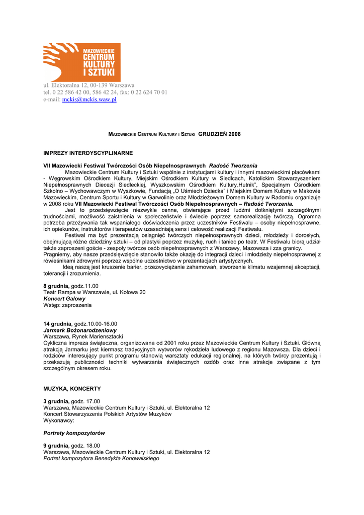 ul. Elektoralna 12, 00-139 Warszawa tel. 0 22 586 42 00, 586 42 24, fax: 0 22 624 70 01 e-mail: [email protected] MAZOWIECKIE CENTRUM KULTURY I SZTUKI GRUDZIEŃ 2008 IMPREZY INTERDYSCYPLINARNE VII Mazowiecki Festiwal Twórczości Osób Niepełnosprawnych Radość Tworzenia Mazowieckie Centrum Kultury i Sztuki wspólnie z instytucjami kultury i innymi mazowieckimi placówkami - Węgrowskim Ośrodkiem Kultury, Miejskim Ośrodkiem Kultury w Siedlcach, Katolickim Stowarzyszeniem Niepełnosprawnych Diecezji Siedleckiej, Wyszkowskim Ośrodkiem Kultury„Hutnik”, Specjalnym Ośrodkiem Szkolno – Wychowawczym w Wyszkowie, Fundacją „O Uśmiech Dziecka” i Miejskim Domem Kultury w Makowie Mazowieckim, Centrum Sportu i Kultury w Garwolinie oraz Młodzieżowym Domem Kultury w Radomiu organizuje w 2008 roku VII Mazowiecki Festiwal Twórczości Osób Niepełnosprawnych – Radość Tworzenia. Jest to przedsięwzięcie niezwykle cenne, otwierające przed ludźmi dotkniętymi szczególnymi trudnościami, możliwość zaistnienia w społeczeństwie i świecie poprzez samorealizację twórczą. Ogromna potrzeba przeżywania tak wspaniałego doświadczenia przez uczestników Festiwalu – osoby niepełnosprawne, ich opiekunów, instruktorów i terapeutów uzasadniają sens i celowość realizacji Festiwalu. Festiwal ma być prezentacją osiągnięć twórczych niepełnosprawnych dzieci, młodzieży i dorosłych, obejmującą różne dziedziny sztuki – od plastyki poprzez muzykę, ruch i taniec po teatr. W Festiwalu biorą udział także zaproszeni goście - zespoły twórcze osób niepełnosprawnych z Warszawy, Mazowsza i zza granicy. Pragniemy, aby nasze przedsięwzięcie stanowiło także okazję do integracji dzieci i młodzieży niepełnosprawnej z rówieśnikami zdrowymi poprzez wspólne uczestnictwo w prezentacjach artystycznych. Ideą naszą jest kruszenie barier, przezwyciężanie zahamowań, stworzenie klimatu wzajemnej akceptacji, tolerancji i zrozumienia. 8 grudnia, godz.11.00 Teatr Rampa w Warszawie, ul. Kołowa 20 Koncert Galowy Wstęp: zaproszenia 14 grudnia, godz.10.00-16.00 Jarmark Bożonarodzeniowy Warszawa, Rynek Mariensztacki Cykliczna impreza świąteczna, organizowana od 2001 roku przez Mazowieckie Centrum Kultury i Sztuki. Główną atrakcją Jarmarku jest kiermasz tradycyjnych wytworów rękodzieła ludowego z regionu Mazowsza. Dla dzieci i rodziców interesujący punkt programu stanowią warsztaty edukacji regionalnej, na których twórcy prezentują i przekazują publiczności techniki wytwarzania świątecznych ozdób oraz inne atrakcje związane z tym szczególnym okresem roku. MUZYKA, KONCERTY 3 grudnia, godz. 17.00 Warszawa, Mazowieckie Centrum Kultury i Sztuki, ul. Elektoralna 12 Koncert Stowarzyszenia Polskich Artystów Muzyków Wykonawcy: Portrety kompozytorów 9 grudnia, godz. 18.00 Warszawa, Mazowieckie Centrum Kultury i Sztuki, ul. Elektoralna 12 Portret kompozytora Benedykta Konowalskiego Wykonawcy: Paweł Gusnar – saksofon altowy, Joanna Kawalla – skrzypce, Anna Mikołajczyk-Niewiedział – sopran, Dorota Sroczyńska – altówka, Edward Wolanin – fortepian Portret kompozytora Joachima Olkuśnika Wykonawcy: Agata Igras-Sawicka – flet, Adrian Janda – klarnet, Bartłomiej Kominek – fortepian, Leszek Lorent, Szymon Linette – perkusja, Anna Mikołajczyk-Niewiedział – sopran, Mikołaj Pałosz – wiolonczela, Julia Samojło – fortepian, Robert Żelazko – puzon, Barbara Okoń-Makowska – projekcja dźwięku. 10 grudnia, godz. 18.00 Warszawa, Mazowieckie Centrum Kultury i Sztuki, ul. Elektoralna 12 Portret kompozytora Adama Walacińskiego Wykonawcy: Agnieszka Karwowska – flet, Joanna Kawalla – skrzypce, Bartłomiej Kominek – fortepian, Alina Mleczko – saksofon altowy, Marta Nagawiecka – wiolonczela, Sławomir Piecuch – kontrabas, Tomasz Strahl – wiolonczela, Marek Szlezer – fortepian, Tytus Wojnowicz – obój Portret kompozytora Bartosza Kowalskiego-Banasewicza Wykonawcy: Michał Górczyński – klarnet, Bartosz Kowalski-Banasewicz – fortepian, kornet, dyrygent, Leszek Lorent, Szymon Linette – perkusja, Patryk „TikTak” Matela – beat box, Kwartet smyczkowy QUARREL w składzie: Magdalena Makowska – I skrzypce, Karolina Weltrowska – II skrzypce, Anna Szulc-Kapała – altówka, Eunyoung Park – wiolonczela, Młodzieżowa Orkiestra Kameralna „Unplugged Ensemble”, Michał Śmigielski – dyrygent, Barbara Okoń-Makowska – projekcja dźwięku. 11 grudnia, godz. 18.00 Warszawa, Mazowieckie Centrum Kultury i Sztuki, ul. Elektoralna 12 Portret kompozytora Michała Talma-Sutt Wykonawcy: Andrzej Bauer – wiolonczela, Agata Zubel – sopran, Cezary Duchnowski – komputer. Portret kompozytora Dobromiły Jaskot Wykonawcy: Andrzej Bauer – wiolonczela, Adrian Janda – klarnet, Mikołaj Pałosz – wiolonczela, Julia Samojło – fortepian, Kwartet smyczkowy QUARREL w składzie: Magdalena Makowska – I skrzypce, Karolina Weltrowska – II skrzypce, Anna Szulc-Kapała – altówka, Eunyoung Park – wiolonczela, Barbara Okoń-Makowska – projekcja dźwięku. 11 grudnia, godz. 17.00 Sokołów Podlaski, Sokołowski Ośrodek Kultury Prezentacje laureatów Nagrody Samorządu Województwa Mazowieckiego im. C.K. Norwida – Andrzej Bieńkowski (laureat w kategorii Muzyka) Wykonawcy: Maria Pęzik – śpiew i taniec z Gałek Rusinowskich, Maria Siwiec - śpiew z Gałek Rusinowskich, Piotr Zgorzelski – basy i taniec, Kapela Braci Tarnowskich z Domaniowa w składzie: Adam Tarnowski – skrzypce, Stanisław Tarnowski – harmonia, Józef Tarnowski – bęben, Janusz Prusinowski Trio w składzie: Piotr Piszczatowski – bębenek, baraban, basy, prowadzenie, Janusz Prusinowski – skrzypce, cymbały, śpiew, Michał Żak – flet drewniany, szałamaja. 17 grudnia, godz. 17.00 Warszawa, Mazowieckie Centrum Kultury i Sztuki, ul. Elektoralna 12 Koncert Stowarzyszenia Polskich Artystów Muzyków Wykonawcy: LITERATURA Z kartek szele