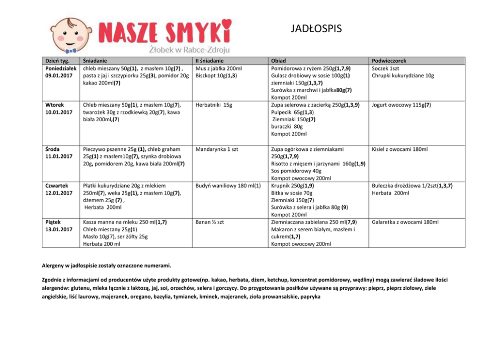 JADŁOSPIS Dzień tyg. Poniedziałek 09.01.2017 Śniadanie chleb mieszany 50g(1), z masłem 10g(7) , pasta z jaj i szczypiorku 25g(3), pomidor 20g kakao 200ml(7) II śniadanie Mus z jabłka 200ml Biszkopt 10g(1,3) Wtorek 10.01.2017 Chleb mieszany 50g(1), z masłem 10g(7), twarożek 30g z rzodkiewką 20g(7), kawa biała 200ml,(7) Herbatniki 15g Środa 11.01.2017 Pieczywo pszenne 25g (1), chleb graham 25g(1) z masłem10g(7), szynka drobiowa 20g, pomidorem 20g, kawa biała 200ml(7) Mandarynka 1 szt Czwartek 12.01.2017 Płatki kukurydziane 20g z mlekiem 250ml(7), weka 25g(1), z masłem 10g(7), dżemem 25g (7) , Herbata 200ml Budyń waniliowy 180 ml(1) Piątek 13.01.2017 Kasza manna na mleku 250 ml(1,7) Chleb mieszany 25g(1) Masło 10g(7), ser żółty 25g Herbata 200 ml Banan ½ szt Obiad Pomidorowa z ryżem 250g(1,7,9) Gulasz drobiowy w sosie 100g(1) ziemniaki 150g(1,3,7) Surówka z marchwi i jabłka80g(7) Kompot 200ml Zupa selerowa z zacierką 250g(1,3,9) Pulpecik 65g(1,3) Ziemniaki 150g(7) buraczki 80g Kompot 200ml Podwieczorek Soczek 1szt Chrupki kukurydziane 10g Zupa ogórkowa z ziemniakami 250g(1,7,9) Risotto z mięsem i jarzynami 160g(1,9) Sos pomidorowy 40g Kompot owocowy 200ml Krupnik 250g(1,9) Bitka w sosie 70g Ziemniaki 150g(7) Surówka z selera i jabłka 80g (9) Kompot 200ml Ziemniaczana zabielana 250 ml(7,9) Makaron z serem białym, masłem i cukrem(1,7) Kompot owocowy 200ml Kisiel z owocami 180ml Jogurt owocowy 115g(7) Bułeczka drożdżowa 1/2szt(1,3,7) Herbata 200ml Galaretka z owocami 180ml Alergeny w jadłospisie zostały oznaczone numerami. Zgodnie z informacjami od producentów użyte produkty gotowe(np. kakao, herbata, dżem, ketchup, koncentrat pomidorowy, wędliny) mogą zawierać śladowe ilości alergenów: glutenu, mleka łącznie z laktozą, jaj, soi, orzechów, selera i gorczycy. Do przygotowania posiłków używane są przyprawy: pieprz, pieprz ziołowy, ziele angielskie, liść laurowy, majeranek, oregano, bazylia, tymianek, kminek, majeranek, zioła prowansalskie, papryka