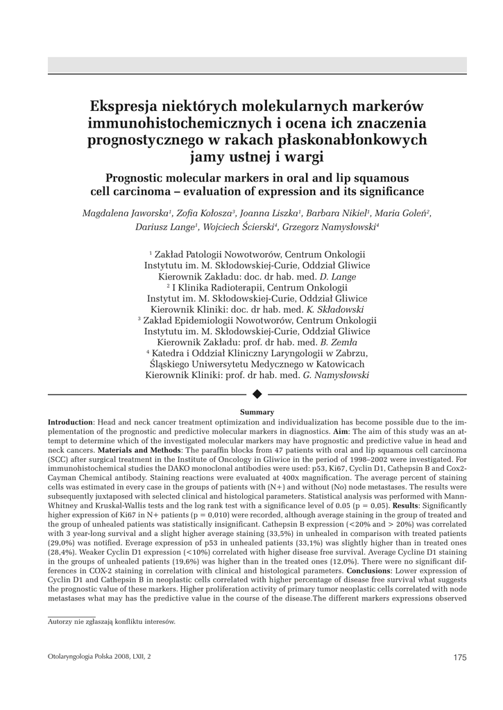 PRACE ORYGINALNE Molekularne markery immunohistochemiczne Ekspresja niektórych molekularnych markerów immunohistochemicznych i ocena ich znaczenia prognostycznego w rakach płaskonabłonkowych jamy ustnej i wargi Prognostic molecular markers in oral and lip squamous cell carcinoma – evaluation of expression and its significance Magdalena Jaworska1, Zofia Kołosza3, Joanna Liszka1, Barbara Nikiel1, Maria Goleń2, Dariusz Lange1, Wojciech Ścierski4, Grzegorz Namysłowski4 1 Zakład Patologii Nowotworów, Centrum Onkologii Instytutu im. M. Skłodowskiej-Curie, Oddział Gliwice Kierownik Zakładu: doc. dr hab. med. D. Lange 2 I Klinika Radioterapii, Centrum Onkologii Instytut im. M. Skłodowskiej-Curie, Oddział Gliwice Kierownik Kliniki: doc. dr hab. med. K. Składowski 3 Zakład Epidemiologii Nowotworów, Centrum Onkologii Instytutu im. M. Skłodowskiej-Curie, Oddział Gliwice Kierownik Zakładu: prof. dr hab. med. B. Zemła 4 Katedra i Oddział Kliniczny Laryngologii w Zabrzu, Śląskiego Uniwersytetu Medycznego w Katowicach Kierownik Kliniki: prof. dr hab. med. G. Namysłowski Summary Introduction: Head and neck cancer treatment optimization and individualization has become possible due to the implementation of the prognostic and predictive molecular markers in diagnostics. Aim: The aim of this study was an attempt to determine which of the investigated molecular markers may have prognostic and predictive value in head and neck cancers. Materials and Methods: The paraffin blocks from 47 patients with oral and lip squamous cell carcinoma (SCC) after surgical treatment in the Institute of Oncology in Gliwice in the period of 1998–2002 were investigated. For immunohistochemical studies the DAKO monoclonal antibodies were used: p53, Ki67, Cyclin D1, Cathepsin B and Cox2Cayman Chemical antibody. Staining reactions were evaluated at 400x magnification. The average percent of staining cells was estimated in every case in the groups of patients with (N+) and without (No) node metastases. The results were subsequently juxtaposed with selected clinical and histological parameters. Statistical analysis was performed with MannWhitney and Kruskal-Wallis tests and the log rank test with a significance level of 0.05 (p = 0,05). Results: Significantly higher expression of Ki67 in N+ patients (p = 0,010) were recorded, although average staining in the group of treated and the group of unhealed patients was statistically insignificant. Cathepsin B expression (<20% and > 20%) was correlated with 3 year-long survival and a slight higher average staining (33,5%) in unhealed in comparison with treated patients (29,0%) was notified. Everage expression of p53 in unhealed patients (33,1%) was slightly higher than in treated ones (28,4%). Weaker Cyclin D1 expression (<10%) correlated with higher disease free survival. Average Cycline D1 staining in the groups of unhealed patients (19,6%) was higher than in the treated ones (12,0%). There were no significant differences in COX-2 staining in correlation with clinical and histological parameters. Conclusions: Lower expression of Cyclin D1 and Cathepsin B in neoplastic cells correlated with higher percentage of disease free survival what suggests the prognostic value of these markers. Higher proliferation activity of primary tumor neoplastic cells correlated with node metastases what may has the predictive value in the course of the disease.The different markers expressions observed Autorzy nie zgłaszają konfliktu interesów. Otolaryngologia Polska 2008, LXII, 2 175 M. Jaworska i inni in the different oral cavity localizations confirm the necessity to select patients for further investigations with respect to uniform disease changes topography. H a s ł a i n d e k s o w e : p53, Ki67, Cyklina D1, Catepsyna B, Raki płaskonabłonkowe głowy i szyi K e y w o r d s : p53, Ki67, Cycline D1, Cathepsin B, head and neck squamous cell carcinoma. Otolaryngol Pol 2008; LXII (2): 175–181 © 2008 by Polskie Towarzystwo Otorynolaryngologów – Chirurgów Głowy i Szyi WSTĘP Raki regionu głowy i szyi są szóstym, co do częstości występowania na świecie nowotworem złośliwym. Histologicznie 90% tych nowotworów stanowią raki płaskonabłonkowe [1]. W ostatnich latach obserwuje się stały wzrost zachorowalności i umieralności z powodu tego nowotworu, szczególnie wśród młodych dorosłych w centralnej Europie [2]. Mimo postępów w sposobach leczenia i diagnostyce, rokowanie w tych nowotworach jest wciąż poważne i niewiele się zmieniło w ostatnich dekadach. Największe znaczenie prognostyczne w rakach płaskonabłonkowych głowy i szyi (SCCHN) przypisywano dotychczas lokalizacji i wielkości guza, obecności przerzutów nowotworowych w regionalnych węzłach chłonnych oraz stanowi ogólnemu chorego. Wciąż trwają poszukiwania innych, biologicznych czynników prognostycznych. Nowe możliwości w tym kierunku stwarza rozwój genetyki, szczególnie w zakresie ustalenia zaburzeń między protoonkogenami i genami supresorowymi. W ostatnich latach wyodrębniono szereg molekularnych markerów oznaczanych immunohistochemicznie o prawdopodobnym, jak i ustalonym znaczeniu prognostycznym. Wśród tych markerów wymienia się p53, Ki 67, Cykliny, COX-2 i Cathepsyny. Najbardziej znanym z wymienionych czynników jest p53. Uważa się, że zaburzenia funkcji tego genu, powodujące utratę kontroli nad cyklem komórkowym, odgrywają zasadniczą rolę w progresji nowotworów [1–4]. Markerem proliferacji jest przeciwciało Ki67, które wykazuje ekspresję w fazie G1 do M cyklu komórkowego. Zwiększona ekspresja Ki67 była obserwowana w nisko zróżnicowanych rakach płaskonabłonkowych głowy i szyi oraz u chorych z przerzutami nowotworowymi do węzłów chłonnych. Do białek regulujących cykl komórkowy poprzez kinazy należą Cykliny. Wiele prac sugeruje niezależne, prognostyczne znaczenie Cykliny D1 [5]. Rola COX-2 w karcynogenezie wiąże się z katalizowa