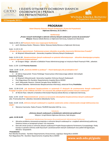 PROGRAM Dzień Otwarty Ochrony Danych Osobowych i Prawa do Prywatności Dąbrowa Górnicza, 22.11.2012 r. Konferencja „Prawo nowych technologii w zakresie ochrony danych osobowych i prawa do prywatności” Miejsce: Wyższa Szkoła Biznesu w Dąbrowie Górniczej, Audytorium Maximum Godz.11.00-11.10 Powitanie Gości oraz rozpoczęcie Konferencji prof. Zdzisława Dacko- Pikiewicz- Rektor Wyższej Szkoły Biznesu w Dąbrowie Górniczej Godz. 11.10-11.35 „Prawo do bycia zapomnianym. Podstawowe prawo człowieka czy groźba stworzenia Ministerstwa Prawdy?” dr Wojciech Wiewiórowski - Generalny Inspektor Ochrony Danych Osobowych Godz. 11.35-11.50 „Bezpieczeństwo danych osobowych w systemie informatycznym - aktualnie obowiązujące przepisy a obecne zagrożenia bezpieczeństwa” dr Grzegorz Sibiga- adiunkt w Zakładzie Prawa Administracyjnego w Instytucie Nauk Prawnych PAN , adwokat. Godz. 11.50- 12.00 Przerwa Kawowa Godz. 12.00- 12.30 „Kontrola GIODO w praktyce” – Panel dyskusyjny dla przedsiębiorców" Moderator: dr Adrian Kapczyński- Prezes Polskiego Towarzystwa Informatycznego oddział. Górnośląski Uczestnicy Panelu: dr Wojciech Wiewiórowski- Generalny Inspektor Ochrony Danych Osobowych Pani Bogusława Pilc-Dyrektor Departamentu Inspekcji Biura GIODO prof. Aleksander Nawrat- Członek Zarządu firmy WASKO S.A. Jarosław Żabówka- Administrator Bezpieczeństwa Informacji, właściciel firmy ProInfoSec Godz. 12.30-12.45 „Jak zbudować bezpieczeństwo w systemach IT służących do przetwarzania danych osobowych?. Przegląd narzędzi od ISO 27001do OCTAVE i ich znaczenia dla polityki bezpieczeństwa danych osobowych” dr Marek Pyka- Adiunkt w Katedrze Informatyki Wyższej Szkoły Biznesu w Dąbrowie Górniczej, Godz. 12.45- 13.20 "Odpowiedzialność prawna za naruszenie obowiązków bezpieczeństwa danych osobowych" adw. Przemysław Kral- adwokat, Kancelaria Adwokacka Tychy Godz. 13.20- 13.30 „Ochrona danych osobowych w aspekcie zawierania umów o dostarczanie energii elektrycznej oraz ciepła”. Marzena Czarnecka- Radca Prawny TAURON Sprzedaż GZE Sp. z o.o., Szkolenie „Ochrona danych osobowych w działalności administracji publicznej” Miejsce: Urząd Miasta Dąbrowa Górnicza, Sala Sesyjna godz. 14.30-16.00 Seminarium Szkoleniowe kierowane dla przedstawicieli Administracji Publicznej: Aktualne problemy stosowania przepisów o ochronie danych osobowych w urzędach administracji publicznej. Ostatnie zmiany w przepisach prawa i ich znaczenia. Kierunki zmian prawa w ochronie danych osobowych Projekt Rozporządzenia Parlamentu Europejskiego i Rady Europy w sprawie ochrony osób fizycznych i przetwarzaniem danych osobowych oraz pakiet deregulacyjny Ministra Gospodarki. Prowadzenie: Pani Monika Krasińska - Dyrektor Departamentu Orzecznictwa, Legislacji i Skarg Biura GIODO Pani Bogusława Pilc -Dyrektor Departamentu Inspekcji Biura GIODO www.wsb.edu.pl/giodo
