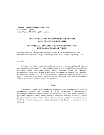 Wojciech Prochwicz, Szymon Zegar - II rok Koło Techniki Cyfrowej dr inż. Wojciech Mysiński – opiekun naukowy COMMUNICATIONS MICROPROCESSOR SYSTEM WITH PC USING BLUETOOTH KOMUNIKACJA SYSTEMU MIKROPROCESOROWEGO Z PC ZA POMOCĄ BLUETOOTH Keywords: Bluetooth, Atmega, communications, module HC-05, temperature sensor LM35 Słowa kluczowe: Bluetooth, Atmega, komunikacja, moduł HC-05, czujnik temperatury LM35 Ab s tra ct This paper presents the communication of a microprocessor system using Bluetooth wireless data transmission technology. The output module is based on an Atmega32, Bluetooth module and temperature sensor. Connections between HC-05 Bluetooth Module and ATmega32 microcontroller takes place through UART serial communication protocol. The ATmega32 microcontroller send data to PC. In terminal program we change state port microcontroller. In this paper is shown how create scheme, connection HC-05, temperature sensor with microcontroller and how do transmission and send data in two directions. 1. Wstęp W dzisiejszych czasach ciągle wzrasta liczba urządzeń elektronicznych mogących się ze sobą komunikować. Większa część systemów, w których wykorzystane są mikrokontrolery, wykorzystuje dodatkowo oprócz samego mikrokontrolera więcej lub mniej dodatkowych podukładów. Sprzętowe układy obsługi transmisji upraszczają realizacje transmisji od strony programowej jak również odciążają procesor. Właśnie dlatego, współczesne mikrokontrolery są zwykle dość bogato wyposażone w produkty obsługi transmisji danych i komunikacji z innymi układami. 2. Standard Bluetooth Bluetooth jest to technologia komunikacji bezprzewodowej krótkiego zasięgu między urządzeniami elektronicznymi. W życiu codziennym najczęściej spotykana jest w np. telefonach komórkowych, komputerach, laptopach, klawiaturach, drukarkach jak i wielu innych urządzeniach codziennego użytku (Rys1). Bluetooth jest to standard otwarty opisany w specyfikacji IEEE 802.15.1. Został opracowany w celu zastąpienia połączeń kablowych. Pierwszy standard był przedstawiony w 1999 roku przez pięć firm Ericsson, IBM, Intel, Nokia, Toshiba. Zatwierdzony przez IEEE w 2002 roku, obecnie dalej podlega modyfikacjom. Bluetooth wykorzystuje czterowarstwowy stos protokołów, transmisję pakietową, modulację FSK. Technologia korzysta z fal radiowych w paśmie ISM 2.4 Ghz. Jest to pasmo, które jest nielicencjonowane co pozwala nam korzystać w pełni darmowo i swobodnie z komunikacji. Rys.1 Przykładowe urządzenia wykorzystujące technologie Bluetooth Sieć w technologii Bluetooth nazywana jest pikosiecią (ang. Piconet). Zawiera ona jeden węzeł master i do siedmiu −węzłów typu slave. W jednym pomieszczeniu może znajdować się kilka pikosieci i mogą być one ze sobą połączone za pomocą węzła typu bridge (most). Połączone w ten sposób sieci nazywają się scatternet. Dodatkowo możliwe jest, aby w sieci pracowało do 255 węzłów zamiast 7. Muszą one pozostać w stanie synchronizacji z urządzeniem typu master. Pracują wtedy w trybie wyczekiwania i niskiego poboru mocy .Nie uczestniczą w transmisjach danych i oczekują na sygnał aktywacyjny od urządzenia master. Rys.2 Przykład połączenia dwóch pikosieci Urządzenia Bluetooth dzielimy ze względu na : Moc sygnału radiowego: • • • klasa 1 (100 mW) ma największy zasięg, teoretycznie do 100 m klasa 2 (2,5 mW) jest najpowszechniejsza w użyciu, teoretyczny zasięg do 10 m klasa 3 (1 mW) rzadko używana, z teoretycznym zasięgiem do 1 m Szybkość transmisji: • Bluetooth 1.0 – 21 kb/s • Bluetooth 1.1 – 124 kb/s • Bluetooth 1.2 – 328 kb/s • Bluetooth 2.0 + EDR – zwiększono transfer teoretyczny do 2,1 Mb/s • Bluetooth 3.0 + HS (High Speed) – 24 Mb/s (3 MB/s) • Bluetooth 3.1 + HS (High Speed) – 40 Mb/s (5 MB/s) • Bluetooth 4.0 + LE (Low Energy) – 1 Mb/s[4] znacząco ograniczono pobór energii, kosztem obniżonego transferu oraz zwiększono realny zasięg działania do 100 m • Bluetooth 4.1 - standard opracowany do zastosowania w tzw. "internecie rzeczy", umożliwiający bezpośrednią łączność urządzeń z internetem. • Bluetooth 4.2 - w stosunku do poprzednich wersji: szybszy transfer, wyższy poziom bezpieczeństwa, nawiązanie łączności z przedmiotami – łatwiejsze Bezpieczeństwo: Standard Bluetooth posiada wbudowane mechanizmy zabezpieczające takie jak: rozpoznawanie urządzenia, autoryzacja użytkownika, szyfrowanie przesyłanych danych. Mechanizmy te operują na warstwie zarządzania łącza, która należy do protokołów warstwy transportowej takich jak L2CAP i RFCOMM. Dodatkowo możemy wykorzystywać istniejące protokoły bezpieczeństwa takie jak TLS lub IPsec implementując je w warstwie transportowej. 3. Moduły wykorzystane w projekcie Modułem pozwalającym rozszerzyć nasz układ o transmisję bezprzewodową jest moduł HC-05. Jest to urządzenie typu Bluetooth-USART, które od strony mikrokontrolera widziane jest jak typowy port szeregowy USART. Z tego powodu możemy tworzyć oprogramowanie urządzenia w sposób analogiczny jak dla portu szeregowego. Układ najczęściej posiada adapter (niebieska część układu na fotografii Rys.3.), w którym może znajdować się regulator napięcia 3.3V, co zwalnia z konieczności stosowania dodatkowego dzielnika napięcia. Dodatkowo adapter ten posiada goldpiny, co umożliwia połączenie modułu z płytką stykową. Sterowanie modułem odbywa się za pomocą komend AT. Komendy te to określone ciągi znaków ASCII, które przesyła się do modułu HC-05 za pomocą interfejsu UART, z wykorzystaniem linii RxD oraz TxD modułu. Aby moduł HC-05 mógł odbierać komendy AT i reagować na nie, należy go odpowiednio skonfigurować. Parametry modułu HC-05: • • • • • • • • • Napięcie zasilania: o 5 V poprzez wbudowany stabilizator - podłączenie do pinu 5, o 3,3 V - podłączenie do pinu 3, pobór prądu: o pa