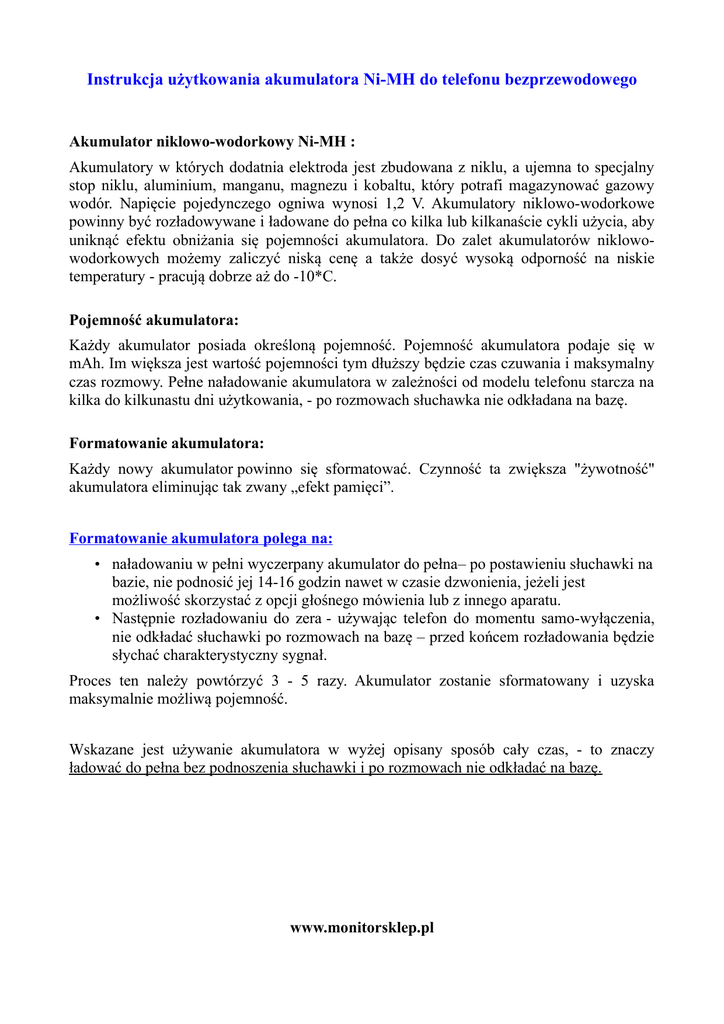 Instrukcja użytkowania akumulatora Ni-MH do telefonu bezprzewodowego Akumulator niklowo-wodorkowy Ni-MH : Akumulatory w których dodatnia elektroda jest zbudowana z niklu, a ujemna to specjalny stop niklu, aluminium, manganu, magnezu i kobaltu, który potrafi magazynować gazowy wodór. Napięcie pojedynczego ogniwa wynosi 1,2 V. Akumulatory niklowo-wodorkowe powinny być rozładowywane i ładowane do pełna co kilka lub kilkanaście cykli użycia, aby uniknąć efektu obniżania się pojemności akumulatora. Do zalet akumulatorów niklowowodorkowych możemy zaliczyć niską cenę a także dosyć wysoką odporność na niskie temperatury - pracują dobrze aż do -10*C. Pojemność akumulatora: Każdy akumulator posiada określoną pojemność. Pojemność akumulatora podaje się w mAh. Im większa jest wartość pojemności tym dłuższy będzie czas czuwania i maksymalny czas rozmowy. Pełne naładowanie akumulatora w zależności od modelu telefonu starcza na kilka do kilkunastu dni użytkowania, - po rozmowach słuchawka nie odkładana na bazę. Formatowanie akumulatora: Każdy nowy akumulator powinno się sformatować. Czynność ta zwiększa "żywotność" akumulatora eliminując tak zwany „efekt pamięci”. Formatowanie akumulatora polega na: • naładowaniu w pełni wyczerpany akumulator do pełna– po postawieniu słuchawki na bazie, nie podnosić jej 14-16 godzin nawet w czasie dzwonienia, jeżeli jest możliwość skorzystać z opcji głośnego mówienia lub z innego aparatu. • Następnie rozładowaniu do zera - używając telefon do momentu samo-wyłączenia, nie odkładać słuchawki po rozmowach na bazę – przed końcem rozładowania będzie słychać charakterystyczny sygnał. Proces ten należy powtórzyć 3 - 5 razy. Akumulator zostanie sformatowany i uzyska maksymalnie możliwą pojemność. Wskazane jest używanie akumulatora w wyżej opisany sposób cały czas, - to znaczy ładować do pełna bez podnoszenia słuchawki i po rozmowach nie odkładać na bazę. www.monitorsklep.pl