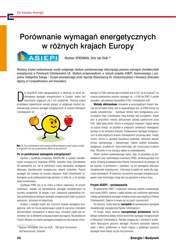 Ze świata energii Porównanie wymagań energetycznych w różnych krajach Europy Marleen SPIEKMAN, Dick van DIJK *) Niniejszy artykuł podsumowuje wyniki wstępnego studium porównawczego dotyczącego poziomu wymagań charakterystyki energetycznej w Państwach Członkowskich UE. Studium przeprowadzono w ramach projektu ASIEPI, finansowanego z programu Inteligentna Energia – Europa prowadzonego przez Agencję Wykonawczą ds. Konkurencyjności i Innowacji (Executive Agency of Competitiveness and Innovation). D la wszystkich osób zaangażowanych w dyskusję na temat porównywania wymagań energetycznych w Europie, ważne jest zrozumienie wiążących się z tym problemów. Poniższy artykuł przedstawia najważniejsze wnioski płynące ze wstępnego studium porównawczego poziomu wymagań energetycznych w czterech Państwach Członkowskich UE. Rys. 1. Czy porównywanie obliczonego według krajowych zasad zużycia energii w budynkach jest jak porównywanie jabłek do pomarańczy? Po co porównywać wymagania energetyczne? Zgodnie z Dyrektywą Europejską 2002/91/WE w sprawie charakterystyki energetycznej budynków (EPBD), wszystkie Kraje Członkowskie UE wprowadziły już, lub w najbliższym czasie wprowadzą, wymagania dotyczące charakterystyki energetycznej nowych budynków. Poziom wymagań jest ustalany na szczeblu krajowym. Kraje Członkowskie zobowiązane są do podwyższania tego poziomu co kilka lat, a ich postępy będą monitorowane. Dyrektywa EPBD jest w tej chwili w trakcie nowelizacji. W ramach nowelizacji, rozważa się wprowadzenie wymagań energetycznych na szczeblu europejskim. W związku z tym, znalezienie odpowiedniej metody porównywania krajowych wymagań energetycznych stało się jeszcze ważniejsze i pilniejsze niż dotychczas. Osobom z zewnątrz trudno jest zrozumieć krajowe wymagania energetyczne. Jeśli nie ma się wystarczająco często do czynienia z metodami obliczeniowymi stosowanymi w danym kraju, niezwykle ciężko jest zorientować się co dokładnie oznaczają krajowe wymagania. Na przykład we Flandrii (Belgia) minimalne wymagania energetyczne dla budynku miesz*) Marleen SPIEKMAN, Dick van DIJK – TNO Built Environment and Geosciences, Holandia 32 kalnego to E100, podczas gdy w Holandii jest to 0,8. Co to oznacza? I co oznacza podniesienie poziomu wymagań np. z E100 do E90? A przede wszystkim, jak porównać flamandzkie E100 z holenderskim 0,8? Metody obliczeniowe stosowane w poszczególnych krajach również się od siebie różnią. Jest to spowodowane tym, że EPBD kieruje się zasadą subsydiarności – dyrektywa określa ramy postępowania a poszczególne Kraje Członkowskie mają kontrolę nad szczegółami. Nawet jeśli w przyszłości metody obliczeniowe zostaną ujednolicone przez CEN, nadal będą istnieć różnice w przepisach krajowych mające wpływ na zużycie energii, na przykład w przepisach sanitarnych stawiających wymogi co do wentylacji budynku. Porównywanie wymagań energetycznych w poszczególnych Krajach Członkowskich utrudniają także, między innymi, różnice w sposobie klasyfikacji budynków, odmienne warunki klimatu wewnętrznego i zewnętrznego, lokalne praktyki budowlane, dostępność, przydatność i koszt technologii, jak i koszty pracy w danym kraju. Wszystko to ma znaczący wpływ na ustawodawstwo. Wyniki studium porównawczego oprócz tego, że przydadzą się prawodawcom przy nadchodzącej nowelizacji EPBD, zainteresują także inne strony. Pozwolą przedstawicielom Państw Członkowskich zorientować się jak wysokie, w porównaniu z sąsiadami, są ich wymagania dotyczące charakterystyki energetycznej. Informacja ta będzie też ważna dla organizacji branżowych. W zależności od poziomu wymagań energetycznych, pewne nowe technologie mogą stać się popularne w danym kraju. Projekt ASIEPI – porównywanie W październiku 2007 r. rozpoczęto realizację projektu europejskiego pod nazwą ASIEPI. Jednym z zadań projektu jest znalezienie optymalnej metody porównywania wymagań energetycznych poszczególnych Państw Członkowskich. Zadanie to skupia się na trzech czynnościach: Po pierwsze, trzeba stworzyć narzędzie do porównywania wymogów charakterystyki energetycznej Państw Członkowskich. Po drugie, należy dokonać rzeczywistego porównania. Wyniki takiego porównania pokażą różnice poziomów wymagań energetycznych w Państwach Członkowskich. Państwa zmagają się z rozmaitymi problemami dotyczącymi poziomu wymagań. Poznanie sposobów radzenia sobie z takimi problemami w innych krajach o podobnym poziomie wymagań może okazać się dla nich pomocne. Energia i Budynek Ze świata energii Rys. 2. Nawet powierzchnia użytkowa tego samego budynku może być inna, jeśli obliczy się ją według przepisów obowiązujących w różnych krajach. Wykres przedstawia wyniki z Flandrii, Holandii, Niemiec i Francji. Tak więc trzecią czynnością będzie identyfikacja potencjalnych barier i przykładów dobrych praktyk w rozwiązywaniu tego typu problemów. Wyzwania związane z porównywaniem Zaczęto już prowadzić badania mające na celu porównanie poziomów wymagań charakterystyki energetycznej w kilku sąsiadujących ze sobą krajach europejskich. Rządy Flandrii [1], Irlandii [2], Szkocji [3] i Niemiec zapoczątkowały tego rodzaju inicjatywy. Wnioski wyciągnięte z tych badań pokazują, z jakimi problemami trzeba będzie się zmierzyć w badaniach na większą skalę, porównujących poziom wymagań energetycznych w całej Europie. Wyciągnięto pierwsze, następujące wnioski (głównie ze studium flamandzkiego): 1) Jednym z możliwych sposobów porównania poziomów wymagań charakterystyki energetycznej jest wybranie przykładowego budynku i obliczenie jak jego charakterystyka energetyczna ma się do minimalnych wymogów w każdym z krajów. Obliczenie charakterystyki energetycznej w pełni opisanego zagranicznego budynku według krajowej metody obliczeniowej wydaje się być łat
