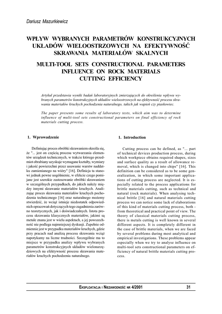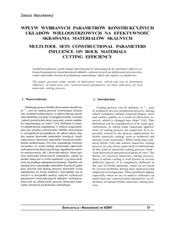 Dariusz Mazurkiewicz WP£YW WYBRANYCH PARAMETRÓW KONSTRUKCYJNYCH UK£ADÓW WIELOOSTRZOWYCH NA EFEKTYWNOÆ SKRAWANIA MATERIA£ÓW SKALNYCH MULTI-TOOL SETS CONSTRUCTIONAL PARAMETERS INFLUENCE ON ROCK MATERIALS CUTTING EFFICIENCY Artyku³ przedstawia wyniki badañ laboratoryjnych zmierzaj¹cych do okrelenia wp³ywu wybranych parametrów konstrukcyjnych uk³adów wieloostrzowych na efektywnoæ procesu skrawania materia³ów kruchych pochodzenia naturalnego, takich jak wapieñ czy piaskowiec. The paper presents some results of laboratory tests, which aim was to determine influence of multi-tool sets constructional parameters on final efficiency of rock materials cutting process. 1. Wprowadzenie 1. Introduction Definiuj¹c proces obróbki skrawaniem okrela siê, ¿e "... jest on czêci¹ procesu wytwarzania elementów urz¹dzeñ technicznych, w trakcie którego przedmiot obrabiany uzyskuje wymagane kszta³ty, wymiary i jakoæ powierzchni przez usuwanie warstw naddatku zamienianego na wióry" [16]. Definicja ta stanowi jednak pewne uogólnienie, w efekcie czego pomijane jest szerokie zastosowanie obróbki skrawaniem w szczególnych przypadkach, do jakich nale¿y miêdzy innymi skrawanie materia³ów kruchych. Analizuj¹c proces skrawania materia³ów kruchych pochodzenia technicznego [16] oraz naturalnego mo¿emy stwierdziæ, ¿e wci¹¿ istnieje niedostatek odpowiednich opracowañ dotycz¹cych tego zagadnienia zarówno teoretycznych, jak i dowiadczalnych. Istota procesu skrawania klasycznych materia³ów, jakimi s¹ metale znana jest w wielu aspektach, a jej powszechnoæ nie podlega najmniejszej dyskusji. Zupe³nie odmiennie jest w przypadku materia³ów kruchych, gdzie przy pracach nad analiz¹ procesu skrawania wci¹¿ napotykamy na liczne trudnoci. Szczególnie ma to miejsce w przypadku analizy wp³ywu wybranych parametrów konstrukcyjnych uk³adów wielonarzêdziowych na efektywnoæ procesu skrawania materia³ów kruchych pochodzenia naturalnego. Cutting process can be defined, as "... part of technical devices production process, during which workpiece obtains required shapes, sizes and surface quality as a result of allowance removal, which is changed into chips" [16]. This definition can be considered as to be some generalization, in which some important applications of cutting process are neglected. It is especially related to the process applications for brittle materials cutting, such as technical and natural (rock materials). When analysing technical brittle [16] and natural materials cutting process we can notice some lack of elaborations of this kind of materials cutting process, both from theoretical and practical point of view. The theory of classical materials cutting process, there is metals cutting is well known in several different aspects. It is completely different in the case of brittle materials, when we are faced by several problems during most analytical and empirical investigations. These problems appear especially when we try to analyse influence on multi-tool sets constructional parameters on efficiency of natural brittle materials cutting process. EKSPLOATACJA I NIEZAWODNOÆ NR 4/2001 31 NAUKA I TECHNIKA 2. Skrawanie ska³ g³owicami wieloostrzowymi w wietle rozwa¿añ literaturowych 2. Rock cutting with multi-tool heads in literature Z przeprowadzonych dotychczas badañ [m.in.: 1, 2, 3, 4, 6, 7, 8, 9, 15, 17, 18] zmierzaj¹cych do okrelenia optymalnych wartoci parametrów procesu skrawania ska³ w uk³adach wieloostrzowych wynika, ¿e jest to zagadnienie z³o¿one i nie poznane odpowiednio dok³adnie. Otrzymywane wyniki badañ w tym zakresie s¹ doæ rozbie¿ne. Mo¿e to byæ miêdzy innymi efektem ró¿nicy geometrii narzêdzi skrawaj¹cych stosowanych w badaniach, jak i ró¿nic na przyk³ad k¹ta bocznego rozkruszenia wynikaj¹cych ze zró¿nicowanych w³aciwoci badanych materia³ów skalnych, kierunku skrawania oraz g³êbokoci skrawania. Ró¿nice te prawdopodobnie wynikaj¹ równie¿ z faktu analizowania procesu skrawania materia³ów kruchych wy³¹cznie w uk³adzie jednego ostrza, co stanowi istotne uproszczenie. Z przeprowadzonej przez autora analizy dotychczasowego stanu wiedzy z zakresu badania procesu skrawania ska³ g³owicami wieloostrzowymi wynikaj¹ miêdzy innymi nastêpuj¹ce wnioski: Several experimental and theoretical investigations, which aim was to determine optimal values of rock cutting parameters with the use of multi-tool sets prove, that this topic is complex and not well enough known [1, 2, 3, 4, 6, 7, 8, 9, 15, 17, 18]. Results obtained from these investigations and researches are usually different and for several reasons cannot be compared. These differences in results obtained during experiments come from differences in geometry of cutting tools used in tests, differences of cut materials mechanical and physical properties, cutting direction or cutting depth. Another explanation of these differences is also typical way of process analysis. Most researchers analyse the process only from one, single cutting tool point of view. This way of analysis can be described as important simplification of real conditions, having huge influence on final results. From author's literature studies on analysis and investigations of multi-pick cutting process parameters (especially in the case of natural brittle materials), follow such inferences as: • analizuj¹c parametry konstrukcyjne elementu ro- • When analysing constructional parameters of cutting • • • • • boczego, dotycz¹ce skrawania ska³ w uk³adzie wieloostrzowym nale¿y braæ pod uwagê cechy konstrukcyjne g³owicy skrawaj¹cej oraz rozmieszczenie no¿y, uwzglêdniaj¹c podzia³kê poprzeczn¹ t i podzia³kê k¹tow¹ t0, liczbê linii skrawania oraz liczbê no¿y w jednej linii, podstawowym parametrem decyduj¹cym o wielkoci si³ wystêpuj¹cych w procesie skrawania materia³ów kruchych oraz wartoci energii jednostkowej jest podzia³ka linii skrawania (podzia³ka poprzecz
