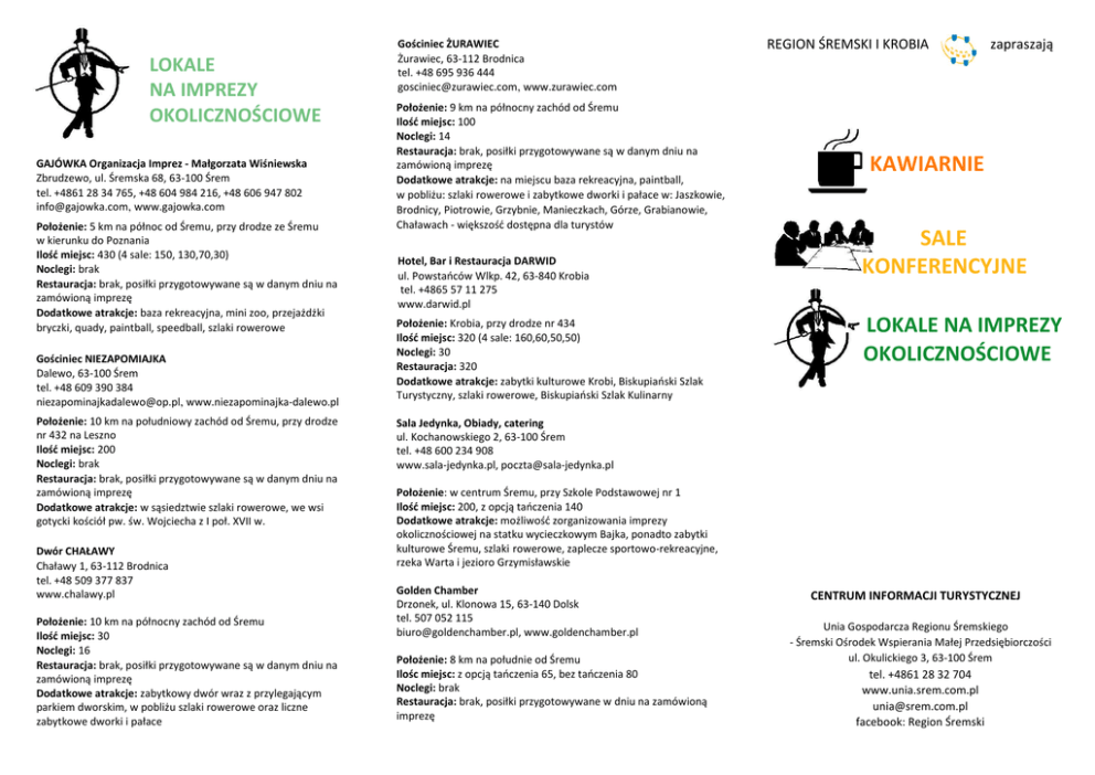 LOKALE NA IMPREZY OKOLICZNOŚCIOWE GAJÓWKA Organizacja Imprez - Małgorzata Wiśniewska Zbrudzewo, ul. Śremska 68, 63-100 Śrem tel. +4861 28 34 765, +48 604 984 216, +48 606 947 802 [email protected], www.gajowka.com Położenie: 5 km na północ od Śremu, przy drodze ze Śremu w kierunku do Poznania Ilość miejsc: 430 (4 sale: 150, 130,70,30) Noclegi: brak Restauracja: brak, posiłki przygotowywane są w danym dniu na zamówioną imprezę Dodatkowe atrakcje: baza rekreacyjna, mini zoo, przejażdżki bryczki, quady, paintball, speedball, szlaki rowerowe Gościniec NIEZAPOMIAJKA Dalewo, 63-100 Śrem tel. +48 609 390 384 [email protected], www.niezapominajka-dalewo.pl Położenie: 10 km na południowy zachód od Śremu, przy drodze nr 432 na Leszno Ilość miejsc: 200 Noclegi: brak Restauracja: brak, posiłki przygotowywane są w danym dniu na zamówioną imprezę Dodatkowe atrakcje: w sąsiedztwie szlaki rowerowe, we wsi gotycki kościół pw. św. Wojciecha z I poł. XVII w. Dwór CHAŁAWY Chaławy 1, 63-112 Brodnica tel. +48 509 377 837 www.chalawy.pl Położenie: 10 km na północny zachód od Śremu Ilość miejsc: 30 Noclegi: 16 Restauracja: brak, posiłki przygotowywane są w danym dniu na zamówioną imprezę Dodatkowe atrakcje: zabytkowy dwór wraz z przylegającym parkiem dworskim, w pobliżu szlaki rowerowe oraz liczne zabytkowe dworki i pałace Gościniec ŻURAWIEC Żurawiec, 63-112 Brodnica tel. +48 695 936 444 [email protected], www.zurawiec.com Położenie: 9 km na północny zachód od Śremu Ilość miejsc: 100 Noclegi: 14 Restauracja: brak, posiłki przygotowywane są w danym dniu na zamówioną imprezę Dodatkowe atrakcje: na miejscu baza rekreacyjna, paintball, w pobliżu: szlaki rowerowe i zabytkowe dworki i pałace w: Jaszkowie, Brodnicy, Piotrowie, Grzybnie, Manieczkach, Górze, Grabianowie, Chaławach - większość dostępna dla turystów Hotel, Bar i Restauracja DARWID ul. Powstańców Wlkp. 42, 63-840 Krobia tel. +4865 57 11 275 www.darwid.pl Położenie: Krobia, przy drodze nr 434 Ilość miejsc: 320 (4 sale: 160,60,50,50) Noclegi: 30 Restauracja: 320 Dodatkowe atrakcje: zabytki kulturowe Krobi, Biskupiański Szlak Turystyczny, szlaki rowerowe, Biskupiański Szlak Kulinarny REGION ŚREMSKI I KROBIA zapraszają KAWIARNIE SALE KONFERENCYJNE LOKALE NA IMPREZY OKOLICZNOŚCIOWE Sala Jedynka, Obiady, catering ul. Kochanowskiego 2, 63-100 Śrem tel. +48 600 234 908 www.sala-jedynka.pl, [email protected] Położenie: w centrum Śremu, przy Szkole Podstawowej nr 1 Ilość miejsc: 200, z opcją tańczenia 140 Dodatkowe atrakcje: możliwość zorganizowania imprezy okolicznościowej na statku wycieczkowym Bajka, ponadto zabytki kulturowe Śremu, szlaki rowerowe, zaplecze sportowo-rekreacyjne, rzeka Warta i jezioro Grzymisławskie Golden Chamber Drzonek, ul. Klonowa 15, 63-140 Dolsk tel. 507 052 115 [email protected], www.goldenchamber.pl Położenie: 8 km na południe od Śremu Ilośc miejsc: z opcją tańczenia 65, bez tańczenia 80 Noclegi: brak Restauracja: brak, posiłki przygotowywane w dniu na zamówioną imprezę CENTRUM INFORMACJI TURYSTYCZNEJ Unia Gospodarcza Regionu Śremskiego - Śremski Ośrodek Wspierania Małej Przedsiębiorczości ul. Okulickiego 3, 63-100 Śrem tel. +4861 28 32 704 www.unia.srem.com.pl [email protected] facebook: Region Śremski KAWIARNIE Choco cafe “Pod manekinem” ul. 1 Maja 5 Galeria Handlowa, 63-100 Śrem tel. +4861 28 28 023 Czynne: poniedziałek-piątek 11.00-19.00, sobota 10.00-15.00 Położenie: Śrem, osiedle Jeziorany Ilość miejsc: 22 Restauracja CAFE OLE Plac 20 Października 4, 63-100 Śrem tel. +4861 28 10 190 [email protected] www.cafeole.com.pl Czynne: poniedziałek-piątek 8.30-22.00, sobota 10.00-22.00, niedziela 12.00-20.00 Położenie: rynek w Śremie Ilość miejsc: 80 Księgarnia przy Rynku, Klubokawiarnia, Miejskie Centrum Informacji CAFE TEJ Plac 20 Października 11, 63-100 Śrem tel. +4861 28 30 614, +48 600 924 173 [email protected] www.cafetej.pl Czynne: poniedziałek-piątek 8.30-18.00, sobota 9.00-13.00 Położenie: rynek w Śremie. Cafe Tej to połączenie księgarni, kawiarni z informacją miejską. Ilość miejsc: 20 Kawiarnia SOWA ul. Chłapowskiego 28 lokal 8, 63-100 Śrem tel. +4861 28 30 059 Czynne: poniedziałek-piątek 9.00-20.00, sobota 9.00-20.00, niedziela 10.00-16.00 Położenie: Śrem, osiedle Jeziorany Ilość miejsc: 6 Restauracja, Kawiarnia DON GIOVANNI ul. Nadbrzeżna 1/D1, 63-100 Śrem tel. 4861 28 29 920, +48 500 128 221 [email protected] www.dongiovanni.pl Czynne: poniedziałek-czwartek 9.00-22.00, piątek 9.00-24.00, sobota 10.00-24.00, niedziela 12.00-22.00 Położenie: Śrem, przy promenadzie Ilość miejsc: 60 Kawiarnia EMAUS ul. Kilińskiego 23, 63-100 Śrem tel. +4861 28 34 358, +4861 28 34 283 Czynne: sobota-poniedziałek 10.00-20.00, wtorek-piątek 10.00-21.00 Położenie: przy kościele pw. Najświętszego Serca Jezusa, zarządzana jest przez parafię Ilość miejsc: 140 (kawiarnia na 20 miejsc) Dodatkowe atrakcje: zabytki kulturowe Śremu, zaplecze sportoworekreacyjne, Jezioro Grzymisławskie, rzeka Warta, szlaki rowerowe SALE KONFERENCYJNE I BIESIADNE PAŁAC W JASZKOWIE Centrum Hipiki Antoniego Chłapowskiego Jaszkowo 16, 63-112 Brodnica tel. +4861 28 37 556 [email protected] www.centrumhipiki.com Położenie: 8 km na północ od Śremu Ilość miejsc: 190 (3 sale: 150, 20, 20) Noclegi: 87 Restauracja: 120 miejsc oraz 30 w Karczmie Kuźnia Dodatkowe atrakcje: nauka jazdy konnej, przejażdżki bryczką, sklep jeździecki, sauna, winiarnia, przystań rzeczna, mini zoo, w sąsiedztwie szlaki rowerowe i piesze, Rogaliński Park Krajobrazowy Hotel VILLA NATURA ul. Podrzekta 3, 63-140 Dolsk tel. +4861 28 25 253 [email protected] www.villanatura.pl Położenie: 12 km na południe od Śremu Ilość miejsc: 355 (4 sale: 200, 70, 70, 15) Noclegi: 150 Restauracja: 100 Dodatkowe atrakcje: spa, nauka jazdy konnej, przejażdżki bryczką, sauna, bowling, wypożyczalnia rowerów, boiska