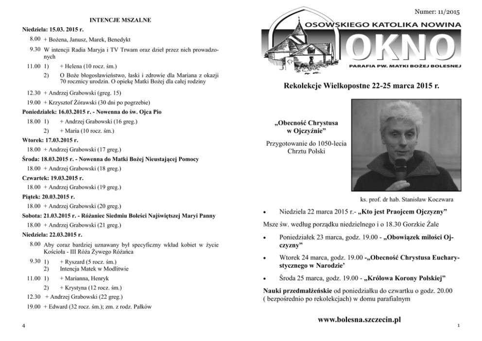 Numer: 11/2015 INTENCJE MSZALNE Niedziela: 15.03. 2015 r. 8.00 + Bożena, Janusz, Marek, Benedykt 9.30 W intencji Radia Maryja i TV Trwam oraz dzieł przez nich prowadzonych 11.00 1) 2) + Helena (10 rocz. śm.) O Boże błogosławieństwo, łaski i zdrowie dla Mariana z okazji 70 rocznicy urodzin. O opiekę Matki Bożej dla całej rodziny Rekolekcje Wielkopostne 22-25 marca 2015 r. 12.30 + Andrzej Grabowski (greg. 15) 19.00 + Krzysztof Żórawski (30 dni po pogrzebie) Poniedziałek: 16.03.2015 r. - Nowenna do św. Ojca Pio 18.00 1) 2) + Andrzej Grabowski (16 greg.) „Obecność Chrystusa w Ojczyźnie” + Maria (10 rocz. śm.) Wtorek: 17.03.2015 r. Przygotowanie do 1050-lecia Chrztu Polski 18.00 + Andrzej Grabowski (17 greg.) Środa: 18.03.2015 r. - Nowenna do Matki Bożej Nieustającej Pomocy 18.00 + Andrzej Grabowski (18 greg.) Czwartek: 19.03.2015 r. 18.00 + Andrzej Grabowski (19 greg.) Piątek: 20.03.2015 r. 18.00 + Andrzej Grabowski (20 greg.) Sobota: 21.03.2015 r. - Różaniec Siedmiu Boleści Najświętszej Maryi Panny 18.00 + Andrzej Grabowski (21 greg.) Niedziela: 22.03.2015 r. 11.00 1) 2) Niedziela 22 marca 2015 r.- „Kto jest Praojcem Ojczyzny” Msze św. według porządku niedzielnego i o 18.30 Gorzkie Żale Poniedziałek 23 marca, godz. 19.00 - „Obowiązek miłości Ojczyzny” Wtorek 24 marca, godz. 19.00 -„Obecność Chrystusa Eucharystycznego w Narodzie’ + Marianna, Henryk Środa 25 marca, godz. 19.00 - „Królowa Korony Polskiej” + Krystyna (12 rocz. śm.) Nauki przedmałżeńskie od poniedziałku do czwartku o godz. 20.00 ( bezpośrednio po rekolekcjach) w domu parafialnym 8.00 Aby coraz bardziej uznawany był specyficzny wkład kobiet w życie Kościoła - III Róża Żywego Różańca 9.30 1) 2) ks. prof. dr hab. Stanisław Koczwara + Ryszard (5 rocz. śm.) Intencja Matek w Modlitwie 12.30 + Andrzej Grabowski (22 greg.) 19.00 + Edward (32 rocz. śm.); zm. z rodz. Pałków 4 www.bolesna.szczecin.pl 1 Liturgia słowa – IV niedziela Wielkiego Postu I czytanie (2 Krn 36,14-16.19-23) Wszyscy naczelnicy Judy, kapłani i lud, mnożyli nieprawości, naśladując wszelkie obrzydliwości narodów pogańskich i bezczeszcząc świątynię, którą Pan poświęcił w Jerozolimie. Pan, Bóg ich ojców, bez wytchnienia wysłał do nich swoich posłańców, albowiem litował się nad swym ludem i nad swym mieszkaniem. Oni jednak szydzili z Bożych wysłanników, lekceważyli ich słowa i wyśmiewali się z Jego proroków, aż wzmógł się gniew Pana na swój naród do tego stopnia, iż nie było już ocalenia. Spalili też Chaldejczycy świątynię Bożą i zburzyli mury Jerozolimy, wszystkie jej pałace spalili ogniem i wzięli się do niszczenia wszystkich kosztownych sprzętów. Ocalałą spod miecza resztę król uprowadził do Babilonu i stali się niewolnikami jego i jego synów, aż do nadejścia panowania perskiego. I tak się spełniło słowo Pańskie, wypowiedziane przez usta Jeremiasza: Dokąd kraj nie wywiąże się ze swych szabatów, będzie leżał odłogiem przez cały czas swego zniszczenia, to jest przez siedemdziesiąt lat. Aby się spełniło słowo Pańskie, z ust Jeremiasza, pobudził Pan ducha Cyrusa, króla perskiego, w pierwszym roku jego panowania, tak iż obwieścił on również na piśmie w całym państwie swoim, co następuje: Tak mówi Cyrus, król perski: Wszystkie państwa ziemi dał mi Pan, Bóg niebios. I On mi rozkazał zbudować Mu dom w Jerozolimie, w Judzie. Jeśli z całego ludu Jego jest między wami jeszcze ktoś, to niech Bóg jego będzie z nim, a niech idzie! II czytanie (Ef 2,4-10) Bóg, będąc bogaty w miłosierdzie, przez wielką swą miłość, jaką nas umiłował, i to nas, umarłych na skutek występków, razem z Chrystusem przywrócił do życia. Łaską bowiem jesteście zbawieni. Razem też wskrzesił i razem posadził na wyżynach niebieskich - w Chrystusie Jezusie, aby w nadchodzących wiekach przemożne bogactwo Jego łaski wykazać na przykładzie dobroci względem nas, w Chrystusie Jezusie. Łaską bowiem jesteście zbawieni przez wiarę. A to pochodzi nie od was, lecz jest darem Boga: nie z uczynków, aby się nikt nie chlubił. Jesteśmy bowiem Jego dziełem, stworzeni w Chrystusie Jezusie dla dobrych czynów, które Bóg z góry przygotował, abyśmy je pełnili. Ewangelia (J 3,14-21) A jak Mojżesz wywyższył węża na pustyni, tak potrzeba, by wywyższono Syna Człowieczego, aby każdy, kto w Niego wierzy, miał życie wieczne. Tak bowiem Bóg umiłował świat, że Syna swego Jednorodzonego dał, aby każdy, kto w Niego wierzy, nie zginął, ale miał życie wieczne. Albowiem Bóg nie posłał swego Syna na świat po to, aby świat potępił, ale po to, by świat został przez Niego zbawiony. Kto wierzy w Niego, nie podlega potępieniu; a kto nie wierzy, już został potępiony, bo nie uwierzył w imię Jednorodzonego Syna Bożego. A sąd polega na tym, że światło przyszło na świat, lecz ludzie bardziej umiłowali ciemność aniżeli światło: bo złe były ich uczynki. Każdy bowiem, kto się dopuszcza nieprawości, nienawidzi światła i nie zbliża się do światła, aby nie potępiono jego uczynków. Kto spełnia wymagania prawdy, zbliża się do światła, aby się okazało, że jego uczynki są dokonane w Bogu. 2 Ogłoszenia duszpasterskie - 15.03.2015 r. 1. Zapraszamy na nabożeństwa w naszym kościele: Nabożeństwo do świętego Ojca Pio w poniedziałek przed Mszą św. wieczorną; Nowenna do Matki Bożej Nieustającej Pomocy w środę przed Mszą św. wieczorną; Droga Krzyżowa w piątki Wielkiego Postu o godz. 1730 dla dzieci oraz o 1830 dla dorosłych i młodzieży; Różaniec Siedmiu Boleści Najświętszej Maryi Panny w sobotę po Mszy św. wieczornej; Gorzkie Żale z kazaniem pasyjnym we wszystkie niedziele Wielkiego Postu o godz. 1830. 2. Spotkania formacyjne w domu parafialnym: Dzieci przygotowujące się do I Komunii świętej w poniedziałek 16 mara o godz. 1830; koło plas