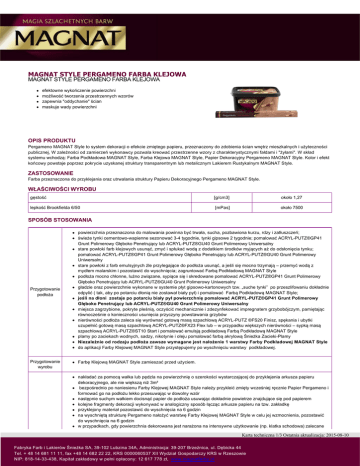 MAGNAT STYLE PERGAMENO FARBA KLEJOWA MAGNAT STYLE PERGAMENO FARBA KLEJOWA efektowne wykończenie powierzchni możliwość tworzenia przestrzennych wzorów zapewnia "oddychanie" ścian maskuje wady powierzchni OPIS PRODUKTU Pergameno MAGNAT Style to system dekoracji o efekcie zmiętego papieru, przeznaczony do zdobienia ścian wnętrz mieszkalnych i użyteczności publicznej, W zależności od zamierzeń wykonawcy pozwala kreować przestrzenne wzory z charakterystycznymi fałdami i "żyłami". W skład systemu wchodzą: Farba Podkładowa MAGNAT Style, Farba Klejowa MAGNAT Style, Papier Dekoracyjny Pergameno MAGNAT Style. Kolor i efekt końcowy powstaje poprzez pokrycie uzyskanej struktury transparentnym lub metalicznym Lakierem Rustykalnym MAGNAT Style. ZASTOSOWANIE Farba przeznaczona do przyklejania oraz utrwalania struktury Papieru Dekoracyjnego Pergameno MAGNAT Style. WŁAŚCIWOŚCI WYROBU gęstość [g/cm3] około 1,27 lepkość Brookfielda 6/50 [mPas] około 7500 SPOSÓB STOSOWANIA Przygotowanie podłoża Przygotowanie wyrobu powierzchnia przeznaczona do malowania powinna być trwała, sucha, pozbawiona kurzu, rdzy i zatłuszczeń; świeże tynki cementowowapienne sezonować 34 tygodnie, tynki gipsowe 2 tygodnie; pomalować ACRYLPUTZ®GP41 Grunt Polimerowy Głęboko Penetrujący lub ACRYLPUTZ®GU40 Grunt Polimerowy Uniwersalny stare powłoki farb klejowych usunąć, zmyć i spłukać wodą z dodatkiem środków myjących aż do odsłonięcia tynku; pomalować ACRYLPUTZ®GP41 Grunt Polimerowy Głęboko Penetrujący lub ACRYLPUTZ®GU40 Grunt Polimerowy Uniwersalny stare powłoki z farb emulsyjnych źle przylegające do podłoża usunąć, a jeśli się mocno trzymają – przemyć wodą z mydłem malarskim i pozostawić do wyschnięcia; zagruntować Farbą Podkładową MAGNAT Style podłoża mocno chłonne, luźno związane, sypiące się i skredowane pomalować ACRYLPUTZ®GP41 Grunt Polimerowy Głęboko Penetrujący lub ACRYLPUTZ®GU40 Grunt Polimerowy Uniwersalny gładzie oraz powierzchnie wykonane w systemie płyt gipsowokartonowych tzw. „suche tynki” po przeszlifowaniu dokładnie odpylić ( tak, aby po potarciu dłonią nie zostawał biały pył) i pomalować Farbą Podkładową MAGNAT Style; jeśli na dłoni zostaje po potarciu biały pył powierzchnię pomalować ACRYLPUTZ®GP41 Grunt Polimerowy Głęboko Penetrujący lub ACRYLPUTZ®GU40 Grunt Polimerowy Uniwersalny miejsca zagrzybione, pokryte pleśnią, oczyścić mechanicznie i zdezynfekować impregnatem grzybobójczym, pamiętając równocześnie o konieczności usunięcia przyczyny powstawania grzybów nierówności podłoża zaleca się wyrównać gotową masą szpachlową ACRYLPUTZ ®FS20 Finisz, spękania i ubytki uzupełnić gotową masą szpachlową ACRYLPUTZ®FX23 Flex lub – w przypadku większych nierówności – sypką masą szpachlową ACRYLPUTZ®ST10 Start i pomalować emulsją podkładową Farbą Podkładową MAGNAT Style plamy po zaciekach wodnych, sadzy, nikotynie i oleju pomalować farbą akrylową Śnieżka ZaciekiPlamy Niezależnie od rodzaju podłoża zawsze wymagane jest nałożenie 1 warstwy Farby Podkładowej MAGNAT Style do aplikacji Farby Klejowej MAGNAT Style przystępujemy po wyschnięciu warstwy podkładowej. Farbę Klejową MAGNAT Style zamieszać przed użyciem. nakładać za pomocą wałka lub pędzla na powierzchnię o szerokości wystarczającej do przyklejenia arkusza papieru dekoracyjnego, ale nie większą niż 3m² bezpośrednio po naniesienu Farby Klejowej MAGNAT Style należy przykleić zmięty wcześniej ręcznie Papier Pergameno i formować go na podłożu lekko przesuwając w dowolny wzór następnie suchym wałkiem docisnąć papier do podłoża usuwając dokładnie powietrze znajdujące się pod papierem kolejne fragmenty dekoracji wykonywać w analogiczny sposób łącząc arkusze papieru na tzw. zakładkę przyklejony materiał pozostawić do wyschnięcia na 6 godzin na wyschniętą strukturę Pergameno nałożyć warstwę Farby Klejowej MAGNAT Style w celu jej wzmocnienia, pozostawić do wyschnięcia na 6 godzin w przypadkach, gdy powierzchnia dekorowana jest narażona na intensywne użytkowanie (np. klatka schodowa) zalecane Karta techniczna 1/3 Ostatnia aktualizacja: 2015-08-10 Fabryka Farb i Lakierów Śnieżka SA, 39102 Lubzina 34A, Administracja: 39207 Brzeźnica, ul. Dębicka 44 Tel. + 48 14 681 11 11, fax +48 14 682 22 22, KRS 0000060537 XII Wydział Gospodarczy KRS w Rzeszowie NIP: 8181433438, Kapitał zakładowy w pełni opłacony: 12 617 778 zł, www.magnatfarby.pl jest nałożenie dwóch warstw Farby Klejowej MAGNAT Style w odstępach 6 godzin w celu uzyskania efektu dekoracyjnego w wybranym kolorze należy za pomocą wałka lub pędzla nanieść warstwę Lakieru Rustykalnego MAGNAT Style na powierzchnię około 1m², a następnie przetrzeć wilgotną gąbką lub pacą gąbkową, tak aby nie pozostawić smug, ale uzyskać efekt przetarć jaśniejszych i ciemniejszych miejsc, które podkreślają strukturę papieru Pergameno w celu zabarwienia całej powierzchni prace należy kontynuować w analogiczny sposób pamiętając o płukaniu gąbki w czystej wodzie w celu dodatkowego zabezpieczenia dekoracji zaleca się nałożyć drugą warstwę lakieru w analogiczny sposób czas wysychania Lakieru Rustykalnego - 4 godziny całkowite wyschnięcie struktury następuje po 24 godzinach pełna odporność po 3 dniach Aplikacja w czasie prac malarskich i po ich zakończeniu pomieszczenie wietrzyć do zaniku zapachu właściwe przygotowanie podłoża, użycie zalecanych narzędzi i metod malowania przyczynia się do uzyskania właściwej, deklarowanej wydajności farby nie dodawać wapna, nie mieszać z farbami emulsyjnymi; w przypadku zabarwienia kilku opakowań Lakieru Rustykalnego MAGNAT Style na ten sam kolor zaleca się połączyć całość w większym opakowaniu zbiorczym i dokładnie wymieszać w celu zapewnienia jednakowego odcienia koloru Informacje dodatkowe Pomiesz