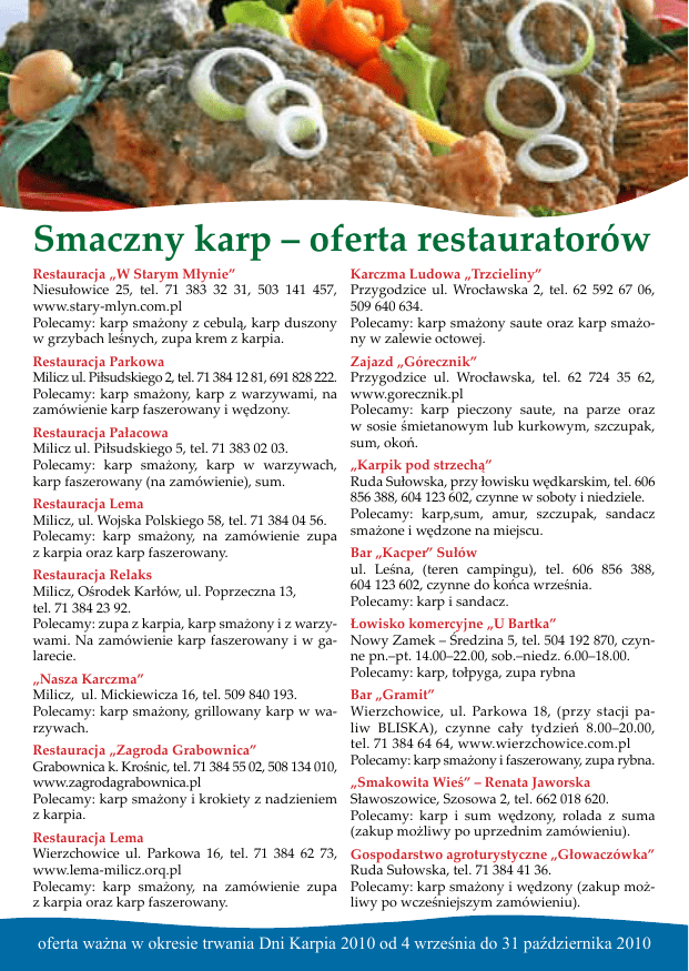 Smaczny karp – oferta restauratorów Restauracja „W Starym Młynie” Niesułowice 25, tel. 71 383 32 31, 503 141 457, www.stary-mlyn.com.pl Polecamy: karp smażony z cebulą, karp duszony w grzybach leśnych, zupa krem z karpia. Karczma Ludowa „Trzcieliny” Przygodzice ul. Wrocławska 2, tel. 62 592 67 06, 509 640 634. Polecamy: karp smażony saute oraz karp smażony w zalewie octowej. Restauracja Parkowa Milicz ul. Piłsudskiego 2, tel. 71 384 12 81, 691 828 222. Polecamy: karp smażony, karp z warzywami, na zamówienie karp faszerowany i wędzony. Zajazd „Górecznik” Przygodzice ul. Wrocławska, tel. 62 724 35 62, www.gorecznik.pl Polecamy: karp pieczony saute, na parze oraz w sosie śmietanowym lub kurkowym, szczupak, sum, okoń. Restauracja Pałacowa Milicz ul. Piłsudskiego 5, tel. 71 383 02 03. Polecamy: karp smażony, karp w warzywach, „Karpik pod strzechą” karp faszerowany (na zamówienie), sum. Ruda Sułowska, przy łowisku wędkarskim, tel. 606 856 388, 604 123 602, czynne w soboty i niedziele. Restauracja Lema Polecamy: karp,sum, amur, szczupak, sandacz Milicz, ul. Wojska Polskiego 58, tel. 71 384 04 56. Polecamy: karp smażony, na zamówienie zupa smażone i wędzone na miejscu. z karpia oraz karp faszerowany. Restauracja Relaks Milicz, Ośrodek Karłów, ul. Poprzeczna 13, tel. 71 384 23 92. Polecamy: zupa z karpia, karp smażony i z warzywami. Na zamówienie karp faszerowany i w galarecie. Bar „Kacper” Sułów ul. Leśna, (teren campingu), tel. 606 856 388, 604 123 602, czynne do końca września. Polecamy: karp i sandacz. Łowisko komercyjne „U Bartka” Nowy Zamek – Średzina 5, tel. 504 192 870, czynne pn.–pt. 14.00–22.00, sob.–niedz. 6.00–18.00. Polecamy: karp, tołpyga, zupa rybna „Nasza Karczma” Milicz, ul. Mickiewicza 16, tel. 509 840 193. Bar „Gramit” Polecamy: karp smażony, grillowany karp w wa- Wierzchowice, ul. Parkowa 18, (przy stacji parzywach. liw BLISKA), czynne cały tydzień 8.00–20.00, tel. 71 384 64 64, www.wierzchowice.com.pl Restauracja „Zagroda Grabownica” Grabownica k. Krośnic, tel. 71 384 55 02, 508 134 010, Polecamy: karp smażony i faszerowany, zupa rybna. www.zagrodagrabownica.pl „Smakowita Wieś” – Renata Jaworska Polecamy: karp smażony i krokiety z nadzieniem Sławoszowice, Szosowa 2, tel. 662 018 620. z karpia. Polecamy: karp i sum wędzony, rolada z suma (zakup możliwy po uprzednim zamówieniu). Restauracja Lema Wierzchowice ul. Parkowa 16, tel. 71 384 62 73, www.lema-milicz.orq.pl Polecamy: karp smażony, na zamówienie zupa z karpia oraz karp faszerowany. Gospodarstwo agroturystyczne „Głowaczówka” Ruda Sułowska, tel. 71 384 41 36. Polecamy: karp smażony i wędzony (zakup możliwy po wcześniejszym zamówieniu). oferta ważna w okresie trwania Dni Karpia 2010 od 4 września do 31 października 2010 Program Dni Karpia 2010 Wrzesień 5.09 (nd) 11–12.09 (sob, nd) 14.09 (wt) 18.09 (sob) 19.09 (nd) 19. 09 (nd) 24.09–3.10 (pt–nd) 25.09 (sob) 26.09 (nd) 26.09 (nd) Październik 2.10 (sob) 8.10 (pt) 9.10 (sob) 9–10.10 (sob–nd) 10.10 (nd) 16–17.10 (sob–nd) 19.10 (wt) 23–24.10 (sob–nd) 27.10 (śr) Piknik Rybny i II Przegląd Kulturalny Doliny Baryczy, Przygodzice Święto Karpia Milickiego, Milicz warsztaty „Spotkania z przyrodą” i rajd rowerowy, Ruda Milicka rodzinny festyn wiejski „Karp po wiejsku”, Dziewiętlin Do ostatniego karpia III, Cieszków rajd rowerowy z rybnymi atrakcjami „Rowerem po karpia”, Odolanów „Ekojarmark na Solnym” we Wrocławiu zawody wędkarskie, Przygodzice „Hubertowiny – Galopem po karpia”, Przygodziczki „Taaka Ryba” – festyn rodzinny, Twardogóra na Ostoi k. Milicza „Karp jest cool” piknik edukacyjny i dzień otwarty na stawach, Ruda Sułowska Ruda Żmigrodzka I weekend z ptakami w Dolinie Baryczy, kompleks Stawno k. Milicza Obserwacje ptaków na stawach, Ruda Milicka II weekend z ptakami w Dolinie Baryczy, kompleks Stawno k. Milicza Forum Edukacyjne „Natura 2000 w Dolinie Baryczy”, Milicz III weekend z ptakami w Dolinie Baryczy, Ruda Sułowska Konferencja inaugurująca PO RYBY 2007–2013 w Dolinie Baryczy Stała oferta Łowisko w Rudzie Sułowskiej, czynne pn–pt 7.00–17.00, sb–nd 7.00 – 19.00. PZB „Stawy Milickie”, Ruda Sułowska, Ireneusz Głowacz, tel. 71 384 73 55 i 601 848 322 Łowisko „Gramit” w Wierzchowicach, czynne cały tydzień w godzinach 8.00–20.00 tel. 71 384 64 64, www.wierzchowice.com.pl, [email protected] Łowisko „U Bartka” w Średzinie, czynne pn–pt 14.00–22.00 sb–nd 6.00–18.00 tel. 504 192 870 Nordic Walking – spacery z kijkami Małgorzata Kołodziejska (instruktor), tel. 691 664 333 lub Centrum IT w Miliczu 71 383 00 35 koordynator Dni Karpia 2010: „Partnerstwo dla Doliny Baryczy” pl. ks. E. Waresiaka 7, 56-300 Milicz tel./faks 71 383 04 32 [email protected] www.nasza.barycz.pl www.dbpoleca.barycz.pl