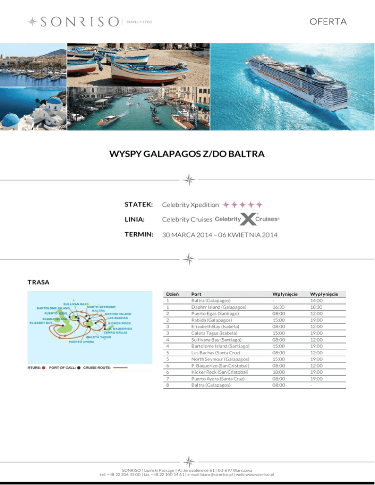 OFERTA WYSPY GALAPAGOS Z/DO BALTRA STATEK: Celebrity Xpedition LINIA: Celebrity Cruises TERMIN: 30 MARCA 2014 – 06 KWIETNIA 2014 TRASA Dzień 1 1 2 2 3 3 4 4 5 5 6 6 7 8 Port Baltra (Galapagos) Daphnr Island (Galapagos) Puerto Egas (Santiago) Rabida (Galapagos) Elizabeth Bay (Isabela) Caleta Tagus (isabela) Sullivana Bay (Santiago) Bartolome Island (Santiago) Las Bachas (Santa Cruz) North Seymour (Galapagos) P. Baquerizo (San Cristobal) Kicker Rock (San Cristobal) Puerto Ayora (Santa Cruz) Baltra (Galapagos) Wpłynięcie 16:30 08:00 15:00 08:00 15:00 08:00 15:00 08:00 15:00 08:00 18:00 08:00 08:00 SONRISO | Lipiński Passage | Al. Jero zo limskie 61 | 00-697 Warszawa tel. +48 22 206 45 00 | fax. +48 22 100 14 61 | e-mail: biuro @so nriso .pl | web: www.so nriso .pl Wypłynięcie 14:00 18:30 12:00 19:00 12:00 19:00 12:00 19:00 12:00 19:00 12:00 19:00 19:00 - OFERTA CENA Typ kabiny Cena z osobę Kabina z oknem od 3 100 EUR Kabina z oknem Premium od 3 329 EUR Penthouse Suite od 6 838 EUR CENA ZAWIERA DOTATKOWE OPŁATY zakwaterowanie w 2 - os. kabinie wybranej kategorii pełne wyżywienie: 3 posiłki, przekąski między posiłakmi, bufet o północy napoje do posiłków: woda stołowa, kawa, herbata oraz sok do śniadania serwis bagażowy podczas wejścia i zejścia ze statku 24 godzinny serwis kabinowy korzystanie z urządzeń sportowo - rekreacyjnych dostępnych na pokładzie (baseny, jacuzzi, boiska sportowe, kluby dla dzieci i młodzieży itp.) udział we wszystkich imprezach organizowanych na pokładzie (przedstawienia, pokazy, aukcje, animacje i inne) obowiązkowe opłaty portowe obowiązkową opłatę serwisową (napiwki) dla obsługi statku dojazd/przelot do portu rozpoczęcia i zakończenia rejsu transfery (lotnisko - port - lotnisko) ewentualne noclegi przed lub po rejsie wycieczki fakultatywne napoje: bezalkoholowe, alkoholowe, woda mineralna dostępne w restauracjach i barach (istnieje możliwość wykupienia pakietów napojów, o szczegóły zapytaj w biurze) korzystanie z mini baru w kabinie korzystanie z usług typu: SPA, salon piękności, pralnia itp. wydatki osobiste tj. zakupy w butikach, internet, kasyno itp. obowiązkowe ubezpieczenie turystyczne koszt wymaganych wiz ewentualna opłata paliwowa (linia w momencie wzrotu cen ropy zastrzega sobie prawo do dodania oplaty paliwowej do każdej rezerwacji) Na życzenie świadczymy dodatkowo usługi: rezerwacje hotelowe na całym świecie, rezerwacje biletów lotniczych, trasferów oraz parkingu w porcie, rezerwacje wycieczek fakultatywnych i innych atrakcji SONRISO | Lipiński Passage | Al. Jero zo limskie 61 | 00-697 Warszawa tel. +48 22 206 45 00 | fax. +48 22 100 14 61 | e-mail: biuro @so nriso .pl | web: www.so nriso .pl