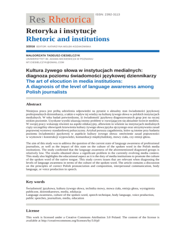 ISSN: 2392-3113 Retoryka i instytucje Rhetoric and institutions 3/2016 EDITOR: KATARZYNA MOLEK-KOZAKOWSKA MAŁGORZATA TADEUSZ-CIESIELCZYK UNIWERSYTET IM. ADAMA MICKIEWICZA W POZNANIU [email protected] Kultura żywego słowa w instytucjach medialnych: diagnoza poziomu świadomości językowej dziennikarzy The art of elocution in media institutions: A diagnosis of the level of language awareness among Polish journalists Abstract Niniejsza praca jest próbą udzielenia odpowiedzi na pytanie o aktualny stan świadomości językowej profesjonalnych dziennikarzy, a także o wpływ tej wiedzy na kulturę żywego słowa w polskich instytucjach medialnych. W toku badań potwierdzono, iż świadomość językowa diagnozowanych grup jest na raczej niskim poziomie. Uzyskane wyniki ukazują istotny problem w rozwijającym się aktualnie świecie mediów. W swojej pracy wskazuję również na aspekt edukacyjny, albowiem to właśnie na instytucjach medialnych ciąży szczególny obowiązek krzewienia kultury żywego słowa języka ojczystego oraz utrzymywania zasad poprawnej wymowy standardowej polszczyzny. Artykuł porusza zagadnienia, które są istotne przy badaniu poziomu świadomości językowej w aspekcie kultury żywego słowa: omówienie zasad poprawności w wymowie i konstrukcji wypowiedzi, komunikacji międzyludzkiej, mowy ciała, czy emisji głosu. The aim of this study was to address the question of the current state of language awareness of professional journalists, as well as the impact of this state on the culture of the spoken word in the Polish media institutions. The study confirmed that the language awareness of the aforementioned diagnosed groups is relatively low. The results obtained show a significant problem in the currently evolving media context. This study also highlights the educational aspect as it is the duty of media institutions to promote the culture of the spoken word of the native tongue. This study covers issues that are relevant when diagnosing the levels of language awareness in terms of the culture of the spoken word. The article contains a discussion on the principles of correct Polish pronunciation and composition, interpersonal communication, body language, or voice production in speech. Key words Świadomość językowa, kultura żywego słowa, technika mowy, mowa ciała, emisja głosu, wystąpienia publiczne, dziennikarstwo, media, edukacja Language awareness, culture of the spoken word, speech technique, body language, voice production, public speeches, journalism, media, education License This work is licensed under a Creative Commons Attribution 3.0 Poland. The content of the license is available at http://creativecommons.org/licenses/by/3.0/pl/ Res Rhetorica, ISSN 2392-3113, 3/2016, p. 44 MAŁGORZATA TADEUSZ-CIESIELCZYK UNIWERSYTET IM. ADAMA MICKIEWICZA W POZNANIU [email protected] Kultura żywego słowa w instytucjach medialnych: diagnoza poziomu świadomości językowej dziennikarzy 1. Wstęp Poprawna dykcja, umiejętność sprawnego artykułowania oraz stawiania akcentów logicznych w wypowiadanych zdaniach są ważne, by wysławiać się wyraźnie, zrozumiale oraz poprawnie. W połączeniu z odpowiednią postawą i mową ciała pomaga to zwiększyć wiarygodność wystąpień publicznych. Jako trener techniki mowy i wystąpień publicznych, współpracując z osobami pragnącymi wypracować w sobie umiejętności świadomego korzystania z języka oraz własnego ciała w trakcie przemawiania, zauważam duży problem, który swoje źródło może mieć już w szkołach podstawowych i gimnazjach. Bywa, iż ludzie mówią brzydko, niedokładnie, a doświadczane przez nich napięcia ciała, które wpływają na postawę, uniemożliwiają poprawny, zdrowy oddech oraz właściwą artykulację. Osoby angażujące się w pracę w instytucjach medialnych powinny mieć świadomość, iż posługiwanie się językiem na poziomie normy wzorcowej z poszanowaniem zasad poprawnej artykulacji, dykcji i logiki wypowiedzi oraz postawa i mowa ciała powinny być opanowane i świadome, ponieważ istotnie mogą wpłynąć one na recepcję przekazu. Już klasyczna retoryka wprowadzała ćwiczenia (progymnasmata) dotyczące publicznego przemawiania do audytorium jako piątej z kanonicznych składowych kompetencji mówcy (actio/pronunciatio) (Korolko, 1990). Nieprzypadkowo sposoby wokalizacji, kontrolowania tembru i tempa głosu, czy nadawania tonów emocjonalnych w recytacji były elementem edukacji elit. Język mediów jest bardzo charakterystyczny i złożony, ponieważ składa się na niego nie tylko strona dźwiękowa wypowiedzi. Wspomnieć też trzeba o całej sferze wizualnej, spostrzeganej podczas oglądania telewizji i komunikatów tam zamieszczanych. Należy mieć świadomość, iż w języku mediów „mówią” nie tylko słowa, ale również obrazy, światło w studiu, ustawienie krzeseł, na których zasiadają rozmawiające osoby, szata graficzna i wystrój wnętrz, ujęcia i ruchy kamer oraz mowa ciała nadawców komunikatu. Widz odbierając określony komunikat, by go dobrze zrozumieć, jest zmuszony do odczytania skomplikowanego Małgorzata Tadeusz-Ciesielczyk, Kultura żywego słowa w instytucjach medialnych... ● 44 Res Rhetorica, ISSN 2392-3113, 3/2016, p. 45 systemu kodów, jaki wykorzystywany jest w produkcji komunikatu medialnego. Choć przedmiotem niniejszego studium jest warstwa języka mówionego (oraz postawa ciała pozwalająca na unikanie blokad w wypowiedzi), należy pamiętać o wielokodowości przekazu medialnego. Z drugiej strony, badania wskazują, że instytucje medialne wymuszają posługiwanie się językiem w specyficzny sposób. Należy tu wymienić między innymi częste korzystanie z obcojęzycznych zwrotów, szczególnie pochodzących z języka angielskiego oraz coraz swobodniejsze podejście do etykiety językowej (Majkowska, Satkiewicz 1999, 184). Istotne jest również, co podkreśla Jerzy Bralczyk, przedmiotowe podejście do j