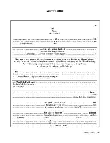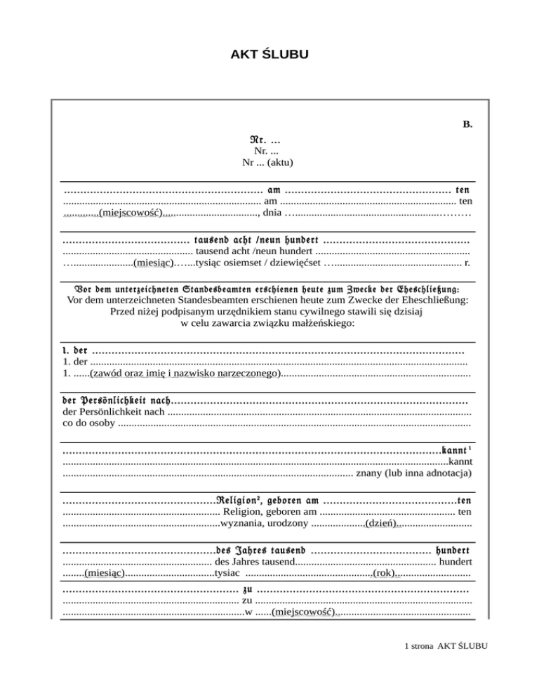 AKT ŚLUBU B. Nr. ... Nr. ... Nr ... (aktu) ............................................................. am ................................................... ten ......................................................................... am ................................................................. ten .............(miejscowość)..................................., dnia ….....................................................……… ....................................... tausend acht /neun hundert ............................................. ................................................ tausend acht /neun hundert ......................................................... …......................(miesiąc).…...tysiąc osiemset / dziewięćset …............................................... r. Vor dem unterzeichneten Standesbeamten erschienen heute zum Zwecke der Eheschließung: Vor dem unterzeichneten Standesbeamten erschienen heute zum Zwecke der Eheschließung: Przed niżej podpisanym urzędnikiem stanu cywilnego stawili się dzisiaj w celu zawarcia związku małżeńskiego: 1. der .................................................................................................................. 1. der ........................................................................................................................................... 1. ......(zawód oraz imię i nazwisko narzeczonego)...................................................................... der Persönlichkeit nach........................................................................................... der Persönlichkeit nach ................................................................................................................ co do osoby .................................................................................................................................. ....................................................................................................................kannt 1 ..............................................................................................................................................kannt ........................................................................................................... znany (lub inna adnotacja) ...............................................Religi on 2 , geboren am .........................................ten .......................................................... Religion, geboren am .................................................. ten ..........................................................wyznania, urodzony ....................(dzień)............................ ...............................................des Jahres tausend ..................................... hundert ....................................................... des Jahres tausend.................................................... hundert ........(miesiąc).................................tysiac ...............................................(rok)............................ ...................................................... zu ................................................................. ................................................................. zu ................................................................................ ...................................................................w ......(miejscowość).................................................. 1 strona AKT ŚLUBU ............................................ wohnhaft in ............................................................. .......................................................wohnhaft in ........................................................................... .......................................................zamieszkały w .............(miejscowość).................................. Sohn de ............................................................................................................... Sohn de ........................................................................................................................................ syn ...........(imiona, nazwiska oraz zawody rodziców)................................................................. ............................................................................................................... 3 wohnhaft ...................................................................................................................................... wohnhaft ................................................................................................................... zamieszkałych/ego/ej in .................. (miejscowość)................................................................................... in .......................(miejscowość).................................................................................................... w ................... (miejscowość)................................................................................... 2. die .................................................................................................................. 2. die ............................................................................................................................................ 2. ......(zawód oraz imię i nazwisko narzeczonej)......................................................................... der Persönlichkeit nach........................................................................................... der Persönlichkeit nach ................................................................................................................ co do osoby .................................................................................................................................. ....................................................................................................................kannt