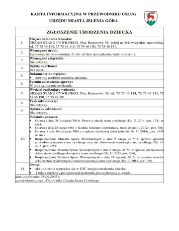 KARTA INFORMACYJNA W PRZEWODNIKU USŁUG URZĘDU MIASTA JELENIA GÓRA ZGŁOSZENIE URODZENIA DZIECKA 1. 2. 3. 4. 5. 6. 7. 8. 9. Miejsce składania wniosku: URZĄD STANU CYWILNEGO, Plac Ratuszowy 58, pokój nr 3/4; wszystkie stanowiska, tel. 75 75 46 114, 75 75 46 115, 75 75 46 190, 75 75 46 191. Wymagane druki: Zgłoszenie ustne w terminie 21 dni od dnia sporządzenia karty urodzenia. Wymagane załączniki: Nie dotyczy. Opłaty skarbowe: Bez opłat. Dokumenty do wglądu: • dowody osobiste rodziców dziecka;. Termin załatwienia sprawy: W dniu zgłoszenia urodzenia. Wydział realizujący wniosek: URZĄD STANU CYWILNEGO, Plac Ratuszowy 58, tel. 75 75 46 114, 75 75 46 115, 75 75 46 190, 75 75 46 191. Tryb odwoławczy: Nie dotyczy. Opłata za odwołanie: Nie dotyczy. Podstawa prawna: • • • 10. • • • Ustawa z dnia 28 listopada 2014r. Prawo o aktach stanu cywilnego (Dz. U. 2014, poz. 1741 ze zm.); Ustawa z dnia 25 lutego 1964 r. Kodeks rodzinny i opiekuńczy, (tekst jednolity 2012r., poz. 788; Ustawa z dnia 16 listopada 2006 r. o opłacie skarbowej (tekst jednolity Dz. U. 2014r., poz. 1628 ze zm.); Rozporządzenie Ministra Spraw Wewnętrznych z dnia 9 lutego 2015r.w sprawie sposobu prowadzenia rejestru stanu cywilnego oraz akt zbiorowych rejestracji stanu cywilnego (Dz. U. 2015, poz. 225); Rozporządzenie Ministra Spraw Wewnętrznych z dnia 5 lutego 2015r. w sprawie przenoszenia aktów stanu cywilnego do rejestru stanu cywilnego (Dz. U. 2015, poz. 204); Rozporządzenie Ministra Spraw Wewnętrznych z dnia 29 stycznia 2015r. w sprawie wzorów dokumentów wydawanych z zakresu rejestracji stanu cywilnego (Dz. U. 2015, poz. 194). Uwagi: • akt urodzenia sporządza się w USC miejsca urodzenia dziecka; • 1 odpis skrócony po rejestracji urodzenia jest wydawany z urzędu; data utworzenia: 28.09.2005 r. zatwierdzona przez: Kierownika Urzędu Stanu Cywilnego 11.