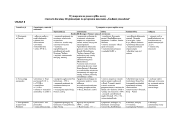 Wymagania na poszczególne oceny z historii dla klasy III gimnazjum do programu nauczania „Śladami przeszłości” OKRES I Temat lekcji Zagadnienia, materiał nauczania Wymagania na poszczególne oceny dopuszczający 1. Oświecenie w Europie • odkrycia naukowe epoki oświecenia • główne idee oświeceniowe • powstanie wolnomularstwa • sztuka XVIII w. 2. Nowe potęgi europejskie • przemiany w Rosji pod koniec XVII w. i w XVIII w. • rozwój Prus w XVIII w. • reformy w monarchii austriackiej w XVIII w. 3. Rzeczpospolita za panowania Wettinów • polsko-saska unia personalna • wojna północna i jej dostateczny dobry Rozdział I: Europa i Polska w czasach oświecenia • poprawnie posługuje się • poprawnie posługuje się • przedstawia dokonania terminami: oświecenie, terminami: oświecenie, postaci: Karola Linneusza, racjonalizm empiryzm, racjonalizm, Benjamina Franklina, Denisa • właściwie określa ramy deizm, ateizm, klasycyzm, Diderota czasowe oświecenia encyklopedyści • omawia znaczenie odkryć • wymienia • przedstawia dokonania epoki oświecenia najwybitniejszych postaci: Izaaka Newtona, • wymienia najważniejsze przedstawicieli epoki: Karola Monteskiusza, wynalazki XVIII w. Newtona, Woltera Woltera, Jamesa Watta • wyjaśnia zastosowanie • charakteryzuje zasadę maszyny parowej trójpodziału władzy sformułowaną przez Monteskiusza • omawia hasła równości społecznej głoszone przez Jeana-Jacques’a Rousseau • wymienia idee oświecenia i rozpoznaje ich wpływ na naukę, literaturę, filozofię, architekturę i sztukę • podaje rok ogłoszenia Prus • poprawnie posługuje się • omawia przyczyny i skutki królestwem –1701 r. terminami: junkrzy, wojna reform przeprowadzonych • poprawnie posługuje się północna w Rosji, Prusach i Austrii terminem absolutyzm • wymienia najważniejsze • ocenia znaczenie oświecony reformy przeprowadzone przeprowadzonych reform dla • wskazuje na mapie Rosję, w Rosji, Prusach i Austrii układu sił w Europie XVIII w. Prusy i Austrię • podaje lata wydarzeń: 1689 r. – początek samodzielnych rządów Piotra I, 1756–1763 – wojna siedmioletnia bardzo dobry celujący • przedstawia dokonania postaci: Edmunda Cartwrighta, Johna Kaya, Denisa Diderota • porównuje klasycyzm z innymi kierunkami artystycznymi • charakteryzuje styl rokoko • wskazuje wpływ epoki oświecenia na kształtowanie się modeli ustrojowych XIX w. • omawia rolę masonerii • charakteryzuje rozwój terytorialny Rosji, Prus i monarchii austriackiej • porównuje reformy oświeceniowe wprowadzone w Prusach, Rosji i Austrii • analizuje wpływ ideologii oświecenia na powstanie państw absolutyzmu oświeconego • poprawnie posługuje się terminami: wojna północna, Sejm Niemy • analizuje politykę wewnętrzną i zewnętrzną Wettinów • dokonuje samodzielnej oceny znaczenia • podaje lata wydarzeń: 1699 r. – pokój w Karłowicach, 1717 r. – • poprawnie posługuje się terminami: konfederacja warszawska, konfederacja skutki • rządy Augusta III • skutki unii polsko-saskiej • podaje lata wydarzeń: 1697 r. – koronacja Augusta II Mocnego, 1763 r. – śmierć Augusta III Sasa • przedstawia dokonania Stanisława Leszczyńskiego Sejm Niemy • przedstawia dokonania postaci: Augusta II Mocnego, Augusta III Sasa • charakteryzuje skutki wojny północnej dla Polski • wskazuje na mapie zasięg terytorialny Rzeczypospolitej za panowania Sasów • wyjaśnia zmiany położenia międzynarodowego Rzeczypospolitej w XVIII w. sandomierska, Order Orła Białego • podaje lata wydarzeń: 1704–1709 i 1733–1736 – panowanie Stanisława Leszczyńskiego, 1709 r. – bitwa pod Połtawą, 1721 r. – pokój w Nystad, 1736 r. – sejm pacyfikacyjny • wyjaśnia okoliczności elekcji Augusta II Mocnego • opisuje przebieg wojny północnej • wymienia przyczyny i przejawy kryzysu państwa polskiego w czasach saskich • szczegółowo omawia znaczenie oraz skutki wojny północnej • przy pomocy mapy wyjaśnia zmiany położenia międzynarodowego Rzeczypospolitej w XVIII w. na tle sytuacji międzynarodowej • analizuje politykę wewnętrzną i zewnętrzną Wettinów i następstw rządów Wettinów w Rzeczypospolitej • charakteryzuje przyczyny wzrostu nietolerancji religijnej w Polsce 4. Ostatni król elekcyjny • elekcja Stanisława Augusta Poniatowskiego • początek rządów Stanisława Augusta Poniatowskiego • konfederacja barska • pierwszy rozbiór Rzeczypospolitej • poprawnie posługuje się terminami: konfederacja barska, sejm rozbiorowy • podaje rok pierwszego rozbioru Polski – 1772 r. • wymienia przyczyny i skutki pierwszego rozbioru • poprawnie posługuje się terminami: Familia, Rada Nieustająca • podaje rok koronacji Stanisława Augusta Poniatowskiego – 1764 r. • omawia okoliczności elekcji Stanisława Augusta Poniatowskiego • przedstawia rolę postaci: Tadeusza Rejtana, Mikołaja Repnina • wskazuje na mapie zmiany terytorialne po pierwszym rozbiorze Polski • wymienia przyczyny i skutki pierwszego rozbioru • poprawnie posługuje się terminami: konfederacja słucka, toruńska, radomska, prawa kardynalne, ryngraf, innowierca • podaje rok zawiązania konfederacji barskiej – 1768 r. • omawia reformy sejmu konwokacyjnego • przedstawia rolę postaci: Maurycego Beniowskiego, Kajetana Sołtyka, Józefa Andrzeja Załuskiego, Wacława Rzewuskiego, Józefa Pułaskiego, Michała Krasińskiego oraz ocenia ich wpływ na dzieje Polski • samodzielnie ocenia działalność króla w latach 1764–1772 5. Tajemnice sprzed wieków – Co przedstawia „Kołacz królewski”? • reakcje mieszkańców Europy wobec rozbioru Rzeczypospolitej • rycina „Kołacz królewski” • kopie i interpretacje rysunku przedstawiającego rozbiór Polski • charakteryzuje stanowisko państw europejskich wobec pierwszego rozbioru Polski • wyjaśnia, dlaczego pierws