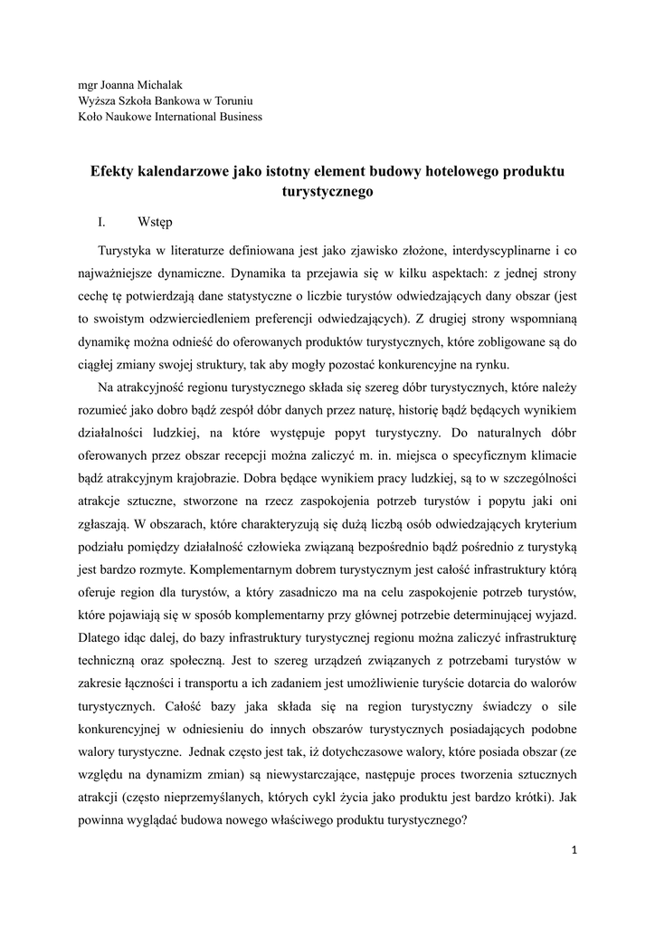 mgr Joanna Michalak Wyższa Szkoła Bankowa w Toruniu Koło Naukowe International Business Efekty kalendarzowe jako istotny element budowy hotelowego produktu turystycznego I. Wstęp Turystyka w literaturze definiowana jest jako zjawisko złożone, interdyscyplinarne i co najważniejsze dynamiczne. Dynamika ta przejawia się w kilku aspektach: z jednej strony cechę tę potwierdzają dane statystyczne o liczbie turystów odwiedzających dany obszar (jest to swoistym odzwierciedleniem preferencji odwiedzających). Z drugiej strony wspomnianą dynamikę można odnieść do oferowanych produktów turystycznych, które zobligowane są do ciągłej zmiany swojej struktury, tak aby mogły pozostać konkurencyjne na rynku. Na atrakcyjność regionu turystycznego składa się szereg dóbr turystycznych, które należy rozumieć jako dobro bądź zespół dóbr danych przez naturę, historię bądź będących wynikiem działalności ludzkiej, na które występuje popyt turystyczny. Do naturalnych dóbr oferowanych przez obszar recepcji można zaliczyć m. in. miejsca o specyficznym klimacie bądź atrakcyjnym krajobrazie. Dobra będące wynikiem pracy ludzkiej, są to w szczególności atrakcje sztuczne, stworzone na rzecz zaspokojenia potrzeb turystów i popytu jaki oni zgłaszają. W obszarach, które charakteryzują się dużą liczbą osób odwiedzających kryterium podziału pomiędzy działalność człowieka związaną bezpośrednio bądź pośrednio z turystyką jest bardzo rozmyte. Komplementarnym dobrem turystycznym jest całość infrastruktury którą oferuje region dla turystów, a który zasadniczo ma na celu zaspokojenie potrzeb turystów, które pojawiają się w sposób komplementarny przy głównej potrzebie determinującej wyjazd. Dlatego idąc dalej, do bazy infrastruktury turystycznej regionu można zaliczyć infrastrukturę techniczną oraz społeczną. Jest to szereg urządzeń związanych z potrzebami turystów w zakresie łączności i transportu a ich zadaniem jest umożliwienie turyście dotarcia do walorów turystycznych. Całość bazy jaka składa się na region turystyczny świadczy o sile konkurencyjnej w odniesieniu do innych obszarów turystycznych posiadających podobne walory turystyczne. Jednak często jest tak, iż dotychczasowe walory, które posiada obszar (ze względu na dynamizm zmian) są niewystarczające, następuje proces tworzenia sztucznych atrakcji (często nieprzemyślanych, których cykl życia jako produktu jest bardzo krótki). Jak powinna wyglądać budowa nowego właściwego produktu turystycznego? 1 Celem niniejszego artykułu jest analiza cykliczności odwiedzin liczby gości korzystających z usług hotelu położonego w centrum Torunia. Hotel przyjmuje gości, o których nie można powiedzieć jaki jest cel ich wizyty (żaden hotel nie prowadzi tak szczegółowych baz danych w których uwzględnia cel wizyty każdego klienta). Jednak najważniejszym założeniem, będącym fundamentem tej pracy jest sąd, iż wśród tych gości znajdują się obecni bądź potencjalni turyści. Postrzegany przez nich produkt turystyczny to zapisany w pamięci obraz; od tego wykreowanego w trakcie pobytu obrazu miejsca zależy czy goście hotelowi powrócą. Analiza ma na celu głównie określenie sezonowości przyjazdów gości hotelowych i na bazie przeprowadzonych interpretacji takie zaproponowanie poszerzenia zakresu usług, aby badany hotel poprzez szybkie dostosowywanie się do zmian w otaczającej go rzeczywistości i wprowadzenie pewnych innowacyjnych usług w jego strukturze mógł być postrzegany jako produkt turystyczny spełniający oczekiwania turystów przez pryzmat nowych usług. Innymi słowy, aby stał się nowym produktem turystycznym, dynamicznym dostosowanym do wymagającej rzeczywistości gospodarczej przy uwzględnieniu sezonowości odwiedzin gości hotelowych. Głównym celem takiego potraktowania produktu jest wskazanie istotności rozładowania ilości turystów z okresów przeciążonych na okresy w których mobilność gości jest mniejsza. II. Istota produktu turystycznego Na wizerunek miejscowości składają się nie tylko walory turystyczne (chociaż są najistotniejszym bezpośrednim czynnikiem determinującym przyjazdy turystów), ale także szereg innych czynników pośrednich takich jak: atmosfera, ludzie, forma spełnienia potrzeb turystów (czyli wszystkie elementy wchodzące w skład procesu świadczenia usług). Właśnie te ostatnie elementy w dużej mierze decydują o tym czy turysta powróci do danej miejscowości turystycznej, czy nawiąże się swoista więź w sferze emocjonalnej turysty z odwiedzanym obszarem. Ustawa z dnia 29 sierpnia 1997 roku o usługach turystycznych określa, że usługi turystyczne to usługi hotelarskie, przewodnickie oraz wszystkie inne usługi świadczone turystom lub odwiedzającym. To one tworzą rzeczywistość gospodarczą, są stroną podaży, która kształtuje się w zależności od poziomu popytu zgłaszanego przez potencjalnych turystów. O ten element wolnych środków zabiegają miejscowości turystyczne kreując nowe produkty turystyczne. 2 Konieczność zaspokojenia potrzeb wywołuje odpowiednie reakcje dostosowawcze po stronie podaży1. Produkt turystyczny jest złożony i różnorodny (może jawić się w formie idei, usługi lub kombinacji tych elementów)2. Cytując Aleksandra Panasiuka: „Produkt turystyczny należy określić jako cały zestaw dóbr i usług (obok walorów turystycznych) umożliwiających turyście przybycie do miejsca występowania atrakcji turystycznej3”. Składniki produktu turystycznego to: 1. atrakcje turystyczne miasta, 2. infrastruktura miejsca docelowego (w tym: baza noclegowa, gastronomiczna oraz transport w miejscu docelowym), 3. wizerunek miejsca docelowego istniejący w świadomości potencjalnych turystów (mający ogromny wpływ na podejmowane przez nich decyzje o wyjeździe w określone miejsce)4. Poziomy produktu turystycznego 