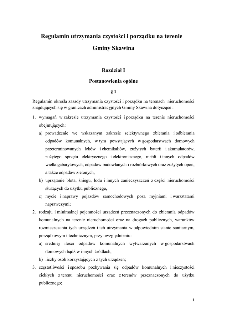 Regulamin utrzymania czystości i porządku na terenie Gminy Skawina Rozdział I Postanowienia ogólne §1 Regulamin określa zasady utrzymania czystości i porządku na terenach nieruchomości znajdujących się w granicach administracyjnych Gminy Skawina dotyczące : 1. wymagań w zakresie utrzymania czystości i porządku na terenie nieruchomości obejmujących: a) prowadzenie we wskazanym zakresie selektywnego zbierania i odbierania odpadów komunalnych, w tym powstających w gospodarstwach domowych przeterminowanych leków i chemikaliów, zużytych baterii i akumulatorów, zużytego sprzętu elektrycznego i elektronicznego, mebli i innych odpadów wielkogabarytowych, odpadów budowlanych i rozbiórkowych oraz zużytych opon, a także odpadów zielonych, b) uprzątanie błota, śniegu, lodu i innych zanieczyszczeń z części nieruchomości służących do użytku publicznego, c) mycie i naprawy pojazdów samochodowych poza myjniami i warsztatami naprawczymi; 2. rodzaju i minimalnej pojemności urządzeń przeznaczonych do zbierania odpadów komunalnych na terenie nieruchomości oraz na drogach publicznych, warunków rozmieszczania tych urządzeń i ich utrzymania w odpowiednim stanie sanitarnym, porządkowym i technicznym, przy uwzględnieniu: a) średniej ilości odpadów komunalnych wytwarzanych w gospodarstwach domowych bądź w innych źródłach, b) liczby osób korzystających z tych urządzeń; 3. częstotliwości i sposobu pozbywania się odpadów komunalnych i nieczystości ciekłych z terenu nieruchomości oraz z terenów przeznaczonych do użytku publicznego; 1 4. innych wymagań wynikających z wojewódzkiego planu gospodarki odpadami; 5. obowiązków osób utrzymujących zwierzęta domowe, mających na celu ochronę przed zagrożeniem lub uciążliwością dla ludzi oraz przed zanieczyszczeniem terenów przeznaczonych do wspólnego użytku; 6. wymagań utrzymywania zwierząt gospodarskich na terenach wyłączonych z produkcji rolniczej, w tym także zakazu ich utrzymywania na określonych obszarach lub w poszczególnych nieruchomościach; 7. wyznaczania obszarów podlegających obowiązkowej deratyzacji i terminów jej przeprowadzania. §2 Ilekroć w Regulaminie jest mowa o: 1. nieruchomościach – należy przez to rozumieć części powierzchni ziemskiej, stanowiące odrębny przedmiot własności ( grunty ), jak również budynki trwałe związane z gruntem lub części takich budynków, jeżeli na mocy przepisów szczególnych stanowią odrębny od gruntu przedmiot własności, wśród nieruchomości rozróżnia się : a) nieruchomości zamieszkałe – należy przez to rozumieć nieruchomości przeznaczone do trwałego przebywania osób w celu zaspokajania potrzeb mieszkaniowych, b) nieruchomości niezamieszkałe – należy przez to rozumieć obiekty i tereny zgłoszone do podatku od nieruchomości jako działalność gospodarcza oraz żłobki, przedszkola, szkoły, ogrody działkowe, targowiska, cmentarze oraz punkty handlowe i gastronomiczne poza lokalem oraz pozostałe obiekty użyteczności publicznej, 2.właścicielach nieruchomości – należy przez to rozumieć także współwłaścicieli, użytkowników wieczystych, oraz jednostki organizacyjne i osoby posiadające nieruchomości w zarządzie lub użytkowaniu, a także inne podmioty władające nieruchomościami mającymi obowiązek realizować obowiązki w zakresie utrzymania czystości i porządku. Jeżeli nieruchomość jest zabudowana budynkami wielolokalowymi, w których ustanowiono odrębną własność lokali, obowiązki właściciela nieruchomości obciążają osoby sprawujące zarząd nieruchomością wspólną, w rozumieniu przepisów ustawy z dnia 24 czerwca 1994 r. o własności lokali lub właściciele lokali, jeżeli zarząd nie został wybrany. 3. Planie Gospodarki Odpadami Województwa Małopolskiego – należy rozumieć przez to dokument przyjęty przez Sejmik Województwa Małopolskiego uchwałą Nr XXV/397/12 z dnia 2 lipca 2012 r. 2 4. odpadach komunalnych – należy przez to rozumieć odpady powstające w gospodarstwach domowych, z wyłączeniem pojazdów wycofanych z eksploatacji, a także odpady nie zawierające odpadów niebezpiecznych pochodzące od innych wytwórców odpadów, które ze względu na swój charakter lub skład są podobne do odpadów powstających w gospodarstwach domowych, 5. odpadach surowcach wtórnych – należy przez to rozumieć wyselekcjonowane z odpadów komunalnych odpady, które mogą być zawracane do celowego wykorzystania przez innego użytkownika np. zastępując surowiec pierwotny (tj. papier, metal, tworzywa sztuczne, szkło, odzież i tekstylia i opakowania z nich wykonane oraz opakowania wielomateriałowe), 7. odpadach wielkogabarytowych – należy przez to rozumieć wyselekcjonowane z odpadów komunalnych odpady , charakteryzujące się tym, że ze względu na swoje rozmiary i masę, nie mogą być umieszczone w typowych pojemnikach przeznaczonych do zbierania odpadów komunalnych; do odpadów wielkogabarytowych nie zalicza się wszelkiego rodzaju odpadów z budów i remontów oraz odpadów zużytego sprzętu elektrycznego i elektronicznego, 8. odpadach ulegających biodegradacji – należy przez to rozumieć wyselekcjonowane z odpadów komunalnych odpady, które ulegają rozkładowi tlenowemu lub beztlenowemu przy udziale mikroorganizmów, zalicza się do nich odpady kuchenne, odpady zielone, papier i makulaturę nie opakowaniowe, opakowania z papieru i tektury, opakowania z tekstyliów i tekstylia zawierające włókna naturalne, drewno i opakowania z drewna oraz odpady z targowisk, 9. odpadach zielonych – należy przez to rozumieć wyselekcjonowaną z odpadów komunalnych frakcję odpadów roślinnych ulegających biodegradacji, powstających m. in. w wyniku pielęgnacji i uprawy ogrodów, parków i terenów zielonych, 10. odpadach opakowaniowych – należy przez to rozumieć wyselekcjonowane z odpadów komunalnych opakowania z papier