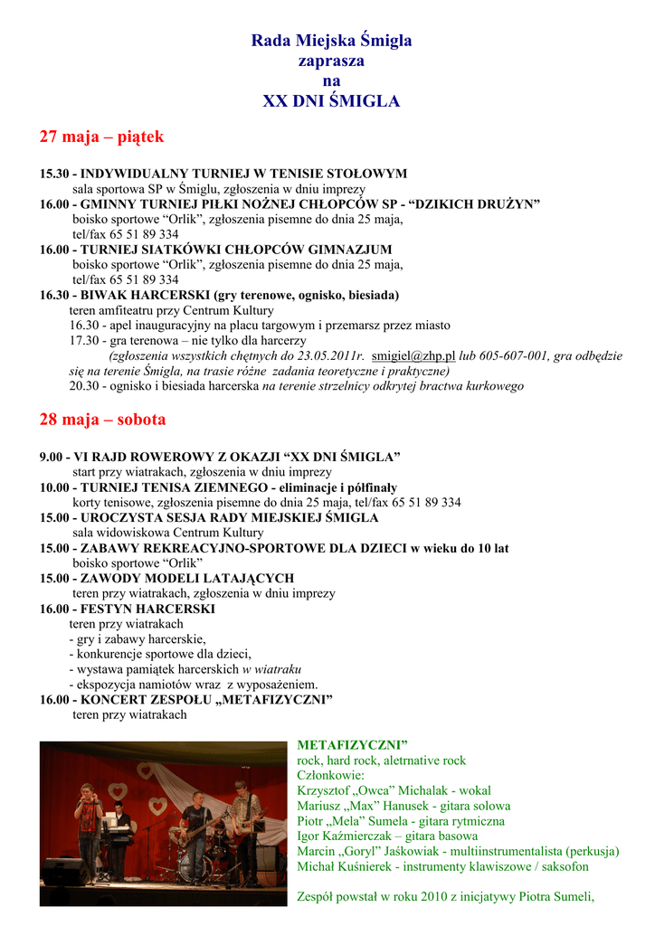 Rada Miejska Śmigla zaprasza na XX DNI ŚMIGLA 27 maja – piątek 15.30 - INDYWIDUALNY TURNIEJ W TENISIE STOŁOWYM sala sportowa SP w Śmiglu, zgłoszenia w dniu imprezy 16.00 - GMINNY TURNIEJ PIŁKI NOŻNEJ CHŁOPCÓW SP - “DZIKICH DRUŻYN” boisko sportowe “Orlik”, zgłoszenia pisemne do dnia 25 maja, tel/fax 65 51 89 334 16.00 - TURNIEJ SIATKÓWKI CHŁOPCÓW GIMNAZJUM boisko sportowe “Orlik”, zgłoszenia pisemne do dnia 25 maja, tel/fax 65 51 89 334 16.30 - BIWAK HARCERSKI (gry terenowe, ognisko, biesiada) teren amfiteatru przy Centrum Kultury 16.30 - apel inauguracyjny na placu targowym i przemarsz przez miasto 17.30 - gra terenowa – nie tylko dla harcerzy (zgłoszenia wszystkich chętnych do 23.05.2011r. [email protected] lub 605-607-001, gra odbędzie się na terenie Śmigla, na trasie różne zadania teoretyczne i praktyczne) 20.30 - ognisko i biesiada harcerska na terenie strzelnicy odkrytej bractwa kurkowego 28 maja – sobota 9.00 - VI RAJD ROWEROWY Z OKAZJI “XX DNI ŚMIGLA” start przy wiatrakach, zgłoszenia w dniu imprezy 10.00 - TURNIEJ TENISA ZIEMNEGO - eliminacje i półfinały korty tenisowe, zgłoszenia pisemne do dnia 25 maja, tel/fax 65 51 89 334 15.00 - UROCZYSTA SESJA RADY MIEJSKIEJ ŚMIGLA sala widowiskowa Centrum Kultury 15.00 - ZABAWY REKREACYJNO-SPORTOWE DLA DZIECI w wieku do 10 lat boisko sportowe “Orlik” 15.00 - ZAWODY MODELI LATAJĄCYCH teren przy wiatrakach, zgłoszenia w dniu imprezy 16.00 - FESTYN HARCERSKI teren przy wiatrakach - gry i zabawy harcerskie, - konkurencje sportowe dla dzieci, - wystawa pamiątek harcerskich w wiatraku - ekspozycja namiotów wraz z wyposażeniem. 16.00 - KONCERT ZESPOŁU „METAFIZYCZNI” teren przy wiatrakach METAFIZYCZNI” rock, hard rock, aletrnative rock Członkowie: Krzysztof „Owca” Michalak - wokal Mariusz „Max” Hanusek - gitara solowa Piotr „Mela” Sumela - gitara rytmiczna Igor Kaźmierczak – gitara basowa Marcin „Goryl” Jaśkowiak - multiinstrumentalista (perkusja) Michał Kuśnierek - instrumenty klawiszowe / saksofon Zespół powstał w roku 2010 z inicjatywy Piotra Sumeli, Mariusza Hanuska oraz Krzysztofa Michalak. Po pewnym czasie dołączył Michał Kuśnierek, który początkowo grał na perkusji, oraz Igor Kaźmierczak, grający na gitarze basowej. „Najmłodszy” członek to Marcin Jaśkowiak. Początkowo zespół ograniczał się do działalności w obrębie szkoły (wszyscy są uczniami ZST w Lesznie), lecz z czasem zaczął grać także w innych miejscach. Przełomem był finał „Wielkiej Orkiestry Świątecznej Pomocy” w Rydzynie, na którym zebrał wiele braw. Obecnie gra w leszczyńskich klubach oraz pubach. Zespół dąży do wykreowania własnego stylu, brzmienia. 17.00 - KONCERT ZESPOŁU „PRYZMAT-BIS” i Studia Piosenki „MUZOL” działającego przy Centrum Kultury w Śmiglu teren przy wiatrakach 18.00 - KONCERT ZPiT „ŻEŃCY WIELKOPOLSCY” teren przy wiatrakach 19.00 - KONCERT ZESPOŁU „KWARTET RAMPA” teren przy wiatrakach „KWARTET RAMPA” Joanna Pałucka, Anna Ścigalska, Stefan Każuro i Grzegorz Kucias, będąc jeszcze aktorami znanego warszawskiego teatru „Rampa”, założyli w 1992 roku kwartet wokalny, pojawiając się po raz pierwszy na galowym koncercie Festiwalu Filmów Fabularnych w Gdyni. Od tej chwili nieustannie uczestniczą w kolejnych edycjach Festiwalu Piosenki Aktorskiej we Wrocławiu, współpracując m.in. z Laco Adamikiem i Andrzejem Strzeleckim. Z tym ostatnim - poza spektaklami teatralnymi w Rampie - zrealizowali szereg programów telewizyjnych („Parawan”, „Prezenty”, „Jedna sytuacja”, „Kilka sytuacji”, „Con'te opowiadania w dur i w moll”). Brali udział również w programach TV na zaproszenie Wojciecha Młynarskiego. Uczestniczyli w operowym projekcie Teatru Wielkiego w Warszawie pt. „Tides and Waves”, którego premiera miała miejsce w Barcelonie. W 1995 r. Zbigniew Górny zaprosił Kwartet Rampa do Gali Piosenki Biesiadnej. Kwartet do dziś bierze udział w kolejnych edycjach tego przedsięwzięcia. Śpiewa transkrypcje Fryderyka Chopina i Duke Ellingtona, współczesną polską muzykę popową oraz klasyczne utwory jazzowe Fatsa Wallera, Jerzego Wasowskiego i Jerzego Petersburskiego. Rampa śpiewa wszystko, co nadaje się do wielogłosowej przeróbki brzmieniowej. Współpracuje z najlepszymi polskimi kompozytorami i aranżerami - Krzesimirem Dębskim, Piotrem Rubikiem, Włodzimierzem Korczem, Wiesławem Pieregorólką, Jerzym Satanowskim, Aleksandrem Maliszewskim, Jerzym Derflem i Juliuszem Lorancem. Przez lata wspólnego występowania wypracował własne brzmienie i rzadką dziś umiejętność śpiewania w harmonii wielogłosowej. 21.00 - ZABAWA TANECZNA - zespół „ORANGE” teren przy wiatrakach 29 maja – niedziela 10.00 – TURNIEJ SIATKÓWKI DZIEWCZĄT SP sala sportowa SP w Śmiglu 9turniej zamknięty 12.00 - TURNIEJ PIŁKI NOŻNEJ MĘŻCZYZN niezrzeszonych boisko sportowe „Orlik”, zgłoszenia pisemne do dnia 25 maja, tel/fax 65 51 89 334 (maksymalnie 6 drużyn 13.00 - TURNIEJE STRZELECKIE strzelnice KBS w Śmiglu, zgłoszenia w dniu imprezy 13.00-16.00 - turniej strzelania z wiatrówki dla dzieci i młodzieży 14.00-18.00 - turniej strzelecki z broni czarnoprochowej dla dorosłych 13.00 – GMINNY TURNIEJ W „BULE” boisko sportowe “Orlik”, zgłoszenia pisemne do dnia 25 maja, tel/fax 65 51 89 334 16.00 – „BALLADYNA” NA WESOŁO w wykonaniu uczniów Gimnazjum w Śmiglu teren przy wiatrakach 16.00 – ZABAWY I KONKURSY DLA DZIECI teren przy wiatrakach 17.00 - KONCERT ZESPOŁU „MAGNUS” teren przy wiatrakach „MAGNUS” Duet MAGNUS powstał w styczniu 2007 w Poznaniu. Tworzą go Agnieszka, na co dzień anglistka, i Przemek, student fizyki. Poznali się dzięki muzyce gospel, którą wykonywali już wcześniej, zanim założyli własny zespół. Do dzisiaj zresztą czerpią inspiracje z tego gatunku. Jednak ich główne zainteresowania muzyczne to przede wszy