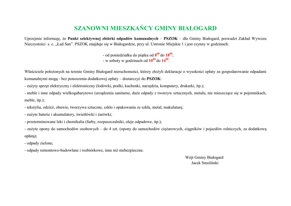 SZANOWNI MIESZKAŃCY GMINY BIAŁOGARD Uprzejmie informuję, że Punkt selektywnej zbiórki odpadów komunalnych – PSZOK – dla Gminy Białogard, prowadzi Zakład Wywozu Nieczystości s. c. „Ład San”. PSZOK znajduje się w Białogardzie, przy ul. Ustronie Miejskie 1 i jest czynny w godzinach: - od poniedziałku do piątku od 800 do 1800; - w soboty w godzinach od 1000 do 1400. Właściciele położonych na terenie Gminy Białogard nieruchomości, którzy złożyli deklaracje o wysokości opłaty za gospodarowanie odpadami komunalnymi mogą - bez ponoszenia dodatkowej opłaty – dostarczyć do PSZOK: - zużyty sprzęt elektryczny i elektroniczny (lodówki, pralki, kuchenki, narzędzia, komputery, drukarki, itp.); - meble i inne odpady wielkogabarytowe (urządzenia sanitarne, duże odpady z tworzyw sztucznych, metalu, nie mieszczące się w pojemnikach, meble, itp.); - tekstylia, odzież, obuwie, tworzywa sztuczne, szkło i opakowania ze szkła, metal, makulaturę; - zużyte baterie i akumulatory, świetlówki i żarówki; - przeterminowane leki i chemikalia (farby, rozpuszczalniki, oleje odpadowe, itp.); - zużyte opony do samochodów osobowych – do 4 szt. (opony do samochodów ciężarowych, ciągników i pojazdów rolniczych, za dodatkową opłatą); - odpady zielone; - odpady remontowo-budowlane i rozbiórkowe, inne niż niebezpieczne. Wójt Gminy Białogard Jacek Smoliński