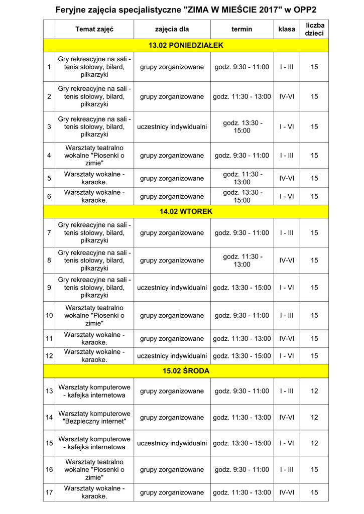 Feryjne zajęcia specjalistyczne "ZIMA W MIEŚCIE 2017" w OPP2 Temat zajęć zajęcia dla termin klasa liczba dzieci 13.02 PONIEDZIAŁEK 1 Gry rekreacyjne na sali tenis stołowy, bilard, piłkarzyki grupy zorganizowane godz. 9:30 - 11:00 I - III 15 2 Gry rekreacyjne na sali tenis stołowy, bilard, piłkarzyki grupy zorganizowane godz. 11:30 - 13:00 IV-VI 15 3 Gry rekreacyjne na sali tenis stołowy, bilard, uczestnicy indywidualni piłkarzyki godz. 13:30 15:00 I - VI 15 4 Warsztaty teatralno wokalne "Piosenki o zimie" grupy zorganizowane godz. 9:30 - 11:00 I - III 15 5 Warsztaty wokalne karaoke. grupy zorganizowane godz. 11:30 13:00 IV-VI 15 6 Warsztaty wokalne karaoke. grupy zorganizowane godz. 13:30 15:00 I - VI 15 14.02 WTOREK 7 Gry rekreacyjne na sali tenis stołowy, bilard, piłkarzyki grupy zorganizowane godz. 9:30 - 11:00 I - III 15 8 Gry rekreacyjne na sali tenis stołowy, bilard, piłkarzyki grupy zorganizowane godz. 11:30 13:00 IV-VI 15 9 Gry rekreacyjne na sali tenis stołowy, bilard, uczestnicy indywidualni godz. 13:30 - 15:00 piłkarzyki I - VI 15 10 11 12 Warsztaty teatralno wokalne "Piosenki o zimie" Warsztaty wokalne karaoke. Warsztaty wokalne karaoke. grupy zorganizowane godz. 9:30 - 11:00 I - III 15 grupy zorganizowane godz. 11:30 - 13:00 IV-VI 15 uczestnicy indywidualni godz. 13:30 - 15:00 I - VI 15 15.02 ŚRODA 13 Warsztaty komputerowe - kafejka internetowa grupy zorganizowane godz. 9:30 - 11:00 I - III 12 14 Warsztaty komputerowe "Bezpieczny internet" grupy zorganizowane godz. 11:30 - 13:00 IV-VI 12 15 Warsztaty komputerowe uczestnicy indywidualni godz. 13:30 - 15:00 - kafejka internetowa I - VI 12 16 Warsztaty teatralno wokalne "Piosenki o zimie" grupy zorganizowane godz. 9:30 - 11:00 I - III 15 17 Warsztaty wokalne karaoke. grupy zorganizowane godz. 11:30 - 13:00 IV-VI 15 18 Warsztaty wokalne karaoke. uczestnicy indywidualni godz. 13:30 - 15:00 I - VI 15 16.02 CZWARTEK 19 Warsztaty komputerowe - kafejka internetowa grupy zorganizowane godz. 9:30 - 11:00 I - III 12 20 Warsztaty komputerowe "Bezpieczny internet" grupy zorganizowane godz. 11:30 - 13:00 IV-VI 12 21 Warsztaty komputerowe uczestnicy indywidualni godz. 13:30 - 15:00 - kafejka internetowa I - VI 12 Warsztaty plastyczne 22 papieroplastyka: "Miasto w bieli" 23 Warsztaty plastyczne "Coś z niczego podkładka pod kubek" 24 Warsztaty plastyczne "Coś z niczego podkładka pod kubek" grupy zorganizowane godz. 9:30 - 11:00 I - III 15 grupy zorganizowane godz. 11:30 13:00 IV-VI 15 I - VI 15 uczestnicy indywidualni godz. 13:30 - 15:00 17.02 PIĄTEK 25 Kino w Opp2 - zimowe bajki grupy zorganizowane godz. 9:30 - 11:00 I - III 30-40 26 Kino w Opp2 - zimowe bajki grupy zorganizowane godz. 11:30 - 13:00 I - III 30-40 27 Kino w Opp2 - zimowe bajki uczestnicy indywidualni godz. 13:30 15:00 I - VI 30-40 28 Warsztaty plastyczne "Coś z niczego - ramka na zdjęcia" grupy zorganizowane godz. 9:30 - 11:00 I - III 15 29 Warsztaty plastyczne "Młodzi projektanci projekt czapki i szalika" grupy zorganizowane godz. 11:30 - 13:00 IV-VI 15 30 Warsztaty plastyczne "Młodzi projektanci projekt czapki i szalika" uczestnicy indywidualni godz. 13:30 15:00 I - VI 15 20.02 PONIEDZIAŁEK 31 Kino w Opp2 - zimowe bajki grupy zorganizowane godz. 9:30 - 11:00 I - III 30-40 32 Kino w Opp2 - zimowe bajki grupy zorganizowane godz. 11:30 - 13:00 IV-VI 30-40 33 Kino w Opp2 - zimowe bajki uczestnicy indywidualni godz. 13:30 - 15:00 I - VI 30-40 21.02 WTOREK 34 Gry rekreacyjne na sali tenis stołowy, bilard, piłkarzyki grupy zorganizowane godz. 9:30 - 11:00 I - III 15 35 Gry rekreacyjne na sali tenis stołowy, bilard, piłkarzyki grupy zorganizowane godz. 11:30 13:00 I - III 15 36 Gry rekreacyjne na sali tenis stołowy, bilard, uczestnicy indywidualni piłkarzyki 37 Warsztaty - gry planszowe i edukacyjne 38 39 godz. 13:30 15:00 I - VI 15 grupy zorganizowane godz. 9:30 - 11:00 I - III 15 Warsztaty - gry planszowe i edukacyjne grupy zorganizowane godz. 11:30 13:00 IV-VI 15 Warsztaty - gry planszowe i edukacyjne uczestnicy indywidualni godz. 13:30 15:00 I - VI 15 22.02 ŚRODA Gry rekreacyjne na sali tenis stołowy, bilard, piłkarzyki grupy zorganizowane godz. 9:30 - 11:00 I - III 15 Gry rekreacyjne na sali 41 tenis stołowy, bilard, piłkarzyki grupy zorganizowane godz. 11:30 - 13:00 IV-VI 15 godz. 13:30 15:00 I - VI 15 40 42 Gry rekreacyjne na sali tenis stołowy, bilard, uczestnicy indywidualni piłkarzyki Warsztaty twórczości 43 rozwijanie kreatywności poprzez zabawę grupy zorganizowane godz. 9:30 - 11:00 I - III 15 Warsztaty twórczości 44 rozwijanie kreatywności poprzez zabawę grupy zorganizowane godz. 11:30 - 13:00 IV-VI 15 Warsztaty twórczości 45 rozwijanie kreatywności poprzez zabawę grupy zorganizowane godz. 13:30 15:00 I - VI 15 23.02 CZWARTEK 46 Gry rekreacyjne na sali tenis stołowy, bilard, piłkarzyki grupy zorganizowane godz. 9:30 - 11:00 I - III 15 47 Gry rekreacyjne na sali tenis stołowy, bilard, piłkarzyki grupy zorganizowane godz. 11:30 13:00 IV-VI 15 48 Gry rekreacyjne na sali tenis stołowy, bilard, uczestnicy indywidualni godz. 13:30 - 15:00 piłkarzyki I - VI 15 49 Warsztaty komputerowe - kafejka internetowa grupy zorganizowane godz. 9:30 - 11:00 I - III 12 50 Warsztaty komputerowe - kafejka internetowa grupy zorganizowane godz. 11:30 - 13:00 IV-VI 12 51 Warsztaty komputerowe uczestnicy indywidualni godz. 13:30 - 15:00 - kafejka internetowa I - VI 12 I - III 12 24.02 PIĄTEK 52 Warsztaty komputerowe - kafejka internetowa grupy zorganizowane godz. 9:30 - 11:00 53 Warsztaty komputerowe - kafejka internetowa 54 Warsztaty komputerowe uczestnicy indywidualni - kafejka internetowa 55 Warsztaty - gry planszowe i edukacyjne 56 57 grupy zorganizowane godz. 11:30 - 13:00 IV-VI 12 godz. 13:30 15:00 I - VI 12 grupy zorganizowane godz. 9:30 - 11:00 I - III 15 Warsztaty - gry planszowe i edukacyjne grupy zorganizowane godz. 11:30 13:00 IV-VI 15 Warsztaty - gry planszowe i edukacyjne grupy zorganizowane godz. 13:30 - 15:00 I - VI 15