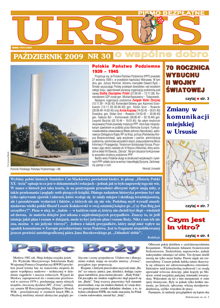 Fot. Ireneusz Barski Polskie Państwo Podziemne 1939 – 1945 Pomnik Polskiego Państwa Podziemnego i AK. Przyjmuje się, że Polskie Państwo Podziemne (PPP) powstało 27 września 1939 r. w przeddzień kapitulacji Warszawy. W tym dniu gen. Juliusz Rómmel, któremu marszałek Edward Rydz – Śmiały opuszczając Polskę przekazał dowództwo nad wojskami całego kraju, zaaprobował pierwszą organizację podziemną pod nazwą Służba Zwycięstwu Polski (27.09.39 – 13.11.39). Ko− mendantem SZP został gen. Michał Karaszewicz – Tokarzewski. Następne organizacje podziemne Związek Walki Zbrojnej (13.11.39 − 14.02.42). Komendant Główny: gen. Kazimierz Sosn− kowski (13.11.39−30.06.40) gen. Stefan Grot – Rowecki (30.06.40−14.02.42) oraz Armia Krajowa (14.02.42 – 20.01.45) Dowódca: gen. Stefan Grot – Rowecki (14.02.42 – 30.06.43) gen. Tadeusz Bór – Komorowski (30.06.43 – 02.10.44) gen. Leopold Okulicki (02.10.44 – 19.01.45). Na całym terytorium okupowanej Polski powstały instytucje PPP, które były niespoty− kanym zjawiskiem w podbitej przez Niemców Europie. Funkcjo− nowała władza ustawodawcza (Rada Jedności Narodowej), wyko− nawcza (Delegatura Rządu RP na Kraj), policja (Państwowy Kor− pus Bezpieczeństwa), sądy wojskowe i cywilne, administracja podziemna, szkolnictwo wszystkich stopni, prasa podziemna (Biuro Informacji i Propagandy). Terytorium dzisiejszego Ursusa, Prusz− kowa i jego okolic należało do VI Rejonu (Helenów), który wcho− dził w skład VII Obwodu „Obroża”. Na tym obszarze funkcjonowa− ły wszystkie struktury podziemne PPP. Bardzo wielu Polaków służąc w strukturach wojskowych i cywil− nych PPP oddało życie za wolną i niepodległą Ojczyznę. Zachowaj− my pamięć o nich. Henryk Linowski Wybitny polski historyk Stanisław Cat−Mackiewicz powiedział kiedyś, że pisząc „Historię Polski XX − lecia” opisuje to co jest w dokumentach i relacjach – jednak jak to było naprawdę tego nie wie. W nauce o historii jest taka teoria, że na postrzeganie przeszłości olbrzymi wpływ mają mity, a także przekonania i poglądy osób piszących książki. Dlatego zadaniem historyka powinno być nie tylko opisywanie zjawisk i zdarzeń, które wydaje się że miały miejsce i skutkują teraźniejszością, ale i poszukiwanie wydarzeń i faktów, o których nic się nie wie. Podobną myśl wyraził zmarły niedawno wielki polski filozof Leszek Kołakowski w swej ostatniej książce pt. „Czy Pan Bóg jest szczęśliwy?”. Pisze w niej, że „ludzie – w każdym razie ci, którzy nie chcieli być ślepi – wiedzieli od dawna, że materia dziejów jest utkana z najdrobniejszych przypadków. Znaczy to, że jeśli istnieje jakiś plan i rozum w dziejach, może to być jedynie plan i rozum Boży. Nikt z nas ich nie zna, można w nie jedynie wierzyć”, Jednen z takich przypadków, który mógł mieć wpływ na upadek komunizmu w Europie przedstawiamy teraz Państwu. Jest to fragment niepublikowanej jeszcze powieści autobiograficznej pióra Jana Buczkowskiego pt. „Odnaleźć siebie”. Redakcja Moskwa 1982 rok. Moja kolejna rosyjska jesień. Do Wydziału Maszynowego Sekretariatu Rady Wzajemnej Pomocy Gospodarczej (RWPG) przyby− łem przed trzema laty na stanowisko eksperta do spraw współpracy naukowo – technicznej w dzie− dzinie ciągników i maszyn rolniczych. Wyjazd do Moskwy zaproponował mi i ostatecznie przeforso− wał w czerwcu 1979 r., przełamując opory różnych urzędów, ówczesny dyrektor ZPC „Ursus”, później− szy senator III Rzeczypospolitej, Zbigniew Henryk Wilk − prześladowany w ostatnich latach PRL−u. Obydwaj mieliśmy niemal identyczne poglądy po− lityczne i oceny gospodarcze. Ufałem mu i dlatego, mimo wahań, mając na uwadze interesy „Ursusa”, przyjąłem jego propozycję. Rosjanie, z którymi pracowałem nazywali mnie „Ba− rin” (co znaczy: panicz, pan, dziedzic), dodając często quasi żartobliwie, poza moimi plecami − „Biały Polak”. Od początku nie miałem wątpliwości skąd pojawił się ten „Barin”. Tutaj wszyscy pracownicy byli starannie prześwietlani, więc nie miałem złudzeń, że i moje drze− wo genealogiczne zostało dokładnie zbadane, a to, że byłem członkiem PZPR, nie miało znaczenia, bo Polak z moim rodowodem, musiał być „biały”. 70 ROCZNICA WYBUCHU II WOJNY ŚWIATOWEJ czytaj n str. 3 Zmiany w komunikacji miejskiej w Ursusie czytaj n str. 7 Czym jest in vitro? czytaj n str. 4 Olbrzymi pokój dzieliłem z sześćdziesięcioletnim Rosjaninem − Wielkorusem Julianem Iwanowiczem Sielezniowem. Siedzieliśmy naprzeciwko, jednak maksymalnie odsunięci od siebie. Ten dystans dzielił zresztą nie tylko nasze biurka. Prawie nigdy nie roz− mawialiśmy. Czasem jednak ludzka natura okazywa− ła się silniejsza niż zdroworozsądkowa ostrożność. Sielezniow miał krotochwilną osobowość i ze swadą opowiadał wówczas dowcipy, jakie krążyły po Mo− skwie wśród rosyjskiej partyjnej śmietanki towarzy− skiej. Wdawałem się też z nim nieopatrznie w ostre spory historyczne. Były to jednak tylko krótkie mo− menty, po których, spłoszony własną nieodpowie− dzialnością, szybko wracałem do pracy. Pamiętam, że niekiedy przyglądałem się kątem oka Dokończenie na str. 2 2 Dokończenie ze str. 1 „mojemu Rosjaninowi”. Dziwny to był człowiek, pełen sprzeczności. Z jednej stro− ny doktor nauk technicznych i ekonomicznych, rosyjski erudyta, niezwykle szano− wany wśród swoich partyjnych kolegów − z drugiej strony, miał pewną słabość, której nijak nie potrafił ukryć. Otóż marksistę Sielezniowa, podobnie jak wielu Wielkoru− sów w podeszłym wieku, cechowała zaskakująco głęboka wiara w przepowiednie i przesądy oraz niepohamowana skłonność do okultyzmu. Jednocześnie w rozmo− wach ostentacyjnie okazywał przywiązanie do komunizmu, co mnie mocno irytowa− ło,