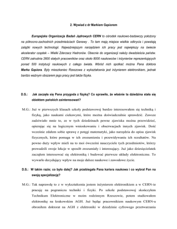 2. Wywiad z dr Markiem Gąsiorem Europejska Organizacja Badań Jądrowych CERN to ośrodek naukowo-badawczy położony na północno-zachodnich przedmieściach Genewy . To tam mają miejsce wielkie odkrycia i powstają zalążki nowych technologii. Najważniejszym narzędziem ich pracy jest największy na świecie akcelerator cząstek – Wielki Zderzacz Hadronów. Obecnie do organizacji należy dwadzieścia państw. CERN zatrudnia 2600 stałych pracowników oraz około 8000 naukowców i inżynierów reprezentujących ponad 500 instytucji naukowych z całego świata. Wśród nich spotkać można Pana doktora Marka Gąsiora. Były mieszkaniec Rzeszowa z wykształcenia jest inżynierem elektronikiem, jednak bardzo ważnym obszarem jego pracy jest także fizyka. D.S.: Jak zaczęła się Pana przygoda z fizyką? Co sprawiło, że właśnie ta dziedzina stała się obiektem pańskich zainteresowań? M.G.: Już w pierwszych klasach szkoły podstawowej bardzo interesowałem się techniką i fizyką, jako naukami ciekawymi, które można doświadczalnie sprawdzić. Zawsze zadziwiało mnie to, ze w tych dziedzinach pewne zjawiska można przewidzieć, opierając się na logicznym wnioskowaniu i obserwacjach innych zjawisk. Dość wcześnie zdałem sobie sprawę z potęgi matematyki, jako narzędzia do opisu zjawisk fizycznych, które pomaga w ich zrozumieniu i przewidywaniu ich rezultatów. Na pewno duży wpływ mieli na to moi ówcześni nauczyciele tych przedmiotów, którzy prowadzili swoje lekcje w sposób zrozumiały i interesujący. Już jako dziesięciolatek zacząłem interesować się elektroniką i budować pierwsze układy elektroniczne. To wywarło decydujący wpływ na moje dalsze naukowe i zawodowe życie. D.S.: W takim razie; co było dalej? Jak przebiegała Pana kariera naukowa i co wybrał Pan na swoją specjalizację? M.G.: Tak naprawdę to z w wykształcenia jestem inżynierem elektronikiem a w CERN-ie pracuję na pograniczu techniki i fizyki. Po szkole podstawowej skończyłem Technikum Elektroniczne w moim rodzinnym Rzeszowie, potem studiowałem elektronikę na krakowskim AGH. Już będąc pracownikiem naukowym CERN-u obroniłem doktorat na AGH z elektroniki w dziedzinie cyfrowego przetwarzania sygnałów. Specjalizuję się w projektowaniu analogowych układów elektronicznych do przetwarzania sygnałów z czujników mierzących parametry wiązek akceleratorowych i samych takich czujników. Wymaga to wiedzy z wielu dość odległych dziecin, takich jak dynamika wiązek akceleratorowych, własności pól elektromagnetycznych, elektronika analogowa, cyfrowe przetwarzanie sygnałów. D.S.: Lecz w jaki sposób stał się Pan członkiem CERN-u? M.G.: Pierwszy raz przyjechałem do CERN-u na dwa miesiące jako tzw. Student Letni („Summer Student). Do złożenia aplikacji zachęcił mnie mój promotor pracy magisterskiej, który pracował w CERN-ie przy jednym z eksperymentów na akceleratorze LEP. Potem przyjechałem na rok na praktykę studencką jako tzw. Student Techniczny („Technical Student”). Po skończeniu studiów i przepracowaniu kilku miesięcy jako programista zostałem przyjęty do mojej obecnej pracy w CERN-ie. D.S.: Czy mógłby Pan powiedzieć parę słów o tym, na czym polega Pana codzienna praca? M.G.: W moim przypadku „codzienna praca” każdego dnia wygląda przynajmniej trochę inaczej. Najczęściej składa się ona z mieszanki następujących aktywności: - Praca w biurze. Tu przy pomocy komputera wykonuję obliczenia i symulacje części składowych systemów nad którymi obecnie pracuję. Poza tym studiuję literaturę fachową, karty katalogowe podzespołów elektronicznych, które zamierzam używać, prowadzę korespondencję. Dość często używam wciąż papieru i ołówka do prowadzenia ręcznych obliczeń i rysowania prostych układów elektronicznych. Dla mnie to jest najważniejsza metoda projektowania czegoś na bardzo podstawowym poziomie. Najważniejsze moje pomysły rodzą się właśnie w ten sposób. - Praca w laboratorium. Tu buduję prototypy i mierzę ich parametry. Najczęściej są to układy elektroniczne, ale zdarzają się elementy mechaniczne. - Dyskusje przy tablicy. Dyskutuje się najczęściej w poszukiwaniu rozwiązań jakichś problemów technicznych, z którymi borykam się ja sam lub któryś z moich kolegów. Opiekuję się także kilkoma studentami i w ten sposób dyskutuję z nimi o ich projektach. - Praca przy akceleratorach. W okresach kiedy akceleratory są zatrzymane, czyli jakieś 3 miesiące w roku, dokonuje się instalacji nowych systemów, renowacji i ulepszeń już istniejących. Zdarza się, że trzeba usuwać usterki lub wprowadzać ulepszenia poza tym okresem. Wtedy akcelerator jest zatrzymywany na krótki czas i trzeba działać jak najszybciej. - Praca w centrum sterowania („control room”). Idzie się tam aby wraz z operatorami przeprowadzać jakieś szczególne testy na systemach, za które jest się odpowiedzialnym. Kilka razy w roku wykonuję także specjalne pomiary, kiedy to wiązka krąży tylko na potrzeby mojego systemu. Jest to czas na studiowanie pracy tego systemu w specyficznych warunkach, które nie są dostępne podczas normalnej pracy akceleratora. D.S.: Najważniejszym projektem CERNu jest Wielki Zderzać Hadronów. Czy Pana zdaniem spełni pokładane w nim nadzieje? M.G.:Wielki Zderzacz na pewno spełnił już wiele nadziei jego konstruktorów. Pod wieloma względami jego parametry przerosły znacznie najśmielsze oczekiwania. Jest to na pewno wspaniałe osiągnięcie techniczne i organizacyjne. Natomiast czy dokona on jakichś przełomowych odkryć to zależy od tego czy są one w zasięgu jego energii i świetlności. Jeśli tak, to będą nowe odkrycia, z cząstką Higgsa włącznie. Jeśli nic nowego nie zostanie znalezione, to będzie znaczyć, ze sporo pozostało nam jeszcze do zrozumienia. W pewnym sensie brak odkrycia byłby jednym z większych odkryć, gdyż najmniej to by