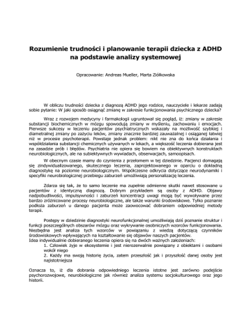 Rozumienie trudności i planowanie terapii dziecka z ADHD na podstawie analizy systemowej Opracowanie: Andreas Mueller, Marta Ziółkowska W obliczu trudności dziecka z diagnozą ADHD jego rodzice, nauczyciele i lekarze zadają sobie pytanie: W jaki sposób osiągnąć zmianę w zakresie funkcjonowania psychicznego dziecka? Wraz z rozwojem medycyny i farmakologii ugruntował się pogląd, iż: zmiany w zakresie substancji biochemicznych w mózgu spowodują zmiany w myśleniu, zachowaniu i emocjach. Pierwsze sukcesy w leczeniu pacjentów psychiatrycznych wskazały na możliwość szybkiej i diametralnej zmiany po zażyciu leków, zmiany znacznie bardziej zauważalnej i osiąganej łatwiej niż w procesie psychoterapii. Powstaje jednak problem: nikt nie zna do końca działania i współdziałania substancji chemicznych używanych w lekach, a większość leczenia dobierana jest na zasadzie prób i błędów. Psychiatria nie opiera się bowiem na obiektywnych konstruktach neurobiologicznych, ale na subiektywnych wywiadach, obserwacjach, samoopisach. W obecnym czasie mamy do czynienia z przełomem w tej dziedzinie. Pacjenci domagają się zindywidualizowanego, skutecznego leczenia, zaprojektowanego w oparciu o dokładną diagnostykę na poziomie neurobiologicznym. Współczesne odkrycia dotyczące neurodynamiki i specyfiki neurobiologicznej przebiegu zaburzeń umożliwiają personalizację leczenia. Zdarza się tak, że to samo leczenie ma zupełnie odmienne skutki nawet stosowane u pacjentów z identyczną diagnozą. Dobrym przykładem są osoby z ADHD. Objawy nadpobudliwości, impulsywności i zaburzeń koncentracji uwagi mogą być wywoływane przez bardzo zróżnicowane procesy neurobiologiczne, ale także warunki środowiskowe. Tylko poznanie podłoża zaburzeń u danego pacjenta może zaowocować dobraniem odpowiedniej metody terapii. Postępy w dziedzinie diagnostyki neurofunkcjonalnej umożliwiają dziś poznanie struktur i funkcji poszczególnych obszarów mózgu oraz wykrywanie osobniczych wzorców funkcjonowania. Niezbędna jest analiza tych wzorców w powiązaniu z wiedzą dotyczącą czynników środowiskowych wpływających na kształtowanie się objawów naszych pacjentów. Idea indywidualnie dobieranego leczenia opiera się na dwóch ważnych założeniach: 1. Człowiek żyje w ekosystemie i jest nierozerwalnie powiązany z obiektami i osobami wokół niego 2. Każdy ma swoją historię życia, zatem przeszłość jak i przyszłość danej osoby jest najistotniejsza Oznacza to, iż dla dobrania odpowiedniego leczenia istotne jest zarówno podejście psychorozwojowe, neurobiologiczne jak również analiza systemu socjokulturowego oraz jego historii. Systemowe rozumienie trudności dziecka z ADHD: Założeniem podejścia systemowego jest odejście od analizy jednostki na rzecz szerszego ujęcia jej funkcjonowania w rodzinie czy grupie w zakresie wielu wymiarów: uwzględniających perspektywę kulturową, genetyczną, społeczną, ekonomiczną oraz indywidualną. Podejście to ma swoje konsekwencje w pracy z dziećmi, rodzinami, ale też dorosłymi. • Pierwszą i najważniejszą konsekwencją jest świadomość terapeuty, że siła do życia musi pochodzić z samego życia i w perspektywie długoterminowej nie może się opierać na osobach trzecich. Pracując z pacjentem pracujemy z całością jego emocji, zachowań, myśli. Terapia jest jedynie wsparciem go w trudnej sytuacji, dotyczy to również farmakoterapii. • Indywidualnie dobrane leczenie musi odpowiedzieć na jeszcze jedno pytanie: w jaki sposób subiektywne teorie umysłu wpływają na stan pacjenta i efekty leczenia. Teorie umysłu są to teorie wyjaśniające wydarzenia życia codziennego jak i zachowania ludzi, dlatego są tak potrzebne każdemu z nas. Zdaje się że powiązanie między poszczególnymi konstruktami a przeżyciami nie jest dostrzegalne od razu. Można wnioskować, iż życie podlega regułom, które stanowią klucz do zrozumienia tylko części spotykających nas zdarzeń. Teorie konstruktywistyczne czerpią z perspektyw psychobiologicznej i psychospołecznej. Być może jest też tak, iż lepsza znajomość neurobiologii wspomoże lepsze zrozumienie indywidualnych konstruktów dotyczących umysłu i świata. • Zindywidualizowana praca z jednostką powinna obejmować planowe i kontrolowane zmiany w całym systemie Zatem neuropsychoterpia w ujęciu systemowym opierać się będzie na dokładnej diagnozie przyczyn trudności na poziomie jednostki oraz systemu. W rozumieniu sytuacji dziecka z ADHD pomocne będzie zapoznanie się z modelem regulacji biosystemowej: Rys.1 Biosystemowy model regulacji ekosystemu (za: Müller, A., Candrian, G., Kropotov, J. (2011) ADHS - Neurodiagnostik in der Praxis. Springer) ) Specyfika pacjenta z ADHD według modelu biosystemowego Poszczególne elementy modelu regulacji ekosystemu można analizować z perspektywy pacjenta z ADHD. Rodzina jako środowisko biospołeczne Rodziny pacjentów z ADHD to nierzadko rodziny, których dotyczy wiele problemów. Trudne sytuacje w tych rodzinach przebiegają zwykle według jednego, powtarzalnego scenariusza. Rodziny te często nieustannie, bez sukcesu poszukują odpowiedniego rozwiązania i wytłumaczenia, dlaczego dziecko jest „takie.” Poszukiwanie rozwiązania w formie gotowego "patentu" kończy się niezadowoleniem i rozpoczyna nowe poszukiwanie, często z nowym terapeutą. Nadzieja pokładana w terapii jest nierealizowana. Jeśli jednak uda się wypracować zaangażowanie i wzajemny szacunek wewnątrz systemu oraz akceptację dla faktu, że życie polega na ciągłym uczeniu się przynosi to ulgę. Nauczyciele jako środowisko biospołeczne Jest wiele typów nauczycieli, jedni są wyjątkowo utalentowani inni nie, ale też dla każdego dziecka najlepiej sprawdza się inny nauczyciel. Pytanie jednak, którzy nauczyciele radzą sobie dobrze z uczniami z ADHD. Hess i Muller przeprowadzili badanie w nurcie systemowym, k