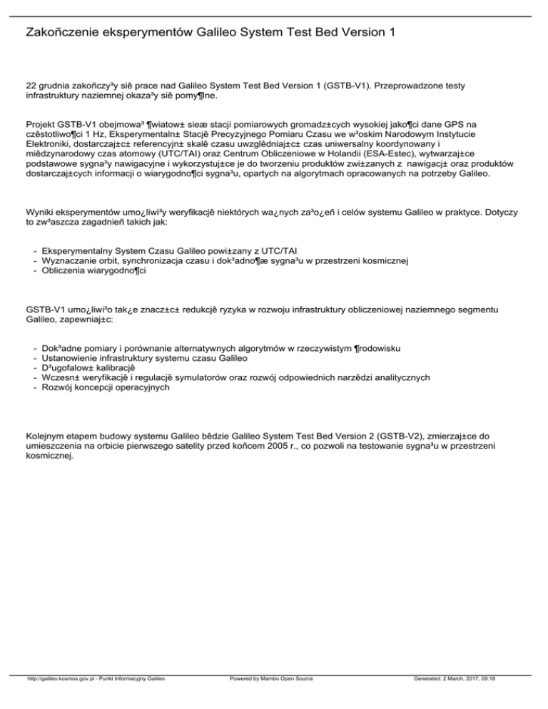 Zakoñczenie eksperymentów Galileo System Test Bed Version 1 22 grudnia zakoñczy³y siê prace nad Galileo System Test Bed Version 1 (GSTB-V1). Przeprowadzone testy infrastruktury naziemnej okaza³y siê pomy¶lne. Projekt GSTB-V1 obejmowa³ ¶wiatow± sieæ stacji pomiarowych gromadz±cych wysokiej jako¶ci dane GPS na czêstotliwo¶ci 1 Hz, Eksperymentaln± Stacjê Precyzyjnego Pomiaru Czasu we w³oskim Narodowym Instytucie Elektroniki, dostarczaj±c± referencyjn± skalê czasu uwzglêdniaj±c± czas uniwersalny koordynowany i miêdzynarodowy czas atomowy (UTC/TAI) oraz Centrum Obliczeniowe w Holandii (ESA-Estec), wytwarzaj±ce podstawowe sygna³y nawigacyjne i wykorzystuj±ce je do tworzeniu produktów zwi±zanych z nawigacj± oraz produktów dostarczaj±cych informacji o wiarygodno¶ci sygna³u, opartych na algorytmach opracowanych na potrzeby Galileo. Wyniki eksperymentów umo¿liwi³y weryfikacjê niektórych wa¿nych za³o¿eñ i celów systemu Galileo w praktyce. Dotyczy to zw³aszcza zagadnieñ takich jak: - Eksperymentalny System Czasu Galileo powi±zany z UTC/TAI - Wyznaczanie orbit, synchronizacja czasu i dok³adno¶æ sygna³u w przestrzeni kosmicznej - Obliczenia wiarygodno¶ci GSTB-V1 umo¿liwi³o tak¿e znacz±c± redukcjê ryzyka w rozwoju infrastruktury obliczeniowej naziemnego segmentu Galileo, zapewniaj±c: - Dok³adne pomiary i porównanie alternatywnych algorytmów w rzeczywistym ¶rodowisku Ustanowienie infrastruktury systemu czasu Galileo D³ugofalow± kalibracjê Wczesn± weryfikacjê i regulacjê symulatorów oraz rozwój odpowiednich narzêdzi analitycznych Rozwój koncepcji operacyjnych Kolejnym etapem budowy systemu Galileo bêdzie Galileo System Test Bed Version 2 (GSTB-V2), zmierzaj±ce do umieszczenia na orbicie pierwszego satelity przed koñcem 2005 r., co pozwoli na testowanie sygna³u w przestrzeni kosmicznej. http://galileo.kosmos.gov.pl - Punkt Informacyjny Galileo Powered by Mambo Open Source Generated: 2 March, 2017, 09:18