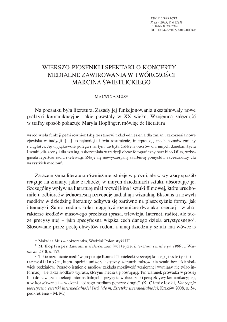 RUCH LITERACKI R. LIV, 2013, Z. 6 (321) PL ISSN 0035-9602 DOI 10.2478/v10273-012-0094-z Wierszo-piosenki i spektaklo-koncerty – medialne zawirowania w twórczości Marcina Świetlickiego Malwina Mus* Na początku była literatura. Zasady jej funkcjonowania ukształtowały nowe praktyki komunikacyjne, jakie powstały w XX wieku. Wzajemną zależność w trafny sposób pokazuje Maryla Hopfinger, mówiąc że literatura wśród wielu funkcji pełni również taką, że stanowi układ odniesienia dla zmian i zakorzenia nowe zjawiska w tradycji. […] co najmniej ułatwia rozumienie, interpretację mechanizmów zmiany i ciągłości. Jej wyjątkowość polega i na tym, że była źródłem wzorów dla innych dziedzin życia i sztuki, dla sceny i dla sztalug, zakorzeniała w tradycji obraz fotograficzny oraz kino i film, wzbogacała repertuar radia i telewizji. Zdaje się niewyczerpaną skarbnicą pomysłów i scenariuszy dla wszystkich mediów. Zarazem sama literatura również nie istnieje w próżni, ale w wyraźny sposób reaguje na zmiany, jakie zachodzą w innych dziedzinach sztuki, absorbując je. Szczególny wpływ na literaturę miał rozwój kina i sztuki filmowej, które uruchomiło u odbiorców jednoczesną percepcję audialną i wizualną. Ekspansja nowych mediów w dziedzinę literatury odbywa się zarówno na płaszczyźnie formy, jak i tematyki. Same media z kolei mogą być rozumiane dwojako: szerzej – w charakterze środków masowego przekazu (prasa, telewizja, Internet, radio), ale także precyzyjniej – jako specyficzna wiązka cech danego dzieła artystycznego. Stosowanie przez poetę chwytów rodem z innej dziedziny sztuki ma wówczas * Malwina Mus – doktorantka, Wydział Polonistyki UJ. M. H o p f i n g e r, Literatura elektroniczna [w:] t e j ż e, Literatura i media po 1989 r., Warszawa 2010, s. 172. Takie rozumienie mediów proponuje Konrad Chmielecki w swojej koncepcji e s t e t y k i i n t e r m e d i a l n o ś c i, która „spełnia uniwersalistyczny warunek traktowania sztuki bez jakichkolwiek podziałów. Ponadto istnienie mediów zakłada możliwość wzajemnej wymiany nie tylko informacji, ale także środków wyrazu, którymi media się posługują. Ten warunek prowadzi w prostej linii do nawiązania relacji intermedialnych i przyjęcia wobec sztuki perspektywy komunikacyjnej, a w konsekwencji – widzenia jednego medium poprzez drugie” (K. C h m i e l e c k i, Koncepcja teoretyczna estetyki intermedialności [w:] i d e m, Estetyka intermedialności, Kraków 2008, s. 54, podkreślenie – M. M.). 690 Malwina Mus konsekwencje dla odbioru i przesłania utworu. W dalszej części swojego wywodu zamierzam pokazać, jak głęboko doświadczenie nowych mediów odbiło się w strukturze poezji Marcina Świetlickiego, a następnie przedstawić, jak zmiana medium, jako nośnika pewnej treści, wpływać może na kształtowanie się jej sensu. Medialne mieszanki – poezja zapatrzona w nowe media Rzeczywistość nowych mediów, stanowczo wkraczając w życie każdego człowieka, stała się ważnym tematem literatury współczesnej. W twórczości Marcina Świetlickiego zwykle bywa negatywnym punktem odniesienia, czego interesującym przykładem jest wiersz Wstęp. Utwór otwierający debiut poety przedstawia sytuację rozpiętą między dwiema czasoprzestrzeniami: mityczną i realistyczną, które niepostrzeżenie mieszają się ze sobą i splatają. Opisany akt stworzenia Abla (głosu mówiącego w wierszu) jest umieszczony w sieci odniesień do Księgi Genesis. Kreacja odbywa się przy pomocy słów, poprzez nazwanie rzeczy dotąd nienazwanych („D a m m u n a i m i ę Abel – p o w i e d z i a ł ten obcy/ człowiek, którego potem tak straszliwie trudno/ będzie n a z y w a ć ojcem”, „Wieczór – gdy to z r o b i l i i n a d a l i i m i ę”). Mowa, język jest materią do tworzenia literatury; z kolei księga natchniona, z której parafrazą mamy w tym przypadku do czynienia, jest zarazem dziełem literackim. Na myśl przychodzi fraza „na początku było Słowo”, która czyni z języka atrybut boski, traktuje tekst jako namacalną reprezentację wartości metafizycznych. Nie bez znaczenia tego typu konotacje zawiera utwór inicjujący całą wydawniczą spuściznę Świetlickiego; można go potraktować jako metawypowiedź na temat funkcji poezji i szerzej – literatury. Motywy genezyjskie, podobnie jak imię bohatera, występują tu w konkretnej roli – wszystkie znamionują grzech, wstyd, sytuację ofiary. Tworzą one rzeczywistość symboliczną będącą jakoby rewersem realnego świata – prozaicznego, obskurnego, płytkiego, którego elementami są nowe media. W trybie dosłownym, w chwili gdy rodzice bohatera odbywali akt płciowy, w którego konsekwencji narodził się Abel, „[…] ojciec ojca kaszlał i krzyczał za ścianą/ w obcym języku klątwy, a radio trzeszczało,/ trzeszczało i huczało niczym miecz ognisty”. Dźwięk radia wprowadza do obrazu niepokój, widmo grzechu, przewinienia, przywołuje wątki apokaliptyczne. W opisie pomieszczenia pojawia się także „[…] miesięcznik/ «Ty i ja», który leżał na stole pod lampą/ – otwarty, wcale nie przypadkiem, na pierwszej stronicy”. Słowo „stronica” kontrastuje z własnym desygnatem, bardziej niż z kolorowym czasopismem kojarzy się z opasłą, mądrą księgą, taką jak Biblia. M. Ś w i e t l i c k i, Wstęp [w:] t e g o ż, Wiersze, Kraków 2011, s. 11. Wszystkie przywołane w tekście wiersze cytuję za tym wydaniem. W nawiasach podaję tytuł utworu oraz numer strony z edycji zbiorowej (podkreślenia – M. M.; wskazują na związek między działaniem a nazywaniem). Wierszo-piosenki i spektaklo-koncerty – medialne zawirowania… 691 Paralela między odniesieniami do Księgi Genesis otwierającej Stary Testament, utworem inicjującym debiutancki tom poetycki Marcina Świetlickiego, i pierwszą kartką miesięcznika „Ty i ja” kompromituje o