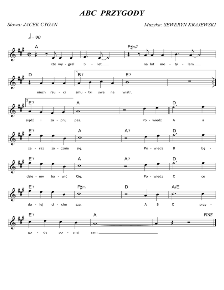 ABC PRZYGODY Słowa: JACEK CYGAN & ### h = 90 Muzyka: SEWERYN KRAJEWSKI ‰ œj œ C Œ A œ. œ Kto wy -‐ grał # # # DŒ & œ niech & ### & # # # Eœ 7 œ & # # # Eœ 7 œ & # # # Eœ 7 œ 2 œ E7 œ œ siądź i rzu -‐ ci œ œ œ œ dy po œ œ swe na wiatr. mo w Ó się. œ œ œ œ Po -‐ wiedz w Ó A A7 Cię. œ œ Po -‐ wiedz #m w Ó F D sza. œ A znaj sam. w -‐ ty -‐ lem .. ∑ Po -‐ wiedz A7 j œ ˙ œ. w Ó A -‐ j ‰ œ œ œ na lot pas. ci -‐ cho œ œ E7 w œ œ let A œ œ Œ #m 7 -‐ smu -‐ tki ba -‐ wić da -‐ lej -‐ œ za -‐ cznie dzie -‐ my go B7 za -‐ pnij za -‐ raz # # # Eœ 7 & 1 œ œ bi j œ ˙ F ˙. œ A a ˙. œ B bę ˙. œ C co D D D œ œ A/E ˙. œ A B C przy œ Œ Ó -‐ -‐ FINE