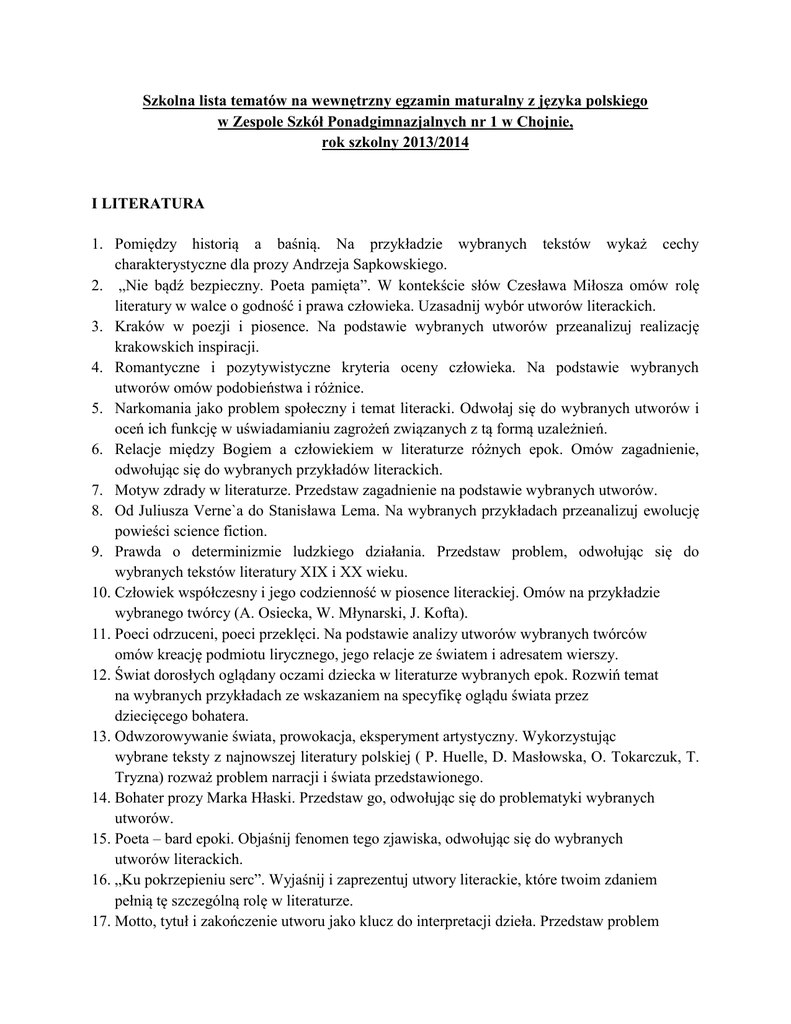 Szkolna lista tematów na wewnętrzny egzamin maturalny z języka polskiego w Zespole Szkół Ponadgimnazjalnych nr 1 w Chojnie, rok szkolny 2013/2014 I LITERATURA 1. Pomiędzy historią a baśnią. Na przykładzie wybranych tekstów wykaż cechy charakterystyczne dla prozy Andrzeja Sapkowskiego. 2. „Nie bądź bezpieczny. Poeta pamięta”. W kontekście słów Czesława Miłosza omów rolę literatury w walce o godność i prawa człowieka. Uzasadnij wybór utworów literackich. 3. Kraków w poezji i piosence. Na podstawie wybranych utworów przeanalizuj realizację krakowskich inspiracji. 4. Romantyczne i pozytywistyczne kryteria oceny człowieka. Na podstawie wybranych utworów omów podobieństwa i różnice. 5. Narkomania jako problem społeczny i temat literacki. Odwołaj się do wybranych utworów i oceń ich funkcję w uświadamianiu zagrożeń związanych z tą formą uzależnień. 6. Relacje między Bogiem a człowiekiem w literaturze różnych epok. Omów zagadnienie, odwołując się do wybranych przykładów literackich. 7. Motyw zdrady w literaturze. Przedstaw zagadnienie na podstawie wybranych utworów. 8. Od Juliusza Verne`a do Stanisława Lema. Na wybranych przykładach przeanalizuj ewolucję powieści science fiction. 9. Prawda o determinizmie ludzkiego działania. Przedstaw problem, odwołując się do wybranych tekstów literatury XIX i XX wieku. 10. Człowiek współczesny i jego codzienność w piosence literackiej. Omów na przykładzie wybranego twórcy (A. Osiecka, W. Młynarski, J. Kofta). 11. Poeci odrzuceni, poeci przeklęci. Na podstawie analizy utworów wybranych twórców omów kreację podmiotu lirycznego, jego relacje ze światem i adresatem wierszy. 12. Świat dorosłych oglądany oczami dziecka w literaturze wybranych epok. Rozwiń temat na wybranych przykładach ze wskazaniem na specyfikę oglądu świata przez dziecięcego bohatera. 13. Odwzorowywanie świata, prowokacja, eksperyment artystyczny. Wykorzystując wybrane teksty z najnowszej literatury polskiej ( P. Huelle, D. Masłowska, O. Tokarczuk, T. Tryzna) rozważ problem narracji i świata przedstawionego. 14. Bohater prozy Marka Hłaski. Przedstaw go, odwołując się do problematyki wybranych utworów. 15. Poeta – bard epoki. Objaśnij fenomen tego zjawiska, odwołując się do wybranych utworów literackich. 16. „Ku pokrzepieniu serc”. Wyjaśnij i zaprezentuj utwory literackie, które twoim zdaniem pełnią tę szczególną rolę w literaturze. 17. Motto, tytuł i zakończenie utworu jako klucz do interpretacji dzieła. Przedstaw problem na wybranych przykładach. 18. Tematyka historyczna jako tworzywo literatury polskiej XIX i XX wieku. Omów wybrane przykłady. 19. Samotni z wyboru i samotni z konieczności. Scharakteryzuj sposoby kreowania takich bohaterów w utworach różnych epok. 20. Koncepcja tragizmu w teatrze antycznym, szekspirowskim i romantycznym. Przedstaw je odwołując się do wybranych dramatów z różnych epok literackich. 21. Sposoby wykorzystania mitów i legend średniowiecza w literaturze współczesnej. Przedstaw je, odwołując się do wybranych przykładów. 22. Bohater w zgodzie ze światem. Przedstaw i porównaj postacie szczęśliwych bohaterów wybranych utworów. 23. Dzieci i rodzice w literaturze różnych epok. Przedstaw to zagadnienie w oparciu o wybrane utwory. 24. Polska literatura fantastyczna i historyczna – dwa sposoby mówienia o rzeczywistości. Porównaj, jaką pełnią funkcję, odwołując się do wybranych przykładów. 25. Walka dobra ze złem. Omów temat odwołując się do wybranych dzieł literatury romantycznej. 26. Doświadczenie Holocaustu – pisarskie świadectwa z obu stron muru. Omów problem, analizując stosowne utwory literackie. 27. Ludzie godni i nikczemni w literaturze. Scharakteryzuj ich postawy, odwołując się do wybranych utworów. 28. Małżeństwa literackie. Przedstaw zagadnienie, charakteryzując wybrane pary literackie. 29. Satyryczny obraz społeczeństwa polskiego w wybranych utworach literackich. Przeanalizuj sposoby tworzenia takiego obrazu. 30. Literacki obraz zniewolenia człowieka w systemie totalitarnym. Wyjaśnij, jak literatura polska i obca ilustruje mechanizmy i skutki działania totalitaryzmu. 31. Obraz wsi i chłopa w literaturze. Dokonaj analizy wybranych przykładów literackich. 32. Różne obrazy polskiego dworu – od sielanki do parodii. Przedstaw temat na wybranych przykładach literackich. 33. Idealiści i marzyciele w polskiej literaturze. Scharakteryzuj sposoby kreowania takich bohaterów w literaturze różnych epok. 34. Dobre i złe oblicze szlachcica Sarmaty. Scharakteryzuj wybranych bohaterów literackich na celowo dobranych tekstach. 35. Żydzi w literaturze polskiej. Przedstaw obraz społeczności żydowskiej lub jej pojedynczych reprezentantów na podstawie wybranych dzieł literatury XIX i XX wieku. 36. Trudny problem dziedzictwa sarmackiego w literaturze epok późniejszych – omów, charakteryzując wybrane przykłady. 37. Awangarda i tradycja w poezji lub prozie polskiej dwudziestolecia międzywojennego. Omów zagadnienie na wybranych przykładach literackich. 38. Różne obrazy rodziny w literaturze. Omów zagadnienie, odwołując się do kilku wybranych przykładów z różnych epok. 39. Polskie hymny – utwory o narodzie i jego tożsamości. Przeanalizuj wybrane teksty. Przedstaw ich wartość i sposób oddziaływania na zbiorowość. 40. Rewolucja jako temat utworów literackich. Scharakteryzuj sposób ujęcia tematu w wybranych tekstach. 41. Postacie i symbole antyczne w poezji Zbigniewa Herberta. Rozważ problem na wybranych przykładach. 42. Różne wizerunki lekarza w literaturze. Omów zagadnienie na wybranych przykładach z różnych epok literackich. 43. Życiowe wybory i ich skutki. Przedstaw problem na podstawie wybranych bohaterów literackich. 44. Literackie kreacje tyranów. Dokonaj analizy i interpretacji wybranych tekstów, uwzględnij odpowiednie konteksty