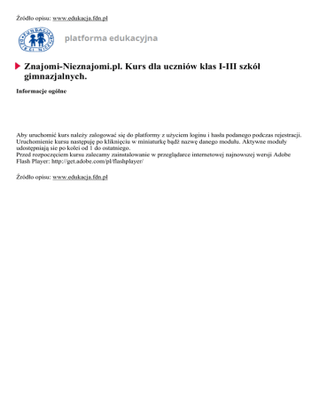 ħUyGáRRSLVXwww.edukacja.fdn.pl =QDMRPL1LH]QDMRPLSO.XUVGODXF]QLyZNODV,,,,V]Nyá gimnazjalnych. Informacje ogólne $E\XUXFKRPLüNXUVQDOHĪ\]DORJRZDüVLĊGRSODWIRUP\]XĪ\FLHPORJLQXLKDVáDSRGDQHJRSRGF]DVUHMHVWUDFML 8UXFKRPLHQLHNXUVXQDVWĊSXMĊSRNOLNQLĊFLXZPLQLDWXUNĊEąGĨQD]ZĊGDQHJRPRGXáX$NW\ZQHPRGXá\ XGRVWĊSQLDMąVLHSRNROHLRG1 do ostatniego. 3U]HGUR]SRF]ĊFLHPNXUVX]DOHFDP\]DLQVWDORZDQLHZSU]HJOąGDUFHLQWHUQHWRZHMQDMQRZV]HMZHUVML$GREH Flash Player: http://get.adobe.com/pl/flashplayer/ ħUyGáRRSLVXwww.edukacja.fdn.pl