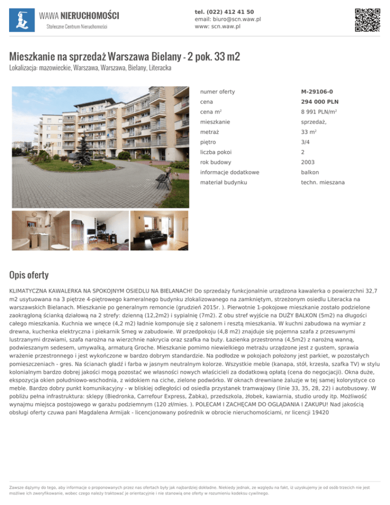 tel. (022) 412 41 50 email: [email protected] www: scn.waw.pl Mieszkanie na sprzedaż Warszawa Bielany - 2 pok. 33 m2 Lokalizacja: mazowieckie, Warszawa, Warszawa, Bielany, Literacka numer oferty M-29106-0 cena 294 000 PLN cena m 8 991 PLN/m2 mieszkanie sprzedaż, metraż 33 m2 piętro 3/4 liczba pokoi 2 rok budowy 2003 informacje dodatkowe balkon materiał budynku techn. mieszana 2 Opis oferty KLIMATYCZNA KAWALERKA NA SPOKOJNYM OSIEDLU NA BIELANACH! Do sprzedaży funkcjonalnie urządzona kawalerka o powierzchni 32,7 m2 usytuowana na 3 piętrze 4-piętrowego kameralnego budynku zlokalizowanego na zamkniętym, strzeżonym osiedlu Literacka na warszawskich Bielanach. Mieszkanie po generalnym remoncie (grudzień 2015r. ). Pierwotnie 1-pokojowe mieszkanie zostało podzielone zaokrągloną ścianką działową na 2 strefy: dzienną (12,2m2) i sypialnię (7m2). Z obu stref wyjście na DUŻY BALKON (5m2) na długości całego mieszkania. Kuchnia we wnęce (4,2 m2) ładnie komponuje się z salonem i resztą mieszkania. W kuchni zabudowa na wymiar z drewna, kuchenka elektryczna i piekarnik Smeg w zabudowie. W przedpokoju (4,8 m2) znajduje się pojemna szafa z przesuwnymi lustrzanymi drzwiami, szafa narożna na wierzchnie nakrycia oraz szafka na buty. Łazienka przestronna (4,5m2) z narożną wanną, podwieszanym sedesem, umywalką, armaturą Groche. Mieszkanie pomimo niewielkiego metrażu urządzone jest z gustem, sprawia wrażenie przestronnego i jest wykończone w bardzo dobrym standardzie. Na podłodze w pokojach położony jest parkiet, w pozostałych pomieszczeniach - gres. Na ścianach gładź i farba w jasnym neutralnym kolorze. Wszystkie meble (kanapa, stół, krzesła, szafka TV) w stylu kolonialnym bardzo dobrej jakości mogą pozostać we własności nowych właścicieli za dodatkową opłatą (cena do negocjacji). Okna duże, ekspozycja okien południowo-wschodnia, z widokiem na ciche, zielone podwórko. W oknach drewniane żaluzje w tej samej kolorystyce co meble. Bardzo dobry punkt komunikacyjny - w bliskiej odległości od osiedla przystanek tramwajowy (linie 33, 35, 28, 22) i autobusowy. W pobliżu pełna infrastruktura: sklepy (Biedronka, Carrefour Express, Żabka), przedszkola, żłobek, kawiarnia, studio urody itp. Możliwość wynajmu miejsca postojowego w garażu podziemnym (120 zł/mies. ). POLECAM I ZACHĘCAM DO OGLĄDANIA I ZAKUPU! Nad jakością obsługi oferty czuwa pani Magdalena Armijak - licencjonowany pośrednik w obrocie nieruchomościami, nr licencji 19420 Zawsze dążymy do tego, aby informacje o proponowanych przez nas ofertach były jak najbardziej dokładne. Niekiedy jednak, ze względu na fakt, iż uzyskujemy je od osób trzecich nie jest możliwe ich zweryfikowanie, wobec czego należy traktować je orientacyjnie i nie stanowią one oferty w rozumieniu kodeksu cywilnego. tel. (022) 412 41 50 email: [email protected] www: scn.waw.pl Lokalizacja Osoba kontaktowa Lana Suchocka województwo mazowieckie powiat Warszawa [email protected] miasto Warszawa dzielnica Bielany ulica Literacka Chętnie udzielę dodatkowych informacji związanych z tą ofertą. Zapraszam do kontaktu! tel. 530 94 96 06 Zawsze dążymy do tego, aby informacje o proponowanych przez nas ofertach były jak najbardziej dokładne. Niekiedy jednak, ze względu na fakt, iż uzyskujemy je od osób trzecich nie jest możliwe ich zweryfikowanie, wobec czego należy traktować je orientacyjnie i nie stanowią one oferty w rozumieniu kodeksu cywilnego.