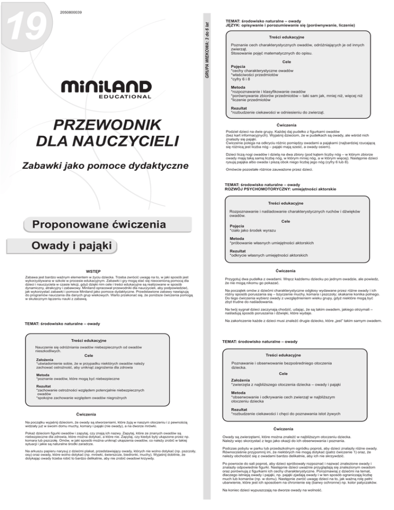 GRUPA WIEKOWA: 3 do 6 lat 19 2050800039 TEMAT: środowisko naturalne – owady JĘZYK: opisywanie i porozumiewanie się (porównywanie, liczenie) Treści edukacyjne Poznanie cech charakterystycznych owadów, odróżniających je od innych zwierząt. Stosowanie pojęć matematycznych do opisu. Cele Pojęcia *cechy charakterystyczne owadów *właściwości przedmiotów *cyfry 6 i 8 Metoda *rozpoznawanie i klasyfikowanie owadów *porównywanie zbiorów przedmiotów – taki sam jak, mniej niż, więcej niż *liczenie przedmiotów Rezultat *rozbudzenie ciekawości w odniesieniu do zwierząt. PRZEWODNIK DLA NAUCZYCIELI Zabawki jako pomoce dydaktyczne Ćwiczenia Podziel dzieci na dwie grupy. Każdej daj pudełko z figurkami owadów (bez kart informacyjnych). Wyjaśnij dzieciom, że w pudełkach są owady, ale wśród nich znalazły się pająki. Ćwiczenie polega na odkryciu różnic pomiędzy owadami a pająkami (najbardziej rzucającą się różnicą jest liczba nóg – pająki mają sześć, a owady osiem). Dzieci liczą nogi owadów i dzielą na dwa zbiory (pod kątem liczby nóg – w którym zbiorze owady mają taką samą liczbę nóg, w którym mniej nóg, a w którym więcej). Następnie dzieci rysują pająka albo owada i piszą obok niego liczbę jego nóg (cyfry 6 lub 8). Omówcie pozostałe różnice zauważone przez dzieci. TEMAT: środowisko naturalne – owady ROZWÓJ PSYCHOMOTORYCZNY: umiejętności aktorskie Treści edukacyjne Rozpoznawanie i naśladowanie charakterystycznych ruchów i dźwięków owadów. Proponowane ćwiczenia Owady i pająki WSTĘP Zabawa jest bardzo ważnym elementem w życiu dziecka. Trzeba zwrócić uwagę na to, w jaki sposób jest wykorzystywana w szkole w procesie edukacyjnym. Zabawki i gry mogą stać się nieocenioną pomocą dla dzieci i nauczyciela w czasie lekcji, gdyż dzięki nim cele i treści edukacyjne są realizowane w sposób dynamiczny, atrakcyjny i zabawowy. Miniland opracował przewodniki dla nauczycieli, aby podpowiedzieć, jak wykorzystać zabawki i pomoce Miniland jako pomoce dydaktyczne. Przedstawione zabawy nawiązują do programów nauczania dla danych grup wiekowych. Warto przekonać się, że poniższe ćwiczenia pomogą w skutecznym łączeniu nauki z zabawą. Cele Pojęcia *ciało jako środek wyrazu Metoda *próbowanie własnych umiejętności aktorskich Rezultat *odkrycie własnych umiejętności aktorskich Ćwiczenia Przygotuj dwa pudełka z owadami. Wręcz każdemu dziecku po jednym owadzie, ale powiedz, że nie mogą nikomu go pokazać. Na początek omów z dziećmi charakterystyczne odgłosy wydawane przez różne owady i ich różny sposób poruszania się – bzyczenie muchy, komara i pszczoły; skakanie konika polnego. Do tego ćwiczenia wybierz owady z uwzględnieniem wieku grupy, gdyż niektóre mogą być zbyt trudne do naśladowania. Na twój sygnał dzieci zaczynają chodzić, udając, że są takim owadem, jakiego otrzymali – naśladują sposób poruszania i dźwięki, które wydaje. TEMAT: środowisko naturalne – owady Treści edukacyjne Na zakończenie każde z dzieci musi znaleźć drugie dziecko, które „jest” takim samym owadem. TEMAT: środowisko naturalne – owady Nauczenie się odróżniania owadów niebezpiecznych od owadów nieszkodliwych. Cele Założenia *uświadomienie sobie, że w przypadku niektórych owadów należy zachować ostrożność, aby uniknąć zagrożenia dla zdrowia Metoda *poznanie owadów, które mogą być niebezpieczne Rezultat *zachowanie ostrożności względem potencjalnie niebezpiecznych owadów *spokojne zachowanie względem owadów niegroźnych Ćwiczenia Na początku wyjaśnij dzieciom, że owady są stworzeniami, które żyją w naszym otoczeniu i z pewnością widziały już w swoim domu muchy, komary i pająki (nie owady), a na dworze mrówki. Pokaż dzieciom figurki owadów i zapytaj, czy znają ich nazwy. Zapytaj, które ze znanych owadów są niebezpieczne dla zdrowia, które można dotykać, a które nie. Zapytaj, czy kiedyś były ukąszone przez np. komara lub pszczołę. Omów, w jaki sposób można uniknąć ukąszenia owadów, co należy zrobić w takiej sytuacji i jakie są naturalne środki zaradcze. Na arkuszu papieru narysuj z dziećmi plakat, przedstawiający owady, których nie wolno dotykać (np. pszczoły, osy) oraz owady, które wolno dotykać (np. mrówki, świerszcze, biedronki, muchy). Wyjaśnij dobitnie, że dotykając owady trzeba robić to bardzo delikatnie, aby nie zrobić owadowi krzywdy. Treści edukacyjne Poznawanie i obserwowanie bezpośredniego otoczenia dziecka. Cele Założenia *zwierzęta z najbliższego otoczenia dziecka – owady i pająki Metoda *obserwowanie i odkrywanie cech zwierząt w najbliższym otoczeniu dziecka Rezultat *rozbudzenie ciekawości i chęci do poznawania istot żywych Ćwiczenia Owady są zwierzętami, które można znaleźć w najbliższym otoczeniu dziecka. Należy więc skorzystać z tego jako okazji do ich obserwowania i poznania. Podczas pobytu w parku lub przedszkolnym ogródku poproś, aby dzieci znalazły różne owady. Równocześnie przypomnij im, że niektórych nie mogą dotykać (patrz ćwiczenie 1) oraz, że należy obchodzić się z owadami bardzo delikatnie, aby ich nie skrzywdzić. Po powrocie do sali poproś, aby dzieci spróbowały rozpoznać i nazwać znalezione owady i znalazły odpowiednie figurki. Następnie dzieci uważnie przyglądają się znalezionym owadom oraz porównują z figurkami ich cechy charakterystyczne. Porozmawiaj z dziećmi na temat, dlaczego istnieją owady i pająki, np. pająki zjadają owady i w ten sposób ograniczają liczbę much lub komarów (np. w domu). Następnie zwróć uwagę dzieci na to, jak ważną rolę pełni ubarwienie, które jest ich sposobem na chronienie się (barwy ochronne) np. kolor patyczaków. Na koniec dzieci wypuszczają na dworze owady na wolność. Treści edukacyjne Odkrywanie i stosowanie własnych funkcji motorycznych, rozwój ko