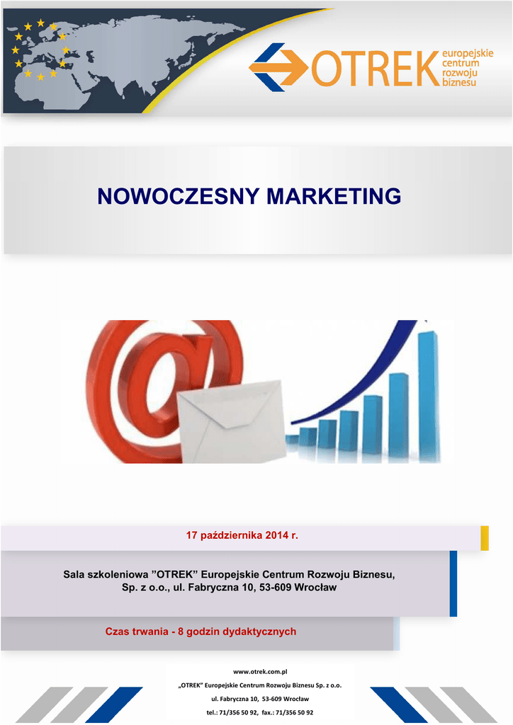 NOWOCZESNY MARKETING 17 października 2014 r. Sala szkoleniowa ”OTREK” Europejskie Centrum Rozwoju Biznesu, Sp. z o.o., ul. Fabryczna 10, 53-609 Wrocław Czas trwania - 8 godzin dydaktycznych www.otrek.com.pl „OTREK” Europejskie Centrum Rozwoju Biznesu Sp. z o.o. ul. Fabryczna 10, 53-609 Wrocław tel.: 71/356 50 92, fax.: 71/356 50 92 Cel szkolenia: Celem szkolenia jest przyjrzenie się nowym trendom marketingu oraz przegląd nowoczesnych narzędzi marketingu i e-marketingu wraz z analizą sposobu ich wykorzystania w praktyce. Wykładowca: Ilona Piechota - trener biznesu, doradca i konsultant zarządzania oraz coach. Specjalizuje się w szkoleniach z zakresu budowania i zarządzania wizerunkiem, PR, marketingu, komunikacji interpersonalnej. Obszary jej aktywności trenerskiej oscylują także wokół szeroko pojętego zarządzania (np. projektami, zespołem/personelem, począwszy od rekrutacji i selekcji, poprzez budowanie autorytetu lidera, style kierownicze, motywowanie, rozwiązywanie konfliktów, a skończywszy na radzeniu sobie ze stresem i wypaleniem zawodowym). Miejsce i czas szkolenia: Sala szkoleniowa „OTREK” Europejskie Centrum Rozwoju Biznesu Sp. z o.o., ul. Fabryczna 10, 53-609 Wrocław, w godzinach 9:00 – 16:00 Ramowy program szkolenia: Zgłoszenia: Zgłoszenie udziału w szkoleniu należy przesłać faksem na nr 71/356 50 92, najpóźniej na 5 dni przed terminem rozpoczęcia zajęć. Formularz zgłoszenia w załączeniu lub do pobrania z naszej strony, www.otrek.com.pl Kontakt: Dodatkowych informacji Halina Skórska, Tel. 71/ 356 email: [email protected] udziela: 50 90, Cena: Opłata za szkolenie wynosi 490, 00 PLN + 23% VAT i obejmuje udział w szkoleniu, materiały dydaktyczne piśmiennicze, przerwy kawowe oraz zaświadczenie. Należność za udział w szkoleniu, prosimy przekazać przelewem, po otrzymaniu potwierdzenia o rozpoczęciu szkolenia, na konto: BZ WBK I/O Wrocław, Nr: 85 1090 2398 0000 0001 1426 1336 Budowanie marki i kreowanie pozytywnego wizerunku firmy: • marka, jako narzędzie komunikacji marketingowej, • zarządzanie marką - budowa i utrwalanie wartości marki, tworzenie strategii marki, • • marka, jako element przewagi konkurencyjnej oraz jeden z kluczowych aktywów firmy • wykorzystanie narzędzi PR w budowaniu wizerunku firmy i marki. Marketing bezpośredni, jako element ogólnej strategii marketingowej przedsiębiorstwa: • bazy danych, jako podstawa działań w marketingu bezpośrednim, • media reklamy bezpośredniej: bezpośrednie przesyłki pocztowe, emailing, fax-mailing, telemarketing, prasa, telewizja, radio, Internet, • usługi dodatkowe w ramach marketingu bezpośredniego, • budowanie trwałych relacji z klientami. E-mail marketing i telemarketing – skuteczna i niedroga komunikacja z klientami: • kiedy e-mail marketing i telemarketing może być skuteczny? • konstrukcja skutecznego przekazu marketingowego w wiadomości e-mail, • pomiar i analiza skuteczności akcji e-mail i telemarketingowych, • marketing wystawienniczy, • targi, ekspozycje, wystawy, pokazy handlowe a marketing mix, • strukturalne włączenie strategii targowej w strategię marketingową firmy, • warunki skuteczności - właściwe przygotowanie targów i wystaw, sposób obsługi, podjęcie działań marketingowych i handlowych po zakończeniu imprezy, itd. Cross selling, up selling, promocja dodatkowa – nowa odsłona „starych” narzędzi: • techniki marketingowe Cross selling i up selling, jako metody zwiększające skuteczność oferty i średni dochód z transakcji, • promocja dodatkowa – zaprzęgnięcie kreatywności do biznesu. Podsumowanie – Optymalizacja zasobów marketingowych