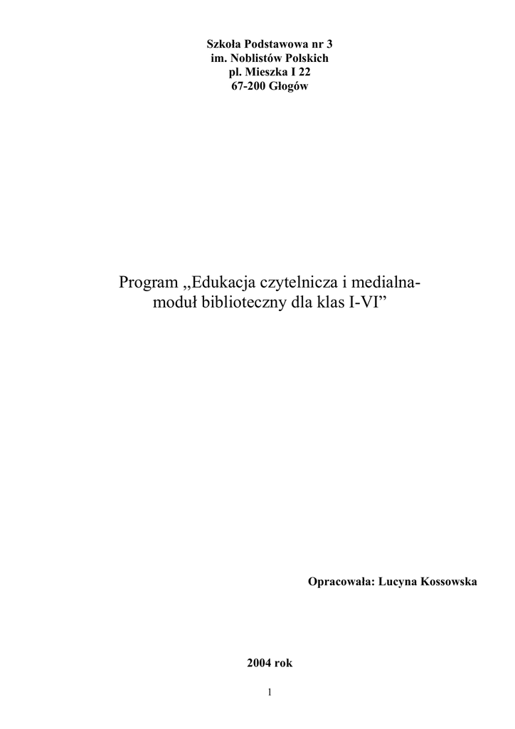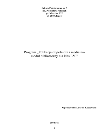 Szkoła Podstawowa nr 3 im. Noblistów Polskich pl. Mieszka I 22 67-200 Głogów Program ,,Edukacja czytelnicza i medialnamoduł biblioteczny dla klas I-VI” Opracowała: Lucyna Kossowska 2004 rok 1 SPIS TREŚCI STRONA Wstęp ...................................................................................................... 3 Założenia programu ................................................................................ 3 Cele programu ......................................................................................... 4 Treści edukacyjne .................................................................................... 6 Osiągnięcia ucznia po zrealizowaniu programu ...................................... 20 Procedury osiągania celów....................................................................... 20 Metody oceny osiągnięć uczniów ........................................................... 21 Ewaluacja ................................................................................................ 21 Załączniki ................................................................................................ 22 Bibliografia ............................................................................................. 53 2 WSTĘP W dobie przekazu medialnego niezmiernie ważny jest rozwój czytelnictwa. Wspieranie go jest ważnym zadaniem współczesnej edukacji. Należy zachęcać uczniów nie tylko do czytania lektur, ale i sięgania po książki i czasopisma dostępne na rynku, w bibliotekach szkolnych i publicznych. Aby funkcjonować we współczesnym świecie uczeń musi umieć pobierać informacje, przetwarzać je i wykorzystywać do różnych celów. Bezpośredni kontakt z książką, biblioteką zapewnia dzieciom rozwój zainteresowań czytelniczych, dostęp do źródeł informacji, trwałe przeżycia estetyczne i emocjonalne. Nauczyciel poprzez świadome nauczanie winien pokierować pracą tak, by dzieci dostrzegły różnicę między wartościowymi pozycjami z literatury, filmu czy programów komputerowych, a komercyjną, masową produkcją. Korzystanie z różnych źródeł informacji wzbogaca wiedzę dziecka, a poprzez przyswajanie coraz to nowych słów, poszerza jego zasób słownictwa. Dlatego tak ważnym zadaniem dla nauczyciela bibliotekarza i pozostałych nauczycieli jest zachęcanie dzieci do korzystania ze zbiorów biblioteki, zgromadzonych w niej książek, czasopism i innych dokumentów. ZAŁOŻENIA PROGRAMU Reforma oświaty wprowadziła obowiązek realizacji ścieżek edukacyjnych, w tym także edukacji czytelniczej i medialnej. Ścieżka czytelnicza i medialna stawia przede wszystkim na umiejętności istotne dla rozwoju ucznia i jego samokształcenia: efektywne współdziałanie w grupie, rozwiązywanie problemów w sposób twórczy oraz poszukiwanie, porządkowanie i wykorzystywanie informacji z różnych źródeł. Część tych zadań w ramach ścieżki realizują nauczyciele bibliotekarza na zajęciach grupowych w bibliotece. Proponowany program ,,Edukacja czytelnicza i medialna – moduł biblioteczny dla klas I-VI” jest realizowany na zajęciach grupowych w bibliotece. Obejmuje pierwszy i drugi etap edukacji szkolnej. Został opracowany zgodnie z rozporządzeniem Ministra Edukacji Narodowej z dnia 5 lutego 2004 roku w sprawie podstawy programowej kształcenia ogólnego (Dz. U. Nr 25 z dnia 5 lutego 2004 r., poz. 220). W podstawie programowej dla sześcioletniej szkoły podstawowej znalazły się treści wprowadzające ucznia w zakres wiedzy z edukacji czytelniczej i medialnej. W nauczaniu zintegrowanym zagadnieniu temu służą takie treści jak: • • • • • Słuchanie baśni, opowiadań i legend, w tym z własnego regionu, jako inspiracji do słownego i pozasłownego wyrażania treści i przeżyć. Sięganie do różnych źródeł informacji i technologii informacji, w tym korzystanie z czytelni i biblioteki szkolnej. Pisanie swobodnych tekstów, opowiadań i opisów. Głośne i ciche czytanie ze zrozumieniem. Wielość środków komunikacji. Na drugim etapie nauczania z treści ścieżki edukacji czytelniczej i medialnej zostały wybrane zagadnienia: • Dzieje pisma, książki. • Wydawnictwa informacyjne (encyklopedie, słowniki). • Katalogi. Kartoteki. • Literatura popularnonaukowa. • Układ treści książki i czasopisma. • Biblioteka domowa. Biblioteka publiczna – osiedlowa. • Rodzaje mediów, ich istota i zasady funkcjonowania. 3 CELE PROGRAMU CELE OGÓLNE • • • • • wspomaganie wszechstronnego i harmonijnego rozwoju ucznia, w tym szczególnie umiejętności służących zdobywaniu wiedzy, przygotowanie do samodzielnego poszukiwania potrzebnych informacji i materiałów, przygotowanie do odbioru informacji rozpowszechnianych przez media, przygotowanie do świadomego i odpowiedzialnego korzystania ze środków masowej komunikacji (telewizji, komputerów, prasy itp.) kształtowanie postawy szacunku dla polskiego dziedzictwa kulturowego w związku z globalizacją kultury masowej. CELE SZCZEGÓŁOWE • • • • • • • • • • • • kształcenie umiejętności samodzielnego korzystania ze zbiorów bibliotecznych, wyrabianie nawyku czytania oraz zamiłowania do książek, poznanie terminów i pojęć związanych z biblioteką i książką, wdrażanie do poszanowania książek i innych dokumentów bibliotecznych jako dóbr kultury i czynników rozwoju społecznego, kształtowanie umiejętności wyszukiwania materiałów na określony temat za pomocą katalogów i kartotek, rozwijanie umiejętności korzystania z różnych typów wydawnictw i wyszukiwania w nich informacji, wdrażanie uczniów do tworzenia własnego warsztatu pracy umysłowej, rozwijanie i utrwalenie zainteresowań, potrzeb i nawyków czytelniczych z uwzględnieniem indywidualnych uzdolnień uczniów, kształcenie i utrwalenie nawyków kulturalnego obcowania z książką i innymi nośnikami informacji, wdrażanie do 