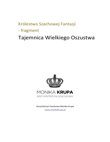 Królestwo Szachowej Fantazji - fragment Tajemnica Wielkiego Oszustwa Arcymistrzyni Szachowa Monika Krupa www.monikakrupa.pl Królestwo Szachowej Fantazji Pałac Schönbrunn, Wielka Galeria, piątek, 9 marca 1770. „Mundus vult decipi” - świat chce być oszukiwany, niechże więc będzie Orkiestra przestała grać rondo „Alla Turca”, kiedy herold zatrzymując się przed tronem cesarzowej Marii Teresy obwieścił: Johann Wolfgang de Kempelen i jego eksperyment. Wynalazca po wykonaniu głębokiego ukłonu oznajmił: „Kiedy stałem w tym miejscu pół roku temu obiecałem Waszej Cesarskiej Mości stworzyć automat, który będzie umiał myśleć! Doskonały jego mechanizm pokona każdego człowieka, który rzuci mu wyzwanie i to w najtrudniejszej ze wszystkich gier, w grze królów. Pomysł tego eksperymentu przyszedł mi do głowy po partii szachów, którą pół roku temu Wasza Wysokość mnie zaszczyciła ”. Kiedy kończył przemowę pochwycił dwa narożniki płótna, które szczelnie zasłaniały ukryte monstrum. Okrzyki zdumienia licznie zgromadzonej publiczności potwierdzały doniosłość zdarzenia. Władczyni rzuciła okiem na siedzącą przy szerokiej na dwa łokcie „orzechowej” komodzie niezwykłą postać. Był to Turek ubrany w jedwabną koszulę bez kołnierza, oraz czerwony atłasowy kaftan z rękawami do łokcia. W trzech palcach lewej dłoni trzymał długą fajkę z długim cybuchem. Ale największe wrażenie zrobiły na niej czarne jak noc oczy, z których biła niepokojąca, magnetyczna siła. Turban, lekko podniesione końcówki brwi i zaciśnięte usta tylko wzmacniały złowieszcze wrażenie. Królestwo Szachowej Fantazji Maria Teresa poleciła zagrać z drewnianym Turkiem nadwornemu „mechanikusowi”. Friedricha von Knausa otoczonego szacunkiem za zbudowanie trzech mechanicznych ludzkich postaci posiadających umiejętność pisania piórem na papierze i trzech głów wydających ludzkie dźwięki przeszył natrętny lęk, że oto w jego stabilnej pozycji cudotwórcy przy cesarskim dworze zaczyna się pojawiać poważna rysa. Ale nie mogąc sobie pozwolić na jakiekolwiek oznaki buntu pokornie usiadł na krześle, które podsunął mu Kempelen. Następnie twórca androidu zakręcił korbą kilka razy, aż do całkowitego napięcia sprężyn. Mechanizm zaczął terkotać i zdumiona publiczność ujrzała jak drewniane ramię Turka uniosło się, zawisło nad szachownicą, opuściło się nad pionkiem króla i przestawiło go o dwa pola do przodu, na środek planszy. Partia toczyła się już jakiś czas, gdy nagle tryby się zatrzymały i ramię Turka zastygło w połowie odległości do szachownicy. Dworzanie zaczęli się zastanawiać, czy maszyna się nie popsuła. Ale asystent Kempelena kilkakrotnie Królestwo Szachowej Fantazji obrócił korbą. Tryby znów poszły w ruch i ich terkot ponownie wypełnił skrzynię. Turek zakończył rozpoczęte posunięcie i kiwnął głową. Kempelen wyjaśnił ten gest: pojedyncze skinienie Turka oznaczało szach, podwójne szach królowej, potrójne zaś szach i mat. Cała rozgrywka nie trwała długo... 21 ruchów - Turek potrójnie skinął głową, co wzbudziło entuzjazm publiczności. Zdarzyło się to na wiosnę 1770 roku. Baron von Kempelen liczył wtedy 37 wiosen i natychmiast został okrzyknięty największym wynalazcą habsburskiego imperium, a jego Turek - najwspanialszym osiągnięciem stulecia. Wszyscy, którzy spotkali się z Turkiem, byli porażeni jego skutecznością gry - w sumie, w trzystu udokumentowanych partiach automat" przegrał zaledwie sześć razy. Królestwo Szachowej Fantazji Napoleon I – Turek Von Kempelena. Pałac Schönbrunn, 1809. Mijają lata nasycone dymem z bitewnych pól, gwałtownych rewolucyjnych zrywów, Pojawiają sie nowi bogowie, dawne pomniki i świętości popadają w ruinę ukazując, jak nietrwały jest ten świat. Także dzisiejsze wydarzenia potwierdzają, że zaczyna sie chwiać, tak dotąd oczywisty mit o nieomylności i geniuszu “małego korsykanina”. Porażka Cesarza francuzów pod Essling w maju 1809 robi wrażenie w całej Europie. Ośmielony papież nakłada ekskomunikę, w Tyrolu wybucha powstanie, a Anglicy przygotowują inwazję w Holandii. Przeciwności losu, które zawsze doprowadzały do pogorszenia stanu zdrowia Cesarza, teraz powodują pojawienie się liszaja na karku. Sześć tygodni Korsykanin potrzebuje na przygotowanie odwetu, walcząc z gorączką i bronchitem. I pomimo tylu przeciwieństw w dniach 6 lipca 1809 pod Wagram, 15 km od Wiednia odnosi jedno z największych zwycięstw. Wygrywa, ale też i traci. Ginie bowiem generał Ludwik de Lasalle, nazywany pierwszym kawalerzystą cesarstwa. Jego słynne powiedzenie, że „Huzar, który nie zginął, mając lat trzydzieści, jest tchórzliwym trutniem.”, nie do końca się sprawdza...w chwili śmierci sam ma 34 lata. Kluczową rolę w bitwie odgrywa artyleria. Rozstawione na odcinku dwóch kilometrów sto dział zużywa prawie 100 000 ładunków artyleryjskich. Dla porównania pod Borodino wystrzelono 91 000 ładunków, a pod Lipskiem 89 000. Królestwo Szachowej Fantazji Po czasie, przesyconym bitewnym zgiełkiem, dymem, kurzem i skowytem umierających przychodzą dni, które zmniejszają poziom adrenaliny. Dotychczasowi zabijacy zakładają nowe maski, spodnie do kolan cullote, pikowe kamizelki, fraki z wykładanym kołnierzem i na szyję cravate, by podbijać już teraz tylko… niewieście serca. Zapada zmierzch, gdy w salonie pałacu w Schönbrunn gromadzi się wiele osób. Dzisiaj atrakcją nie będzie maskowy bal, a niezwykły pojedynek. Cesarz francuzów Napoleon I walczy dziś ze słynnym „Turkiem”. Jest to ogromne wydarzenie, bo wszyscy znają słabość „Boga Wojny” do „królewskiej gry”. Bonaparte na wstępie wykonuje naumyślnie fałszywy ruch. „Turek” poprawia figurę i wykonuje swoje posunięcie. W odpowiedzi na to - znów nieprawidłowe zagranie. Auto