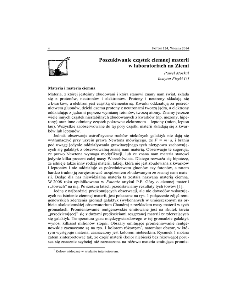 FOTON 124, Wiosna 2014 4 Poszukiwanie cząstek ciemnej materii w laboratoriach na Ziemi Paweł Moskal Instytut Fizyki UJ Materia i materia ciemna Materia, z której jesteśmy zbudowani i która stanowi znany nam świat, składa się z protonów, neutronów i elektronów. Protony i neutrony składają się z kwarków, a elektron jest cząstką elementarną. Kwarki oddziałują za pośrednictwem gluonów, dzięki czemu protony z neutronami tworzą jądra, a elektrony oddziałując z jądrami poprzez wymianę fotonów, tworzą atomy. Znamy jeszcze wiele innych cząstek niestabilnych zbudowanych z kwarków (np. mezony, hiperony) oraz inne odmiany cząstek pokrewne elektronom – leptony (mion, lepton tau). Wszystkie zaobserwowane do tej pory cząstki materii składają się z kwarków lub leptonów. Jednak obserwacje astrofizyczne ruchów niektórych galaktyk nie dają się wytłumaczyć przy użyciu prawa Newtona mówiącego, że F = m · a, i braniu pod uwagę jedynie oddziaływania grawitacyjnego tych nietypowo zachowujących się galaktyk z obserwowalną znaną nam materią. Obserwacje te sugerują, że prawo Newtona wymaga modyfikacji, lub że znana nam materia stanowi jedynie kilka procent całej masy Wszechświata. Dlatego rozważa się hipotezę, że istnieje także inny rodzaj materii, takiej, która nie jest zbudowana z kwarków i leptonów i nie oddziałuje za pośrednictwem gluonów czy fotonów, a zatem bardzo trudno ją zarejestrować urządzeniem zbudowanym ze znanej nam materii. Będąc dla nas niewidzialną materia ta została nazwana materią ciemną. W 2008 roku opublikowano w Fotonie artykuł P.F. Góry o ciemnej materii i „łowach” na nią. Po sześciu latach przedstawiamy rezultaty tych łowów [1]. Jedną z najbardziej przekonujących obserwacji, ale nie dowodów wskazujących na istnienie ciemnej materii, jest pokazane na rys. 1 połączenie zdjęć rentgenowskich zderzenia gromad galaktyk (wykonanych w umieszczonym na orbicie okołoziemskiej obserwatorium Chandra) z rozkładem masy materii w tych gromadach. Promieniowanie rentgenowskie emitowane jest na skutek tarcia „przedzierającej” się z dużymi prędkościami rozgrzanej materii ze zderzających się galaktyk. Temperatura gazu międzygwiazdowego w tej gromadzie galaktyk wynosi kilkaset milionów stopni. Obszary emitujące promieniowanie rentgenowskie zaznaczone są na rys. 1 kolorem różowym*, natomiast obszar, w którym występuje materia, zaznaczony jest kolorem niebieskim. Rysunek 1 można zatem zinterpretować tak, że część materii (kolor niebieski bez różowego) porusza się znacznie szybciej niż zaznaczona na różowo materia emitująca promie* Kolory widoczne w wydaniu internetowym. FOTON 124, Wiosna 2014 5 niowanie rentgenowskie, która na skutek tarcia porusza się wolniej. Dlatego niebieskie obszary, być może odpowiadające ciemnej materii, oddaliły się od siebie dalej niż różowe. Rys. 1. Obraz dwóch zderzających się gromad galaktyk, które utworzyły gromadę zwaną „Gromada Pocisk” o numerze 1E0657-558. Obserwacji dokonano w obserwatorium satelitarnym Chandra (chandra.harvard.edu). Kolorem niebieskim zaznaczono obszar, w którym wykryto materię na podstawie analizy zakrzywienia trajektorii fotonów, a na różowo – obszar, z którego emitowane jest promieniowanie rentgenowskie. Istnienie materii niezależnie od jej rodzaju można odkryć poprzez jej oddziaływanie grawitacyjne na przelatujące fotony powodujące zakrzywianie ich trajektorii. Wszystko, co istnieje, oddziałuje grawitacyjnie, nawet fotony. Fotony oddziałują grawitacyjnie, ponieważ posiadają energię, a energia jest równoważna masie. Zjawiska przemiany energii w masę i odwrotnie obserwuje się obecnie na co dzień w laboratoriach takich jak CERN, gdzie na przykład rejestruje się rozpady wytwarzanych tam cząstek na wysokoenergetyczne fotony Jak ciemna materia może wywołać sygnał w urządzeniach zbudowanych ze zwyczajnej materii, z którą nie oddziałuje? Problem ten wydaje się nierozwiązywalny i nieco z przymrużeniem oka można by go porównać do typowych filozoficznych problemów rozważanych na przykład przez Kartezjusza (René Descartesa) i księżniczkę Elżbietę w ich bogatej korespondencji z pierwszej połowy XVII wieku [2]. W liście do Kartezjusza z dnia 10 czerwca 1643 roku księżniczka Elżbieta pyta: Jak nierozciągła i niematerialna dusza może wpływać na ruch materialnego ciała? Kartezjusz, człowiek wielkiego umysłu i godny podziwu, odpisał księżniczce Elżbiecie 28 czerwca 1643 roku, ale niestety strasznie się gmatwał w swoich słabo prze- 6 FOTON 124, Wiosna 2014 konujących wyjaśnieniach i księżniczka wracała do tego tematu jeszcze kilka razy. Ostatecznie Kartezjusz napisał dla księżniczki rozprawę zatytułowaną Namiętności duszy [3], w której starał się wyjaśnić, jak niematerialna dusza wpływa na materialne ciało. Rys. 2. Portrety księżniczki Elżbiety Czeskiej córki elektora Palatynatu Reńskiego oraz Kartezjusza. Zdjęcia i ramki są dobrane przez autora ze źródeł dostępnych w internecie Współcześni fizycy starają się dorównać Kartezjuszowi i wymyślają różne sposoby opisu oddziaływania ciemnej materii ze zwykłą. Jeden z nich polega na tym, że jeśli nawet ciemna materia nie oddziałuje z naszą materią, to może nośniki oddziaływania mogą się z sobą „komunikować”. To znaczy być może, iż foton, który jest nośnikiem oddziaływania elektromagnetycznego, jest na tyle podobny do ciemnego fotonu, wywołującego oddziaływanie między cząstkami ciemnej materii, że mogą się z sobą „wymieniać”. Dlatego jednym ze sposobów poszukiwania sygnałów od ciemnej materii jest badanie takich zjawisk, w których foton mógłby się zamienić na ciemny foton. Tak na przykład może się zdarzać w procesie rozpadu mezonów (mezony to cząstki zbudowane z kwarku i antykwarku, które nieustannie powstają w wy