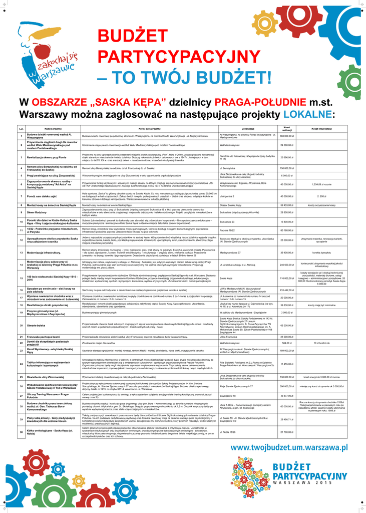 BUDŻET PARTYCYPACYJNY – TO TWÓJ BUDŻET! W OBSZARZE „SASKA KĘPA” dzielnicy PRAGA-POŁUDNIE m.st. Warszawy można zagłosować na następujące projekty LOKALNE: L.p. Nazwa projektu Krótki opis projektu Lokalizacja Koszt realizacji Koszt eksploatacji 1 Budowa ścieżki rowerowej wzdłuż Al. Waszyngtona Budowa ścieżki rowerowej po północnej stronie Al.. Waszyngtona, na odcinku Rondo Waszyngtonqa - ul. Międzynarodowa Al.Waszyngtona, na odcinku Rondo Waszyngtona - ul. Międzynarodowa 383 000,00 zł 2 Przywrócenie ciągłości drogi dla rowerów wzdłuż Wału Miedzeszyńskiego pod mostem Poniatowskiego Udrożnienie ciągu pieszo-rowerowego wzdłuż Wału Miedzeszyńskiego pod mostem Poniatowskiego Wał Miedzeszyński 24 000,00 zł 3 Rewitalizacja skweru przy Plonie Projekt ma na celu uporządkowanie przestrzeni miejskiej wokół płaskorzeźby „Plon”, która w 2011r. została poddana konserwacji dzięki staraniom mieszkańców i władz dzielnicy. Dotyczy rekonstrukcji dwóch betonowych ław z 1947 r., istniejących w tym, miejscu do tat 70. XX w. oraz aranżacji zieleni – nasadzeniu drzew, krzewów i rekultywacji trawnika Narożnik ulic Katowickiej i Zwycięzców (przy budynku nr 11) 25 696,00 zł 4 Remont ulicy Berezyńskiej na odcinku od Francuskiej do Saskiej Remont ulicy Berezyńskiej na odcinku od ul. Francuskiej do ul. Saskiej ul. Berezyńska 150 000,00 zł 5 Progi zwalniające na ulicy Złoczowskiej Wykonanie progów zwalniających na ulicy Złoczowskiej w celu ograniczenia prędkości pojazdów Ulica Złoczowska na całej długości od ulicy Brukselskiej do ulicy Alzackiej 6 000,00 zł 6 Zagospodarowanie skweru z rzeźbą kompozycją metalową "Ad Astra" na Saskiej Kępie Przywrócenie funkcji użytkowych i wizualnych małego skweru na którym znajduję się monumentalna kompozycja metalowa „AS ASTRA” znakomitego rzeźbiarza prof.. Macieja Szańkowskiego z roku 1974, na terenie Osiedla Saska Kępa skrzyżowanie ulic: Egipska, Afrykańska, Bora Komorowskiego 43 000,00 zł 1,254,09 zł rocznie 7 Pomóż nam daleko zajść Hala sportowa „Saska” to główny ośrodek sportu na Saskiej Kępie. Co roku mieszkańcy przebiegają i przechodzą ponad 30,000 km na dostępnych w hali urządzeniach. Zakup dwóch nowych, profesjonalnych urządzeń – bieżni oraz stepera, to tysiące kroków w kierunku zdrowia i dobrego samopoczucia. Warto zainwestować w to każdą złotówkę ul.Angorska 2 40 000,00 zł 2. 200 zł 8 Montaż koszy na śmieci na Saskiej Kępie Montaż koszy na śmieci na terenie Saskiej Kępy Obszar Saskiej Kępy 59 433,00 zł koszty oczyszczania koszy 9 Skwer Rodzinny Zagospodarowanie placu przy ul. Brukselskiej (między posesjami Brukselska 46 a 44a) poprzez utworzenie skweru dla mieszkańców w celu stworzenia przyjaznego miejsca dla odpoczynku i relaksu rodzinnego. Projekt uwzględnia mieszkańców w każdym wieku. Brukselska (między posesją 46 a 44a) 28 800,00 zł 10 Poranki dla dzieci w Klubie Kultury Saska Kępa - filmy i zajęcia edukacyjno-kulturalne Sobotni (lub niedzielny) poranek to doskonały czas aby udać się z dzieciakami na poranek – film a potem zajęcia edukacyjne – muzyczne plastyczne i animacyjne a Klub Saska Kępa to idealne miejsce żeby takie poranki organizować. Brukselska 23 13 800,00 zł 11 18/22 - Podwórko przyjazne mieszkańcom, ul Paryska Remont drogi, chodników oraz wytyczenie miejsc parkingowych, które nie kolidują z ciągami komunikacyjnymi; poprawienie infrastruktury podwórka poprzez ustawienie ławki i kosza na psie odchody Paryska 18/22 80 168,00 zł 12 Uporządkowane okolice przystanku Saska wraz założeniem trawnika Jeden z najczęściej uczęszczanych przystanków na saskiej Kępie, który powinien być wizytówką naszej dzielnicy wyglada brzydko: rozjeżdżona ziemia, kałuże, błoto, pod kładką stojąca woda. Zmieńmy to uporządkujmy teren, załóżmy trawnik, stwórzmy z tego miejsca prawdziwą wizytówkę Teren pod kładką i w okolicy przystanku, ulice Saska /Al. Stanów Zjednoczonych 25 000,00 zł Utrzymanie trawnika, renowacja barierki, sprzątanie 13 Modernizacja infrastruktury. Remont altany śmieciowej murowanej – tynki, malowanie, gres, brak altany na gabaryty. Estetyka, wizerunek miasta. Piaskownica – dla dzieci, ogrodzenie , krzewy. Trawnik wokół budynku – rekultywacja – przywóz ziemi, równanie podłoża. Posadzenie żywopłotu na brzegu trawnika i jego ogrodzenie. Dosadzenie pięciu lip od podwórza/ w latach 80 było ławek 26 Międzynarodowa 37 39 400,00 zł korekta żywopłotu 14 Modernizacja placu zabaw przy ul. Arabskiej w dzielnicy Praga Południe m.st. Warszawy Istniejący plac zabaw, usytuowany u zbiegu ul. Ateńskiej i Arabskiej, jest jedynym większym placem zabaw w tej okolicy Pragi Południe, jednocześnie jego stan techniczny oraz estetyczny nie spełnia obecnych wymogów i standardów. Proponuję modernizację ww. placu zabaw. Ul. Arabska u zbiegu z ul. Ateńską 246 500,00 zł konieczność utrzymania wysokiej jakości infrastruktury 15 100 lecie stołeczności Saskiej Kępy 1916 2016 Przygotowanie i przeprowadzenie obchodów 100 lecia administracyjnego przyłączenia Saskiej Kępy do m.st. Warszawy. Działania polegać będą między innymi na powołaniu Komitetu Obchodów, przyjęcie i realizację programu kulturalnego, edukacyjnego, działalności wydawniczej, spotkań i sympozjum, konkursów, wystaw artystycznych, ufundowanie tablic i medali pamiątkowych Saska Kępa 116 000,00 zł koszty wynajęcie sal i obsługi technicznej uroczystości, materiały biurowe, usługi księgowo – administracyjne i porządkowe. 20 000,00 Okolicznościowy periodyk Saska Kępa 6 000,00 16 Sprzątam po swoim psie - sieć koszy na psie odchody Sieć koszy na psie odchody wraz z zasobnikiem na zestawy higieniczne (papierowa torebka z łopatką) ul.Wał Miedzeszyński/Al. Waszyngtona/ Międzynarodowa /Al. Stanów Zjednoczonych 233 442,00 zł 17 Wymiana nawierzchni chodni