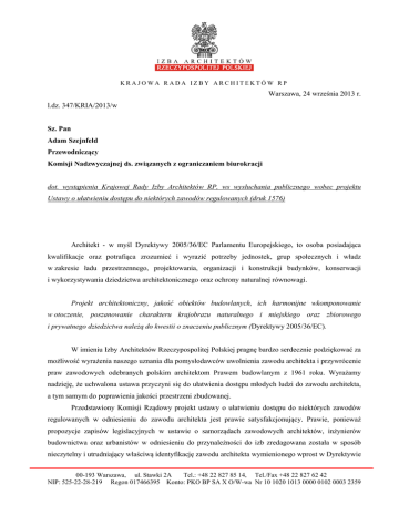 KRAJOWA RADA IZBY ARCHITEKTÓW RP Warszawa, 24 września 2013 r. l.dz. 347/KRIA/2013/w Sz. Pan Adam Szejnfeld Przewodniczący Komisji Nadzwyczajnej ds. związanych z ograniczaniem biurokracji dot. wystąpienia Krajowej Rady Izby Architektów RP, ws wysłuchania publicznego wobec projektu Ustawy o ułatwieniu dostępu do niektórych zawodów regulowanych (druk 1576) Architekt - w myśl Dyrektywy 2005/36/EC Parlamentu Europejskiego, to osoba posiadająca kwalifikacje oraz potrafiąca zrozumieć i wyrazić potrzeby jednostek, grup społecznych i władz w zakresie ładu przestrzennego, projektowania, organizacji i konstrukcji budynków, konserwacji i wykorzystywania dziedzictwa architektonicznego oraz ochrony naturalnej równowagi. Projekt architektoniczny, jakość obiektów budowlanych, ich harmonijne wkomponowanie w otoczenie, poszanowanie charakteru krajobrazu naturalnego i miejskiego oraz zbiorowego i prywatnego dziedzictwa należą do kwestii o znaczeniu publicznym (Dyrektywy 2005/36/EC). W imieniu Izby Architektów Rzeczypospolitej Polskiej pragnę bardzo serdecznie podziękować za możliwość wyrażenia naszego uznania dla pomysłodawców uwolnienia zawodu architekta i przywrócenie praw zawodowych odebranych polskim architektom Prawem budowlanym z 1961 roku. Wyrażamy nadzieję, że uchwalona ustawa przyczyni się do ułatwienia dostępu młodych ludzi do zawodu architekta, a tym samym do poprawienia jakości przestrzeni zbudowanej. Przedstawiony Komisji Rządowy projekt ustawy o ułatwieniu dostępu do niektórych zawodów regulowanych w odniesieniu do zawodu architekta jest prawie satysfakcjonujący. Prawie, ponieważ propozycje zapisów legislacyjnych w ustawie o samorządach zawodowych architektów, inżynierów budownictwa oraz urbanistów w odniesieniu do przynależności do izb zredagowana została w sposób nieczytelny i utrudniający właściwą identyfikację zawodu architekta wymienionego wprost w Dyrektywie 00-193 Warszawa, ul. Stawki 2A Tel.: +48 22 827 85 14, Tel./Fax +48 22 827 62 42 NIP: 525-22-28-219 Regon 017466395 Konto: PKO BP SA X O/W-wa Nr 10 1020 1013 0000 0102 0003 2359 KRAJOWA RADA IZBY ARCHITEKTÓW RP UE. Vide propozycje nowej redakcji art. 5 ustawy samorządowej, którego nieczytelny zapis okazał się nawet dla nas za skomplikowany, a w związku z czym w przesłanej naszej propozycji redakcji treści art. 5 w „Formularzu zgłoszeniowym” wkradł się błąd, skutkiem czego przez zupełny przypadek IARP zrzeszałaby osoby po ukończeniu studiów na kierunku inżynieria środowiska. Proponujemy przyjęcie czystego języka literalnego brzmienia art. 5, który eliminuje jakiekolwiek wątpliwości co do zrzeszania architektów i inżynierów budownictwa we właściwych izbach, w następującej treści: 1. Izba architektów zrzesza osoby: 1) posiadające uprawnienia budowlane w specjalnościach, dla uzyskania których wymagane jest ukończenia studiów na kierunku architektura, w zakresie określonym w art. 14 ust. 3 Prawo budowlane. 2. Izba inżynierów budownictwa zrzesza osoby: 1) posiadające uprawnienia budowlane w specjalnościach, dla uzyskania których wymagane jest posiadanie wykształcenia innego niż wymienione w ust. 1 pkt. 1, w zakresie określonym w art. 14 ust. 3 Prawo budowlane. 2) uchylony Powyższe ma na celu wyeliminowanie błędu ustawodawczego polegającego na tym, iż architekci, którzy wykonują ograniczone uprawnienia w specjalności konstrukcyjno – budowlanej nie należą zgodnie z propozycją ustawy o samorządach zawodowych architektów, inżynierów budownictwa i urbanistów do Izby Architektów RP (dalej jako „IARP”), lecz do Polskiej Izby Inżynierów Budownictwa (dalej jako „PIIB”), w sytuacji gdy wszyscy inżynierowie budownictwa należą do Polskiej Izby Inżynierów Budownictwa, nawet jeżeli wykonują ograniczone uprawnienia w specjalności architektonicznej. Jest to asymetria niczym nieuzasadniona, a przekazanie architektów do IARP, którzy w tej chwili muszą przynależeć do PIIB uporządkowałoby i ustanowiło przejrzyste zasady podziału przynależności do właściwej Izby zgodne z art. 17 Konstytucji, mówiącym, iż każdy samorząd powinien reprezentować określony zawód zaufania publicznego. Innymi słowy, jeżeli architekt posiada ograniczone uprawnienia do projektowania konstrukcji budowlanych powinien przynależeć do Izby Architektów RP, tak samo (per analogiam) inżynier budownictwa, który wykonując uprawnienia budowlane ograniczone do projektowania i kierowania robotami budowlanymi w specjalności architektonicznej zgodnie z projektem przynależy do Polskiej Izby Inżynierów Budownictwa. Byłoby to również zbieżne z uzasadnieniem projektu ustawy deregulacyjnej, część pierwsza, strona 40 dotyczącym konieczności likwidacji podwójnej przynależności. strona 2 KRAJOWA RADA IZBY ARCHITEKTÓW RP Potwierdzenie powyższego znajduje odzwierciedlenie w Raporcie z badania stanu konkurencji w krajowym sektorze usług profesjonalnych ARCHITEKT, INŻYNIER BUDOWLANY Urząd Ochrony Konkurencji i Konsumentów Departament Analiz Rynku Kwiecień 2010 Stosunki konkurencyjne pomiędzy zawodami architekta i inżyniera można scharakteryzować w następujący sposób: w przypadku projektowania architektonicznego architekci posiadają konkurencję w postaci inżynierów budowlanych z ograniczonymi uprawnieniami w specjalności architektonicznej w segmencie sporządzania projektów architektonicznych o kubaturze do 1000 m3 na terenie zabudowy zagrodowej. W segmencie usług projektowania w odniesieniu do konstrukcji obiektu o kubaturze do 1000 m3 inżynierowie budowlani, posiadający pełne uprawnienia w specjalności konstrukcyjno-budowlanej, napotykają dodatkową konkurencję w postaci inżynierów budowlanych, którzy posiadają ograniczone uprawnienia w tej specjalności. W pakiecie deregulacyjnym znajduje się również projekt Rozporządzenia w sprawie samodzielnych funkcji technicznych w budownic