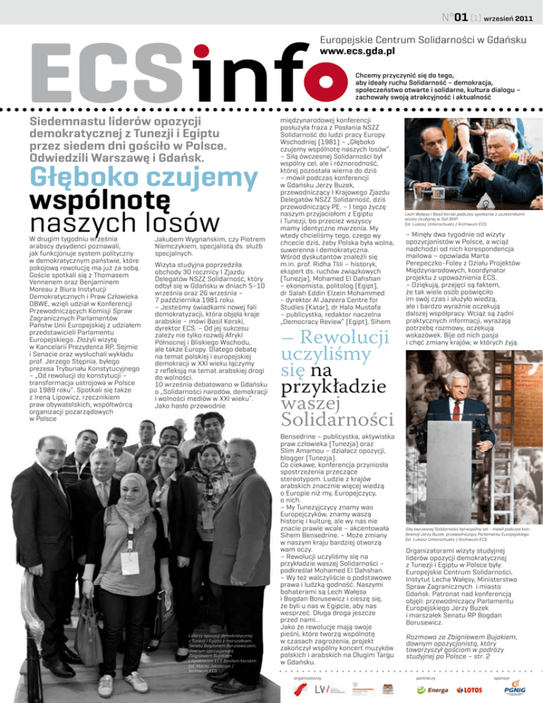 N°01 (1) wrzesień 2011 ECS Europejskie Centrum Solidarności w Gdańsku www.ecs.gda.pl Chcemy przyczynić się do tego, aby ideały ruchu Solidarność – demokracja, społeczeństwo otwarte i solidarne, kultura dialogu – zachowały swoją atrakcyjność i aktualność Siedemnastu liderów opozycji demokratycznej z Tunezji i Egiptu przez siedem dni gościło w Polsce. Odwiedzili Warszawę i Gdańsk. Głęboko czujemy wspólnotę naszych losów W drugim tygodniu września arabscy dysydenci poznawali, jak funkcjonuje system polityczny w demokratycznym państwie, które pokojową rewolucję ma już za sobą. Goście spotkali się z Thomasem Vennenem oraz Benjaminem Moreau z Biura Instytucji Demokratycznych i Praw Człowieka OBWE, wzięli udział w Konferencji Przewodniczących Komisji Spraw Zagranicznych Parlamentów Państw Unii Europejskiej z udziałem przedstawicieli Parlamentu Europejskiego. Złożyli wizytę w Kancelarii Prezydenta RP, Sejmie i Senacie oraz wysłuchali wykładu prof. Jerzego Stępnia, byłego prezesa Trybunału Konstytucyjnego – „Od rewolucji do konstytucji – transformacja ustrojowa w Polsce po 1989 roku”. Spotkali się także z Ireną Lipowicz, rzecznikiem praw obywatelskich, współtwórcą organizacji pozarządowych w Polsce Jakubem Wygnańskim, czy Piotrem Niemczykiem, specjalistą ds. służb specjalnych. Wizyta studyjna poprzedziła obchody 30 rocznicy I Zjazdu Delegatów NSZZ Solidarność, który odbył się w Gdańsku w dniach 5–10 września oraz 26 września – 7 października 1981 roku. – Jesteśmy świadkami nowej fali demokratyzacji, która objęła kraje arabskie – mówi Basil Kerski, dyrektor ECS. – Od jej sukcesu zależy nie tylko rozwój Afryki Północnej i Bliskiego Wschodu, ale także Europy. Dlatego debatę na temat polskiej i europejskiej demokracji w XXI wieku łączymy z refleksją na temat arabskiej drogi do wolności. 10 września debatowano w Gdańsku o „Solidarności narodów, demokracji i wolności mediów w XXI wieku”. Jako hasło przewodnie Liderzy opozycji demokratycznej z Tunezji i Egiptu z marszałkiem Senatu Bogdanem Borusewiczem, dawnym opozycjonistą Zbigniewem Bujakiem i dyrektorem ECS Basilem Kerskim. fot. Maciej Jakóbczyk / Archiwum ECS międzynarodowej konferencji posłużyła fraza z Posłania NSZZ Solidarność do ludzi pracy Europy Wschodniej (1981) – „Głęboko czujemy wspólnotę naszych losów”. – Siłą ówczesnej Solidarności był wspólny cel, ale i różnorodność, której pozostała wierna do dziś – mówił podczas konferencji w Gdańsku Jerzy Buzek, przewodniczący I Krajowego Zjazdu Delegatów NSZZ Solidarność, dziś przewodniczący PE. – I tego życzę naszym przyjaciołom z Egiptu i Tunezji, bo przecież wszyscy mamy identyczne marzenia. My wtedy chcieliśmy tego, czego wy chcecie dziś, żeby Polska była wolna, suwerenna i demokratyczna. Wśród dyskutantów znaleźli się m.in. prof. Ridha Tlili – historyk, ekspert ds. ruchów związkowych (Tunezja), Mohamed El Dahshan – ekonomista, politolog (Egipt), dr Salah Eddin Elzein Mohammed - dyrektor Al Jazeera Centre for Studies (Katar), dr Hala Mustafa – publicystka, redaktor naczelna „Democracy Review” (Egipt), Sihem – Rewolucji uczyliśmy się na przykładzie waszej Solidarności Bensedrine – publicystka, aktywistka praw człowieka (Tunezja) oraz Slim Amamou – działacz opozycji, blogger (Tunezja). Co ciekawe, konferencja przyniosła spostrzeżenia przeczące stereotypom. Ludzie z krajów arabskich znacznie więcej wiedzą o Europie niż my, Europejczycy, o nich. – My Tunezyjczycy znamy was Europejczyków, znamy waszą historię i kulturę, ale wy nas nie znacie prawie wcale – akcentowała Sihem Bensedrine. – Może zmiany w naszym kraju bardziej otworzą wam oczy. – Rewolucji uczyliśmy się na przykładzie waszej Solidarności – podkreślał Mohamed El Dahshan. – Wy też walczyliście o podstawowe prawa i ludzką godność. Naszymi bohaterami są Lech Wałęsa i Bogdan Borusewicz i cieszę się, że byli u nas w Egipcie, aby nas wesprzeć. Długa droga jeszcze przed nami… Jako że rewolucje mają swoje pieśni, które tworzą wspólnotę w czasach zagrożenia, projekt zakończył wspólny koncert muzyków polskich i arabskich na Długim Targu w Gdańsku. organizatorzy Lech Wałęsa i Basil Kerski podczas spotkania z uczestnikami wizyty studyjnej w Sali BHP. fot. Łukasz Unterschuetz / Archiwum ECS – Minęły dwa tygodnie od wizyty opozycjonistów w Polsce, a wciąż nadchodzi od nich korespondencja mailowa – opowiada Marta Perepeczko-Foley z Działu Projektów Międzynarodowych, koordynator projektu z upoważnienia ECS. – Dziękują, przejęci są faktem, że tak wiele osób poświęciło im swój czas i służyło wiedzą, ale i bardzo wyraźnie oczekują dalszej współpracy. Wciąż są żądni praktycznych informacji, wyrażają potrzebę rozmowy, oczekują wskazówek. Bije od nich pasja i chęć zmiany krajów, w których żyją. Siłą ówczesnej Solidarności był wspólny cel - mówił podczas konferencji Jerzy Buzek, przewodniczący Parlamentu Europejskiego. fot. Łukasz Unterschuetz / Archiwum ECS Organizatorami wizyty studyjnej liderów opozycji demokratycznej z Tunezji i Egiptu w Polsce były: Europejskie Centrum Solidarności, Instytut Lecha Wałęsy, Ministerstwo Spraw Zagranicznych i miasto Gdańsk. Patronat nad konferencją objęli: przewodniczący Parlamentu Europejskiego Jerzy Buzek i marszałek Senatu RP Bogdan Borusewicz. Rozmowa ze Zbigniewem Bujakiem, dawnym opozycjonistą, który towarzyszył gościom w podróży studyjnej po Polsce – str. 2 partnerzy sponsor 2 N°01 (1) wrzesień 2011 Kalendarz sierpniowy 31 rocznica podpisania Porozumień Sierpniowych Prezydent Bronisław Komorowski, Lech Wałęsa i wielu gdańszczan 31 sierpnia złożyli kwiaty i zapalili znicze pod pomnikiem Poległych Stoczniowców i Bramą nr 2. Tradycyjnie, w rocznicę podpisania Porozum