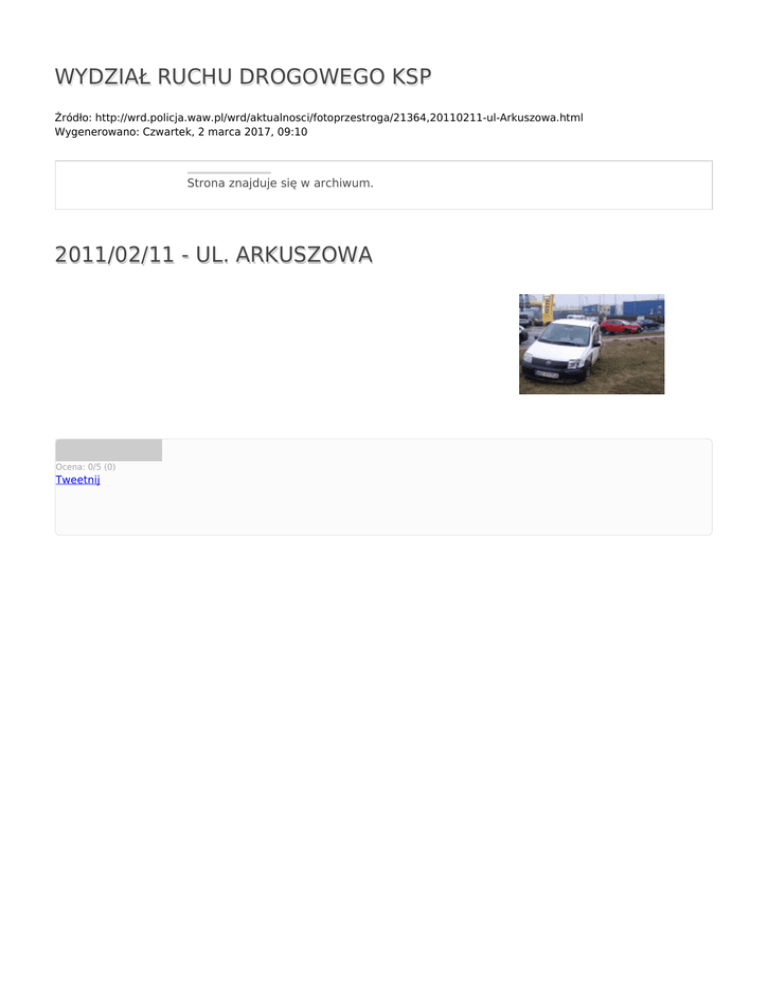 WYDZIAŁ RUCHU DROGOWEGO KSP Źródło: http://wrd.policja.waw.pl/wrd/aktualnosci/fotoprzestroga/21364,20110211-ul-Arkuszowa.html Wygenerowano: Czwartek, 2 marca 2017, 09:10 Strona znajduje się w archiwum. 2011/02/11 - UL. ARKUSZOWA Ocena: 0/5 (0) Tweetnij
