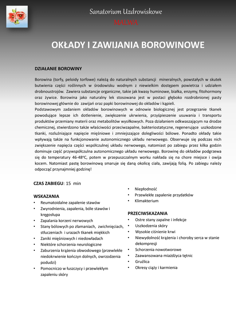 Sanatorium Uzdrowiskowe MALWA OKŁADY I ZAWIJANIA BOROWINOWE DZIAŁANIE BOROWINY Borowina (torfy, peloidy torfowe) należą do naturalnych substancji mineralnych, powstałych w skutek butwienia części roślinnych w środowisku wodnym z niewielkim dostępem powietrza i udziałem drobnoustrojów. Zawiera substancje organiczne, takie jak kwasy huminowe, białka, enzymy, fitohormony oraz żywice. Borowina jako naturalny lek stosowana jest w postaci głęboko rozdrobnionej pasty borowinowej głównie do zawijań oraz papki borowinowej do okładów i kąpieli. Podstawowym zadaniem okładów borowinowych w odnowie biologicznej jest przegrzanie tkanek powodujące lepsze ich dotlenienie, zwiększenie ukrwienia, przyśpieszenie usuwania i transportu produktów przemiany materii oraz metabolitów wysiłkowych. Poza działaniem odkwaszającym na drodze chemicznej, stwierdzono także właściwości przeciwzapalne, bakteriostatyczne, regenerujące uszkodzone tkanki, rozluźniające napięcie mięśniowe i zmniejszające dolegliwości bólowe. Ponadto okłady takie wpływają także na funkcjonowanie autonomicznego układu nerwowego. Obserwuje się podczas nich zwiększenie napięcia części współczulnej układu nerwowego, natomiast po zabiegu przez kilka godzin dominuje część przywspółczulna autonomicznego układu nerwowego. Borowinę do okładów podgrzewa się do temperatury 46-48oC, potem w przepuszczalnym worku nakłada się na chore miejsce i owija kocem. Natomiast pastę borowinową smaruje się daną okolicę ciała, zawijają folią. Po zabiegu należy odpocząć przynajmniej godzinę! CZAS ZABIEGU: 15 min WSKAZANIA • • • • • • • • Reumatoidalne zapalenie stawów Zwyrodnienia, zapalenia, bóle stawów i kręgosłupa Zapalania korzeni nerwowych Stany bólowych po złamaniach, zwichnięciach, stłuczeniach i urazach tkanek miękkich Zaniki mięśniowych i niedowładach Niektóre schorzenia neurologiczne Zaburzenia krążenia obwodowego (przewlekłe niedokrwienie kończyn dolnych, owrzodzenia podudzi) Pomocniczo w łuszczycy i przewlekłym zapaleniu skóry • • • Niepłodność Przewlekłe zapalenie przydatków Klimakterium PRZECIWSKAZANIA • • • • • • • • Ostre stany zapalne i infekcje Uszkodzenia skóry Wysokie ciśnienie krwi Niewydolność krążenia i choroby serca w stanie dekompresji Schorzenia nowotworowe Zaawansowana miażdżyca tętnic Gruźlica Okresy ciąży i karmienia