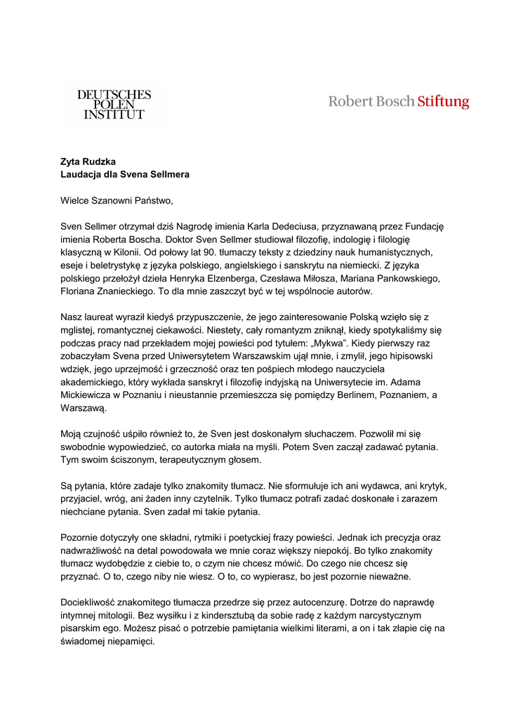 Zyta Rudzka Laudacja dla Svena Sellmera Wielce Szanowni Państwo, Sven Sellmer otrzymał dziś Nagrodę imienia Karla Dedeciusa, przyznawaną przez Fundację imienia Roberta Boscha. Doktor Sven Sellmer studiował filozofię, indologię i filologię klasyczną w Kilonii. Od połowy lat 90. tłumaczy teksty z dziedziny nauk humanistycznych, eseje i beletrystykę z języka polskiego, angielskiego i sanskrytu na niemiecki. Z języka polskiego przełożył dzieła Henryka Elzenberga, Czesława Miłosza, Mariana Pankowskiego, Floriana Znanieckiego. To dla mnie zaszczyt być w tej wspólnocie autorów. Nasz laureat wyraził kiedyś przypuszczenie, że jego zainteresowanie Polską wzięło się z mglistej, romantycznej ciekawości. Niestety, cały romantyzm zniknął, kiedy spotykaliśmy się podczas pracy nad przekładem mojej powieści pod tytułem: „Mykwa”. Kiedy pierwszy raz zobaczyłam Svena przed Uniwersytetem Warszawskim ujął mnie, i zmylił, jego hipisowski wdzięk, jego uprzejmość i grzeczność oraz ten pośpiech młodego nauczyciela akademickiego, który wykłada sanskryt i filozofię indyjską na Uniwersytecie im. Adama Mickiewicza w Poznaniu i nieustannie przemieszcza się pomiędzy Berlinem, Poznaniem, a Warszawą. Moją czujność uśpiło również to, że Sven jest doskonałym słuchaczem. Pozwolił mi się swobodnie wypowiedzieć, co autorka miała na myśli. Potem Sven zaczął zadawać pytania. Tym swoim ściszonym, terapeutycznym głosem. Są pytania, które zadaje tylko znakomity tłumacz. Nie sformułuje ich ani wydawca, ani krytyk, przyjaciel, wróg, ani żaden inny czytelnik. Tylko tłumacz potrafi zadać doskonałe i zarazem niechciane pytania. Sven zadał mi takie pytania. Pozornie dotyczyły one składni, rytmiki i poetyckiej frazy powieści. Jednak ich precyzja oraz nadwrażliwość na detal powodowała we mnie coraz większy niepokój. Bo tylko znakomity tłumacz wydobędzie z ciebie to, o czym nie chcesz mówić. Do czego nie chcesz się przyznać. O to, czego niby nie wiesz. O to, co wypierasz, bo jest pozornie nieważne. Dociekliwość znakomitego tłumacza przedrze się przez autocenzurę. Dotrze do naprawdę intymnej mitologii. Bez wysiłku i z kindersztubą da sobie radę z każdym narcystycznym pisarskim ego. Możesz pisać o potrzebie pamiętania wielkimi literami, a on i tak złapie cię na świadomej niepamięci. Jeżeli jest tak, że literatura to sztuka stawiania pytań, to spotkanie ze znakomitym tłumaczem jest momentem, kiedy pisarz czuje się zmuszony, by na te swoje pytania odpowiedzieć. Pytania tłumacza pracują w umyśle pisarza. Wywołują szczególny stan uważności. Mają wpływ na przeorganizowanie pisarskiego instrumentarium i bestiarium. Dialog ze Svenem przeniósł się na mój wewnętrzny monolog pisarki. Byłam przekonana, że moja proza jest fikcyjna. Ale pytania Svena tak bardzo rezonowały w mojej świadomości, że w końcu musiałam się przyznać, że moja wyobraźnia jest w dużym stopniu autobiograficzna. To odkrycie nie było łatwe. Ta wiwisekcja na nowo ustawiała mnie w pisarskim mocowaniu się z formą i treścią. Zmieniała punkt patrzenia. Przywołała inne doświadczenia. Wydobyła inne tony, szlifowała sygnaturę pisarską. Mówiąc wprost: dociekliwość Svena zapędziła mnie w kozi róg. Nie mogłam się z niego inaczej wydostać, jak tylko czepiając się słów. Zaczęłam pisać nową powieść. Wiem, że znakomity tłumacz nie tylko zajmuje się tym, co już zostało napisane, ale jego twórcza obecność w życiu pisarza ma tajemniczy wpływ na to, co dopiero będzie napisane. Tak się stało dzięki spotkaniu ze Svenem. Dziękuję Ci, mój znakomity tłumaczu. Świadectwa czytelników „Mykwy” za każdym razem uświadamiają mi skalę twojego translatorskiego talentu. Losy nastoletniej Żydówki u schyłku komunistycznej Polski, wielu dorastających w NRD uznało za swoją powieść o dojrzewaniu, bildungsroman. Pragnę podziękować szanownej Kapitule Nagrody pod honorowym patronatem Karla Dedeciusa za docenienie translatorskiej twórczości Svena Sellmera. To dla mnie szczególny i szczęśliwy dzień. Dziękuję!