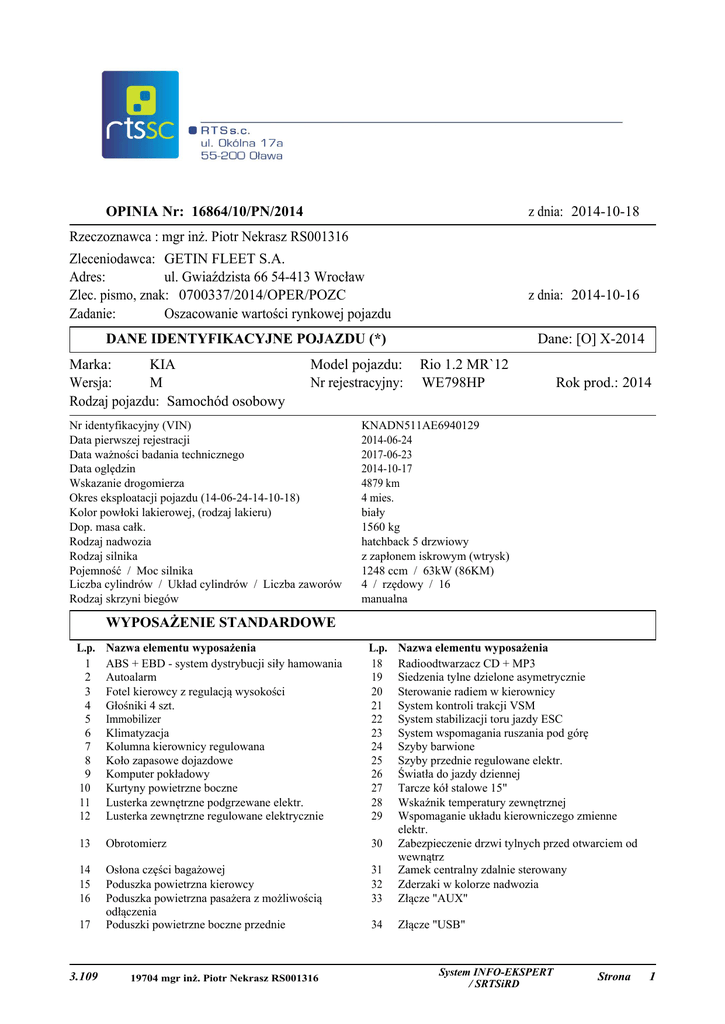 OPINIA Nr: 16864/10/PN/2014 z dnia: 2014-10-18 Rzeczoznawca : mgr inż. Piotr Nekrasz RS001316 Zleceniodawca: GETIN FLEET S.A. Adres: ul. Gwiaździsta 66 54-413 Wrocław Zlec. pismo, znak: 0700337/2014/OPER/POZC Zadanie: Oszacowanie wartości rynkowej pojazdu z dnia: 2014-10-16 DANE IDENTYFIKACYJNE POJAZDU (*) Marka: KIA Wersja: M Rodzaj pojazdu: Samochód osobowy Dane: [O] X-2014 Model pojazdu: Nr rejestracyjny: Nr identyfikacyjny (VIN) Data pierwszej rejestracji Data ważności badania technicznego Data oględzin Wskazanie drogomierza Okres eksploatacji pojazdu (14-06-24-14-10-18) Kolor powłoki lakierowej, (rodzaj lakieru) Dop. masa całk. Rodzaj nadwozia Rodzaj silnika Pojemność / Moc silnika Liczba cylindrów / Układ cylindrów / Liczba zaworów Rodzaj skrzyni biegów Rio 1.2 MR`12 WE798HP Rok prod.: 2014 KNADN511AE6940129 2014-06-24 2017-06-23 2014-10-17 4879 km 4 mies. biały 1560 kg hatchback 5 drzwiowy z zapłonem iskrowym (wtrysk) 1248 ccm / 63kW (86KM) 4 / rzędowy / 16 manualna WYPOSAŻENIE STANDARDOWE L.p. 1 2 3 4 5 6 7 8 9 10 11 12 Nazwa elementu wyposażenia ABS + EBD - system dystrybucji siły hamowania Autoalarm Fotel kierowcy z regulacją wysokości Głośniki 4 szt. Immobilizer Klimatyzacja Kolumna kierownicy regulowana Koło zapasowe dojazdowe Komputer pokładowy Kurtyny powietrzne boczne Lusterka zewnętrzne podgrzewane elektr. Lusterka zewnętrzne regulowane elektrycznie L.p. 18 19 20 21 22 23 24 25 26 27 28 29 13 Obrotomierz 30 14 15 16 Osłona części bagażowej Poduszka powietrzna kierowcy Poduszka powietrzna pasażera z możliwością odłączenia Poduszki powietrzne boczne przednie 31 32 33 Nazwa elementu wyposażenia Radioodtwarzacz CD + MP3 Siedzenia tylne dzielone asymetrycznie Sterowanie radiem w kierownicy System kontroli trakcji VSM System stabilizacji toru jazdy ESC System wspomagania ruszania pod górę Szyby barwione Szyby przednie regulowane elektr. Światła do jazdy dziennej Tarcze kół stalowe 15" Wskaźnik temperatury zewnętrznej Wspomaganie układu kierowniczego zmienne elektr. Zabezpieczenie drzwi tylnych przed otwarciem od wewnątrz Zamek centralny zdalnie sterowany Zderzaki w kolorze nadwozia Złącze "AUX" 34 Złącze "USB" 17 3.109 19704 mgr inż. Piotr Nekrasz RS001316 System INFO-EKSPERT / SRTSiRD Strona 1 16864/10/PN/2014 WYPOSAŻENIE DODATKOWE L.p. Nazwa elementu wyposażenia 1 +Zestaw głośnomówiący NOKIA Wartość 413 OPIS ZAMONTOWANEGO W POJEŹDZIE OGUMIENIA Koło Przednie lewe: Przednie prawe: Tylne lewe: Tylne prawe: Marka, typ *HANKOOK 185/65 *HANKOOK 185/65 *HANKOOK 185/65 *HANKOOK 185/65 R15 R15 R15 R15 88H 88H 88H 88H K 425 KINERGY ECO TL GP1 K 425 KINERGY ECO TL GP1 K 425 KINERGY ECO TL GP1 K 425 KINERGY ECO TL GP1 Bieżnik [mm] Zużycie [%] 7,5 10 7,5 10 7,5 10 7,5 10 KOREKTY WARTOŚĆ BAZOWA NETTO (0 mies.) ............................ 34 553 PLN KOREKTA ZA WYPOSAŻENIE DODATKOWE ..................... 413 PLN KOREKTA ZA PIERWSZĄ REJESTRACJĘ ......................... - 3 866 PLN KOREKTY RÓŻNE ............................................ - 1 555 PLN W tym: [%] Wartość Aktualne promocje dealerskie -5,0 -1 555 KOMENTARZ Badania technicznego dokonano w obecności zlecającego, który okazał stosowne dokumenty oraz udzielił niezbędnych informacji. Okazano dokumentację serwisową pojazdu. Brak wpisów o przeglądach. Do oszacowania przyjęto przebieg odczytany z drogomierza. Nie weryfikowano autentyczności. Odczytano numer nadwozia i potwierdzono jego zgodność z zapisem w dowodzie rejestracyjnym. Rok produkcji przyjęto na podstawie zapisu w dowodzie rejestracyjnym. W samochodzie zamontowany zestaw głośnomówiący NOKIA - załącza się, nie okazano instrukcji obsługi, nie weryfikowano poprawności działania. NADWOZIE: Grubość powłoki lakierowej na elementach zewnętrznych ok. 0,07mm co odpowiada parametrom powłoki fabrycznej. PODWOZIE: Poszczególne elementy zawieszenia wszystkich kół bez widocznych uszkodzeń. Podczas krótkiej próby drogowej wykonanej w warunkach parkingowych oraz w trakcie badania na ścieżce diagnostycznej nie stwierdzono nadmiernych luzów w układzie zawieszenia kół. Układ hamulcowy - w warunkach parkingowych nie stwierdzono nieprawidłowości w funkcjonowaniu. Poziom płynu w układzie: w normie. UKŁAD NAPĘDOWY: Silnik o zapłonie iskrowym - rozruch i praca silnika w całym zakresie obrotów prawidłowe. Poziom oleju w silniku: w normie. Poziom płynu chłodzącego: w normie. Poziom paliwa w zbiorniku: rezerwa. Skrzynia biegów manualna - nie stwierdzono nieprawidłowości w pracy podczas krótkiej próby drogowej wykonanej w warunkach parkingowych. UWAGI: Podczas oględzin stwierdzono następujące uszkodzenia i wady mające wpływ na wartość rynkową badanego pojazdu: 3.109 19704 mgr inż. Piotr Nekrasz RS001316 System INFO-EKSPERT / SRTSiRD Strona 2 16864/10/PN/2014 · · · · Tapicerka kanapy tylnej - zabrudzenia na górnej krawędzi oparcia Błotnik tylny lewy - powierzchowne otarcia lakieru na nadkolu Poprawność działania układów sterowanych elektronicznie zweryfikowano w oparciu o komunikaty wyświetlane na zestawie wskaźników na podstawie systemu autodiagnostyki pojazdu Przy oględzinach okazano dwa klucze do pojazdu z emblematem producenta pojazdu oraz wbudowanymi sterownikami centralnego zamka ZASTRZEŻENIA OGRANICZAJĄCE: · Rzeczoznawca nie bierze odpowiedzialności za wady ukryte /fizyczne i prawne/ niemożliwe do stwierdzenia metodami, którymi przeprowadzono badania i ewentualne skutki wynikające z dalszego użytkowania przedmiotu oszacowania · Niniejsze oszacowanie nie jest ekspertyzą stanu technicznego przedmiotu i za taką nie może być uznawane, nie jest także gwarancją kompletności oraz sprawności przedmiotu · Powyższe opracowanie nie może być traktowane jako gwarancja sprzedaży przedmiotu za oszacowaną wartość · Nie przeprowadzano badania prawdziwości ani poprawności danych identyfikacyjnych przedmiotu oszacowania, w tym